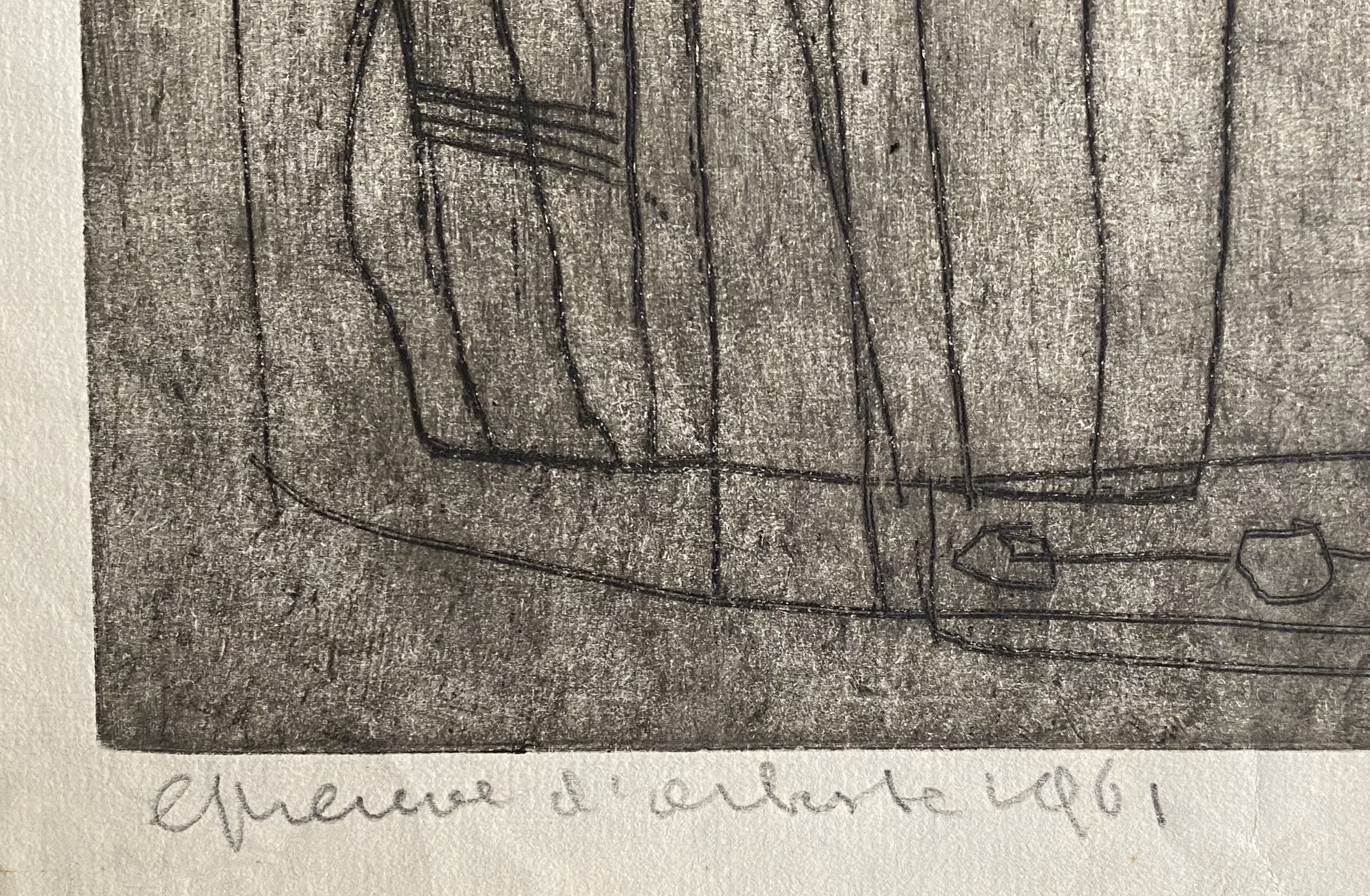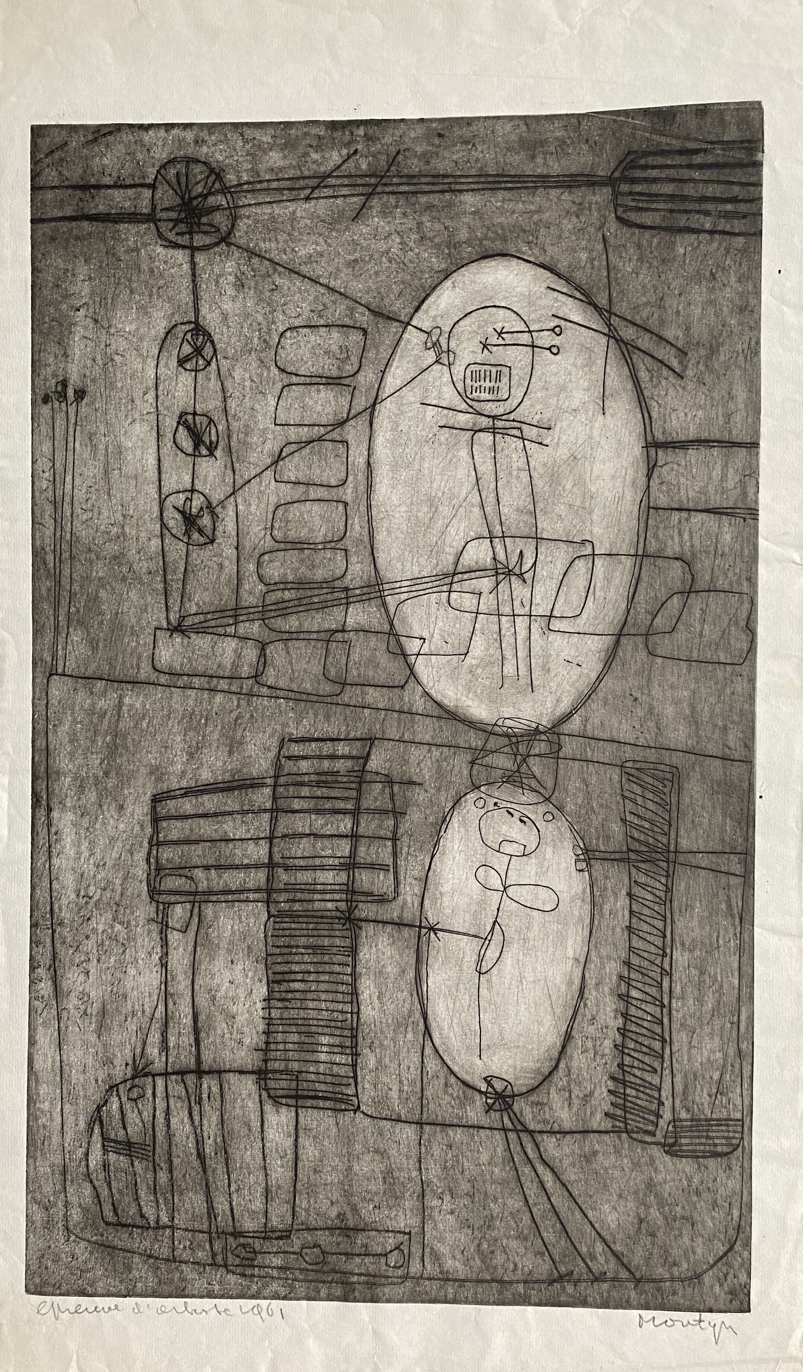 Fraai werk van Jan Montyn uit 1961 getiteld 'WIJ'. Epreuve d'artiste, uniek stuk. De ets is gedrukt op dun papier en heeft wat krinkels, maar is in goede staat. Voor een liefhebber.