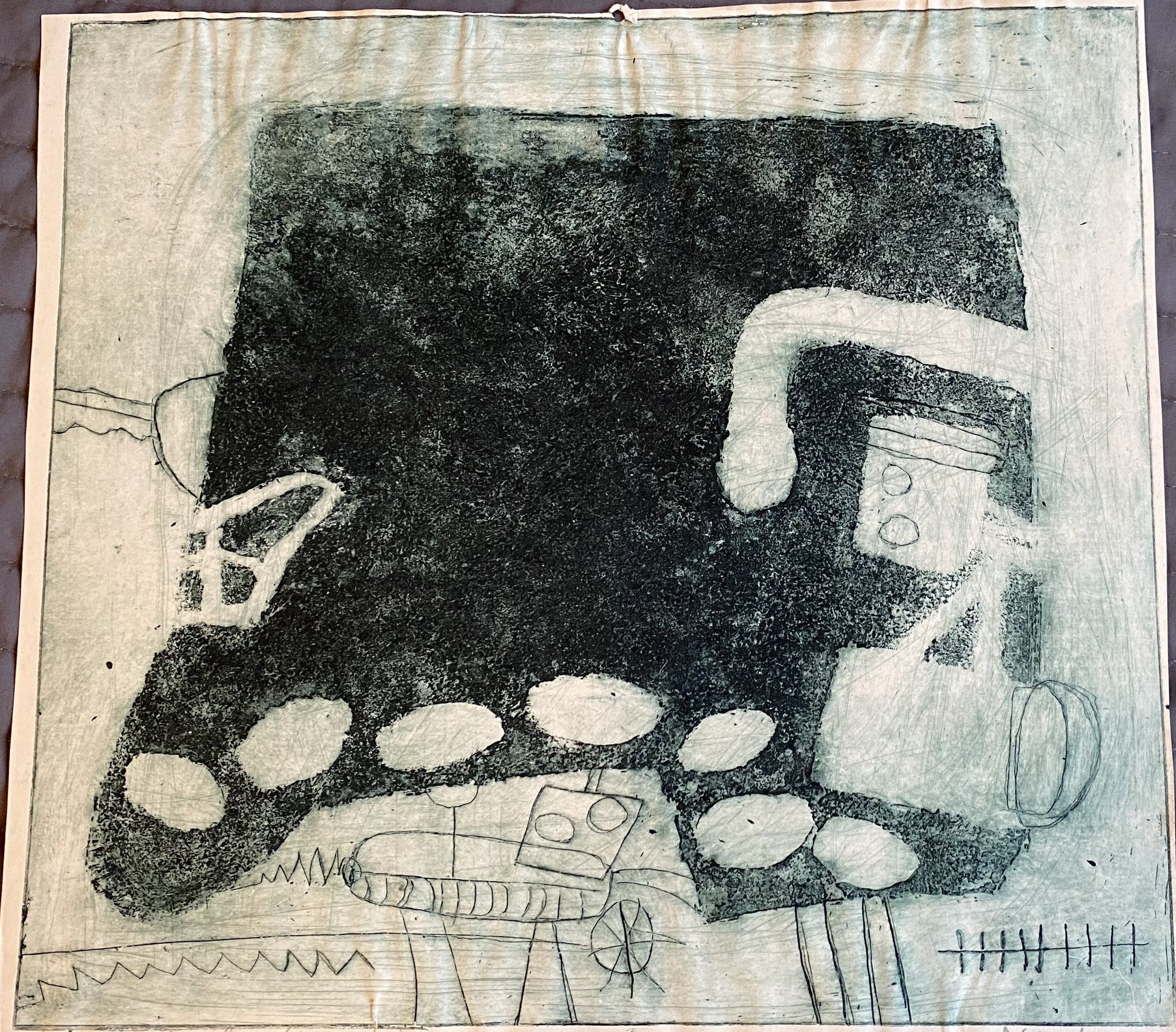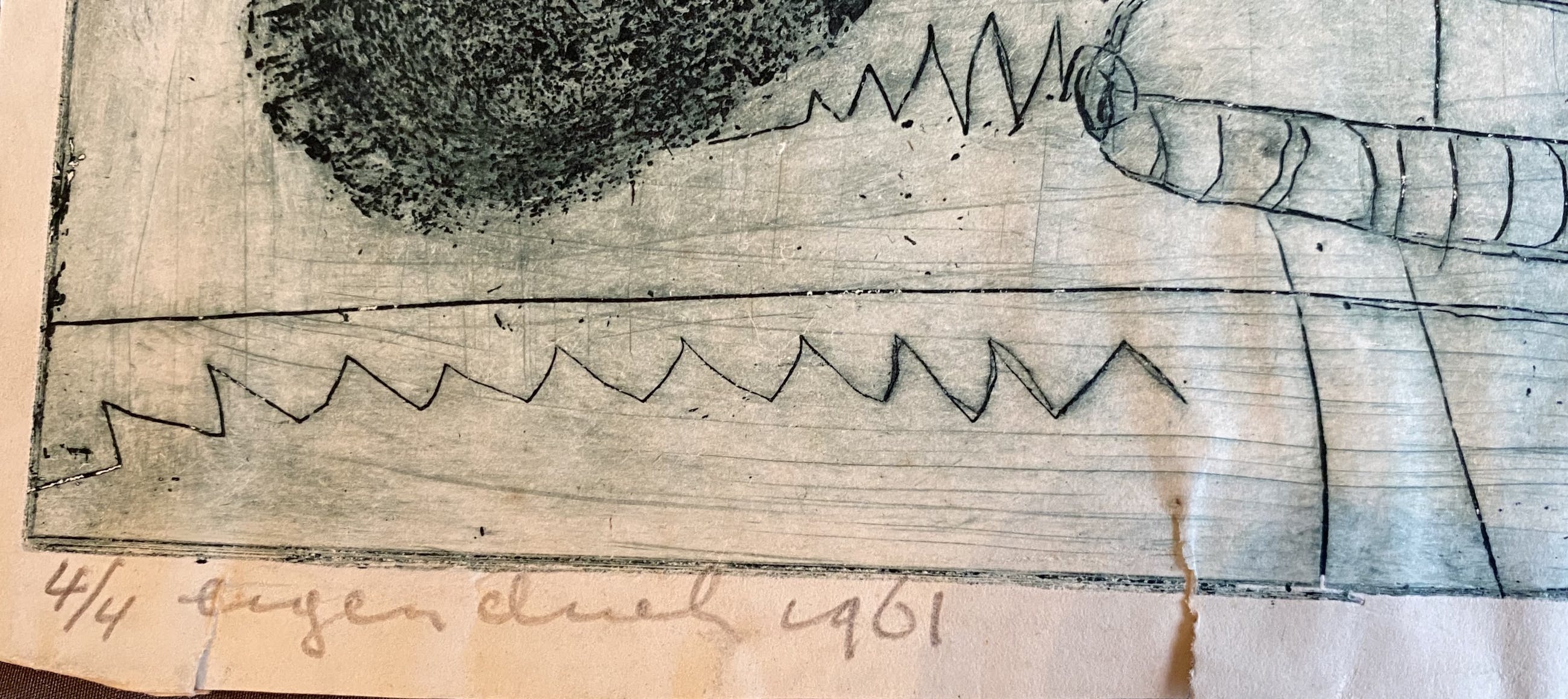 Vroeg werk in kleur van Jan Montyn zonder titel. Helaas beschadigd, een klein scheurtje aan de onderkant en een punaise gaatje aan de bovenkant. Maar toch een heel leuk werk en ingelijst zal het prachtig zijn.