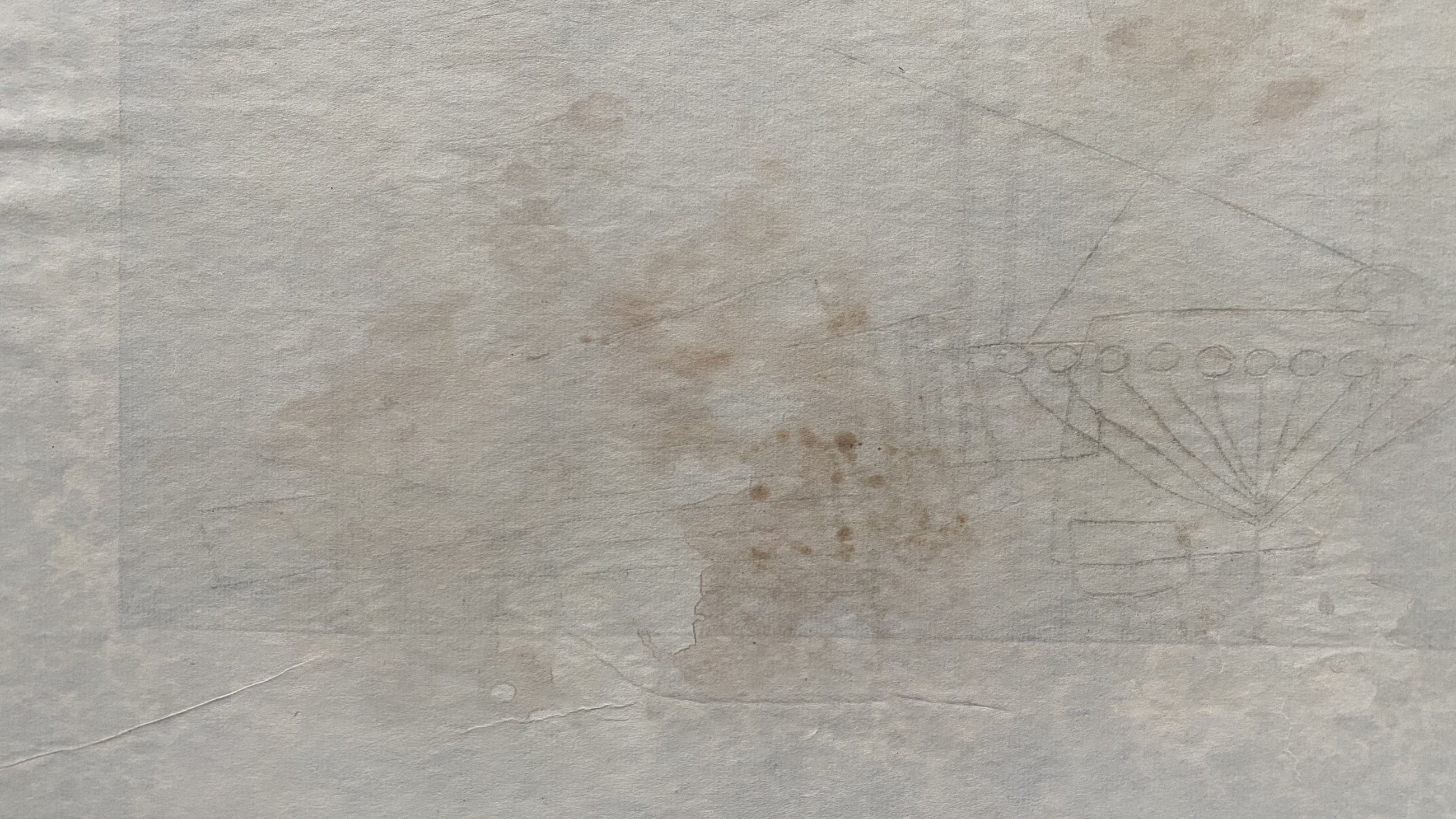 De ets is gedrukt op dun papier en heeft wat vlekken. In redelijke staat.