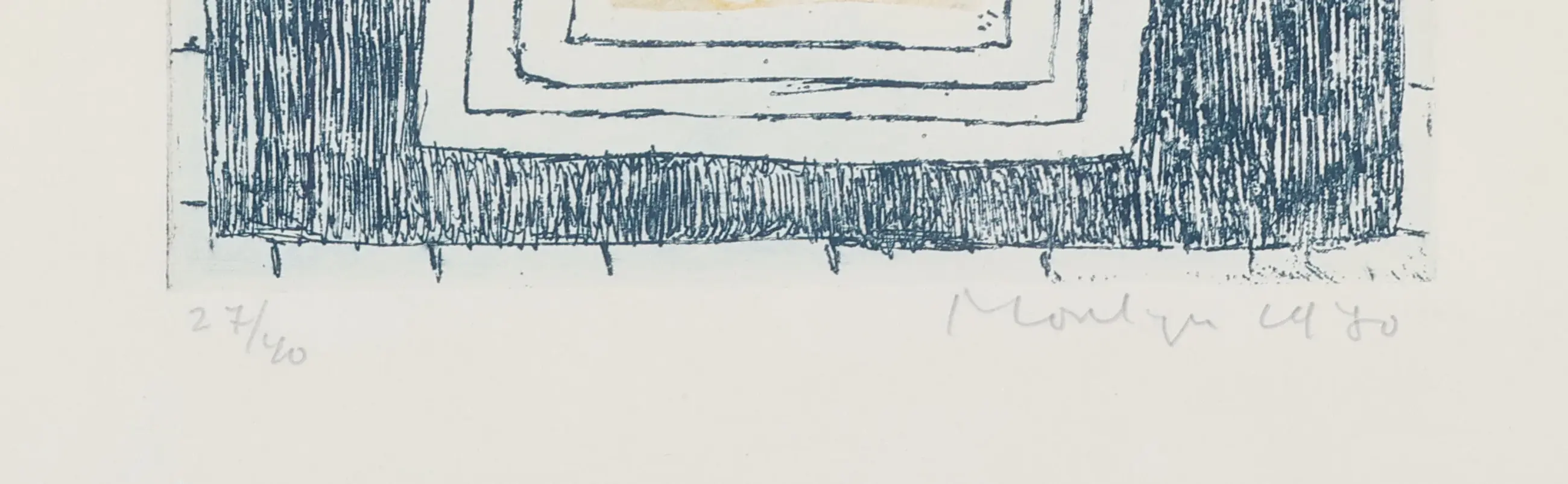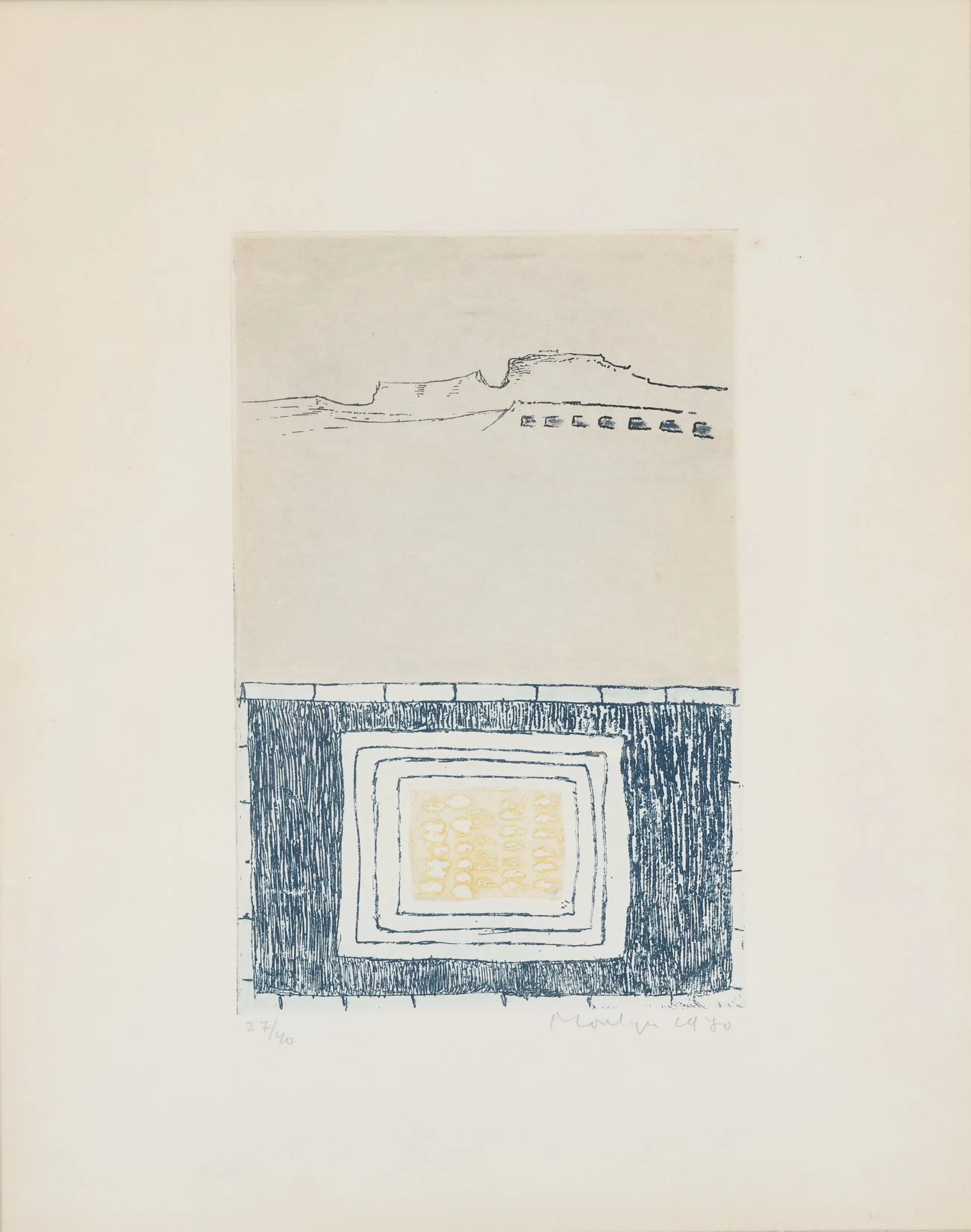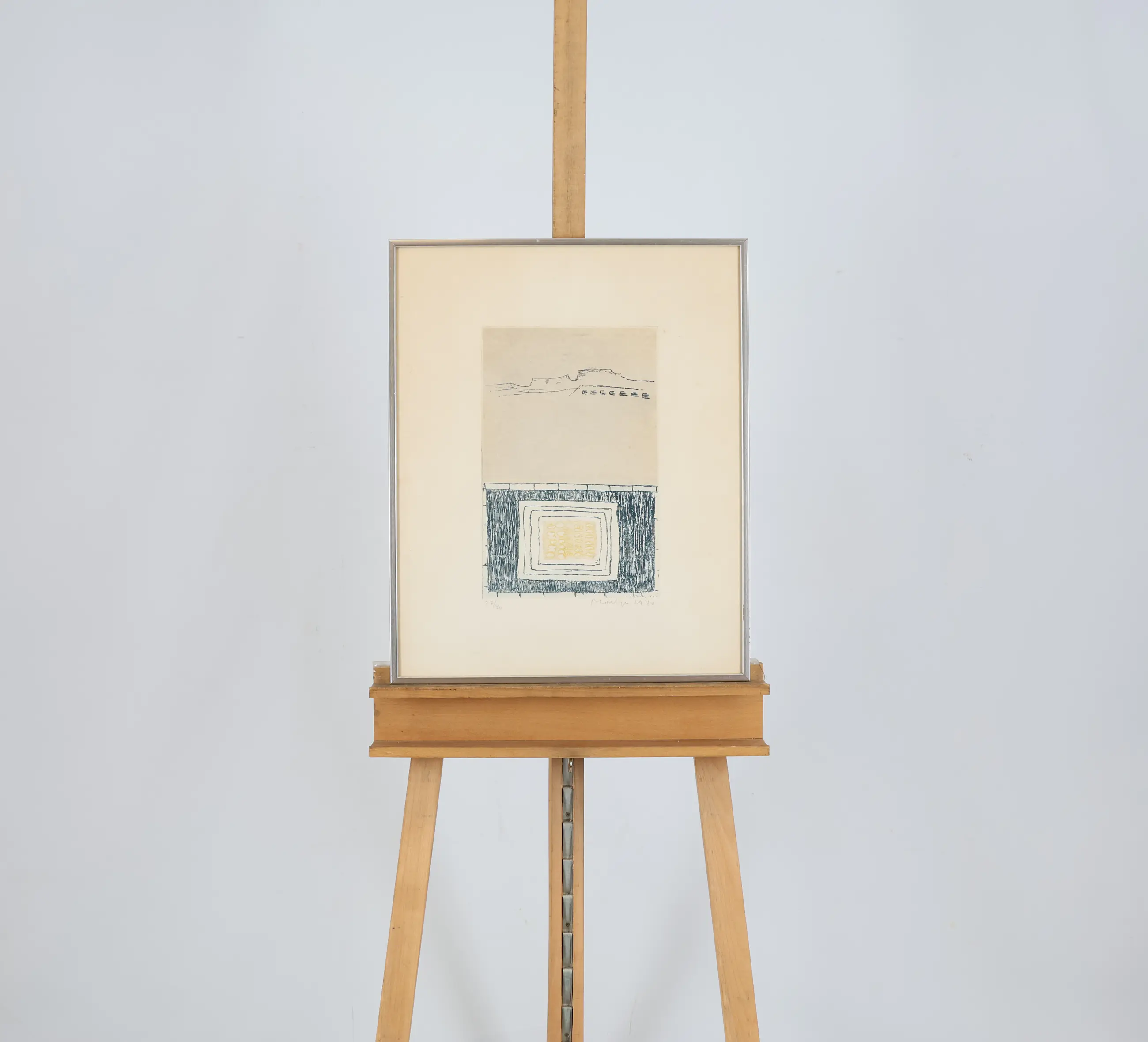 Deze subtiele litho van Jan Montyn trekt de aandacht door haar eenvoud. In de compositie lijken een landschap en een menselijke figuur te ontstaan — sober van vorm, maar rijk aan betekenis.