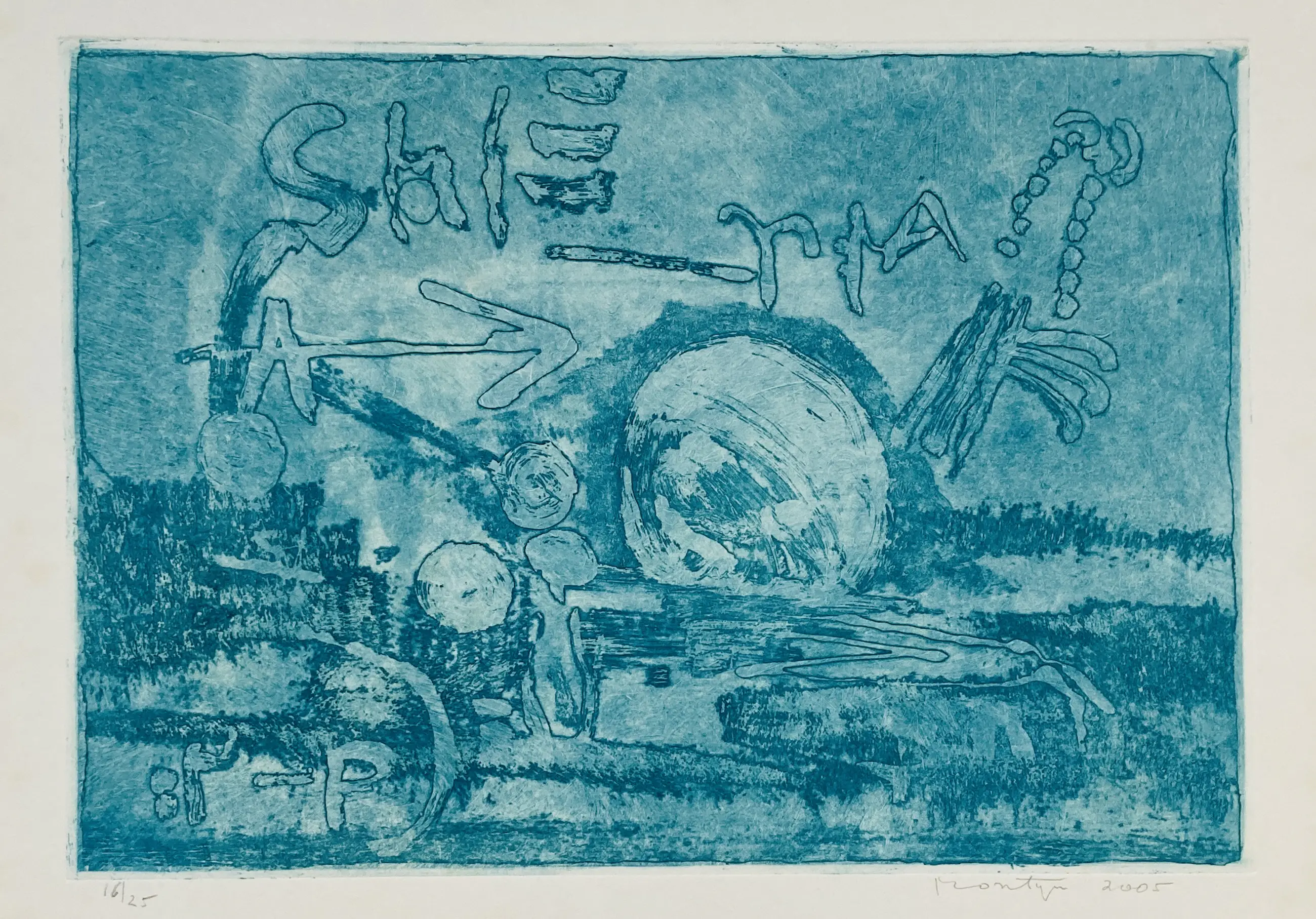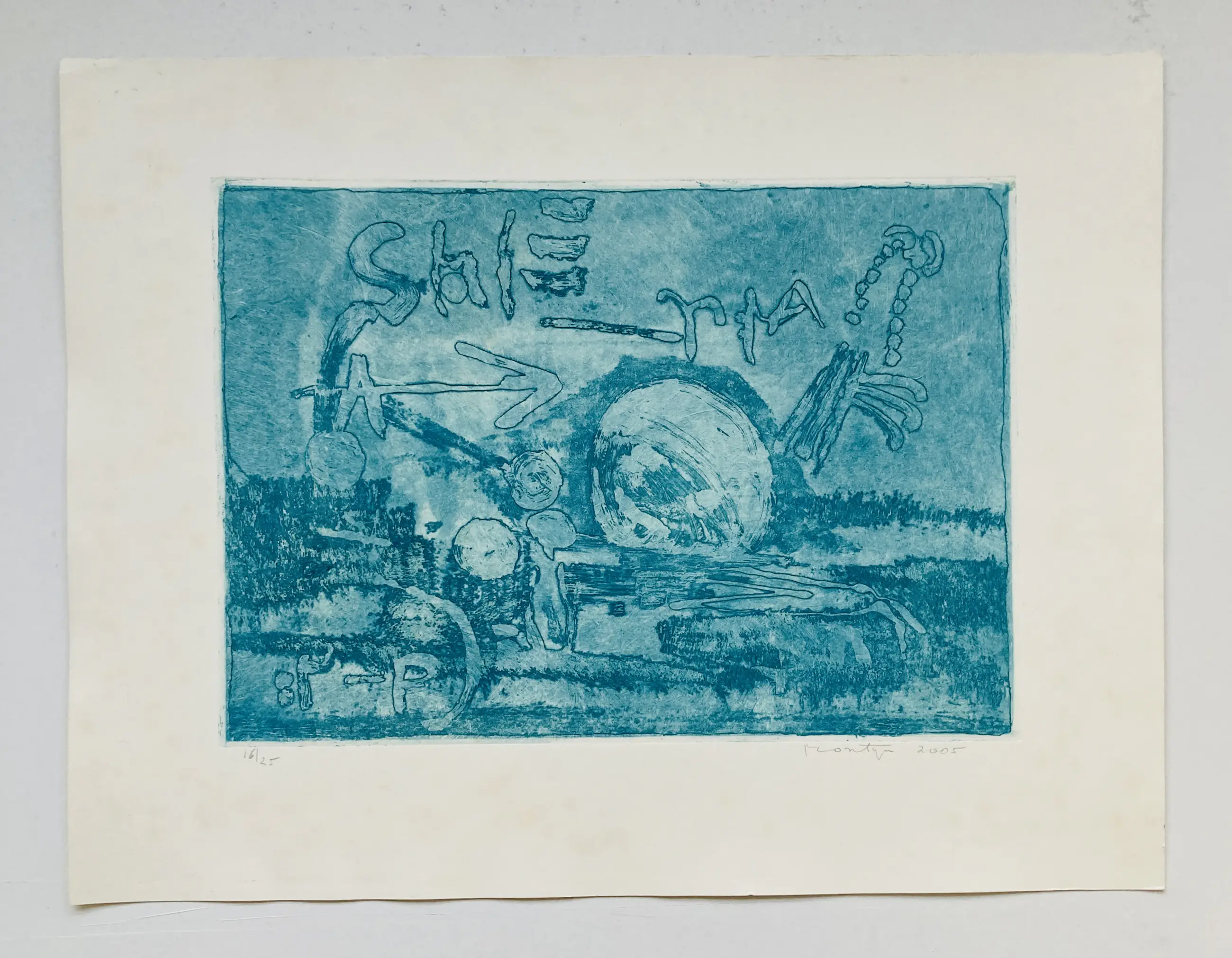 Een blauwe ets van de Nederlandse kunstenaar Jan Montyn (1924 - 2015). Het werk verkeert in goede conditie, maar heeft in de wit rand lichtkleurige vlekken. Dit valt volledig weg bij een nieuwe passe-partout. Het werk is handgesigneerd en genummerd door de kunstenaar.