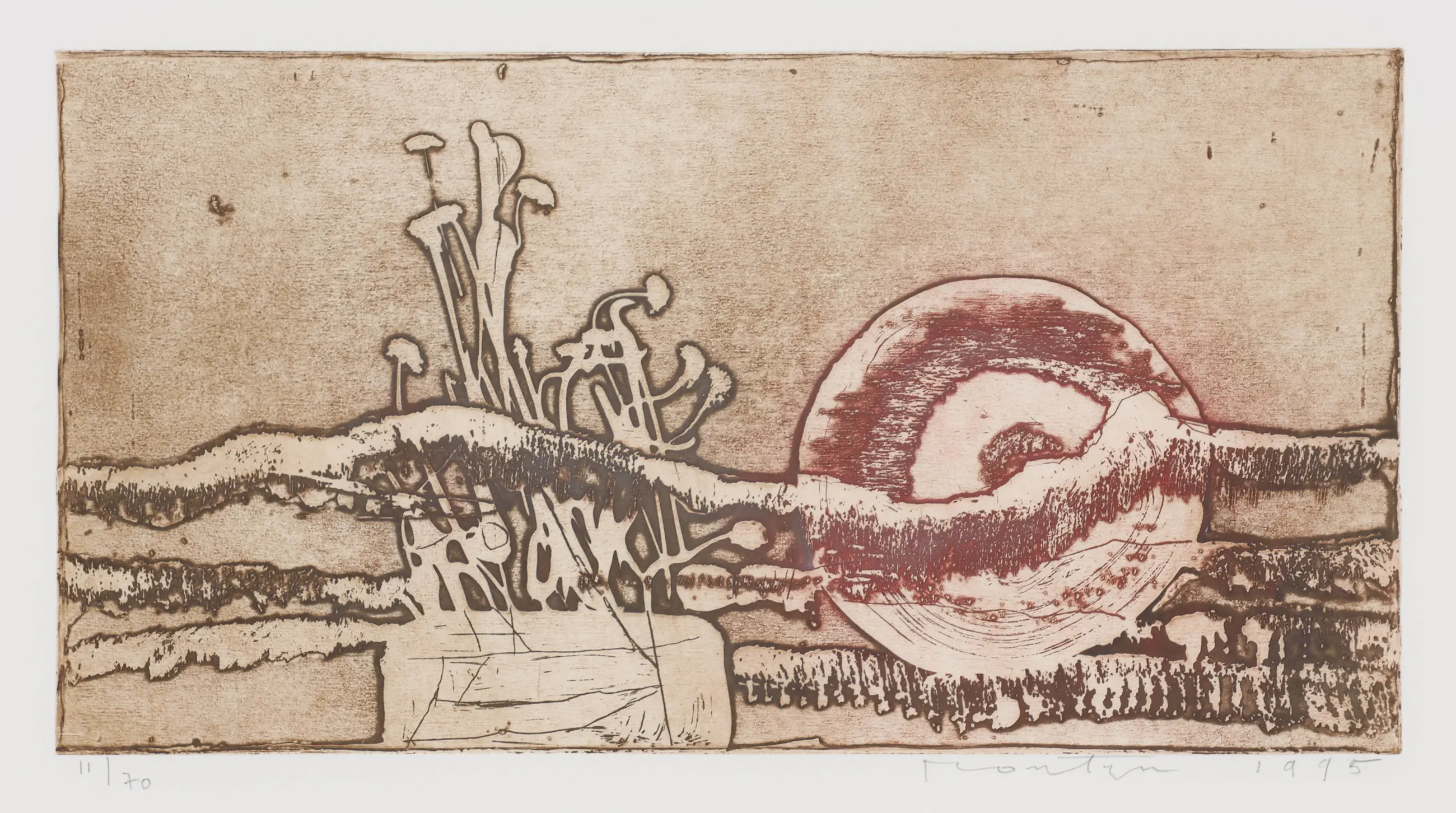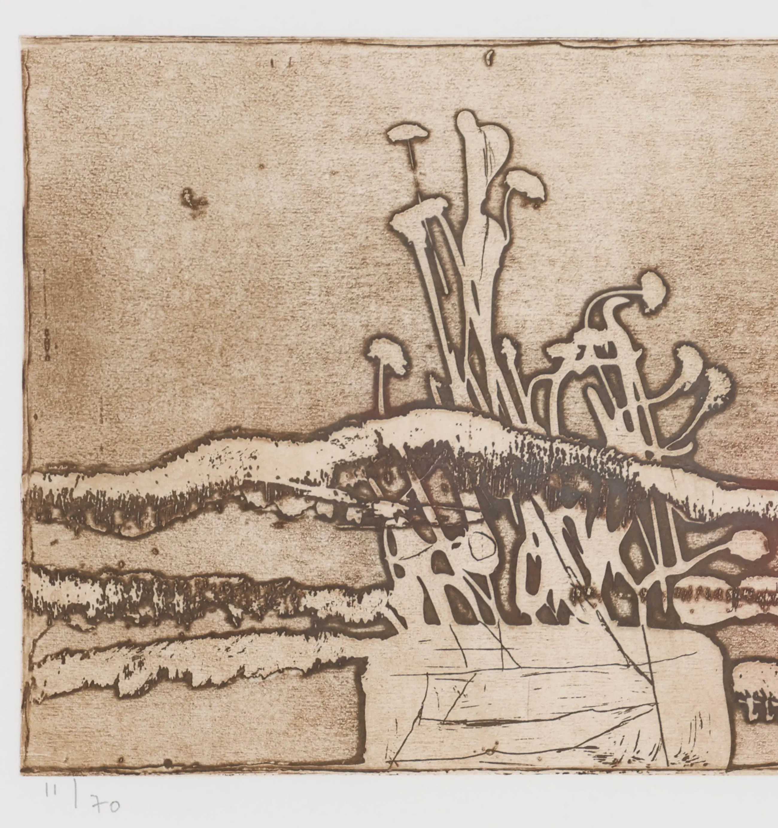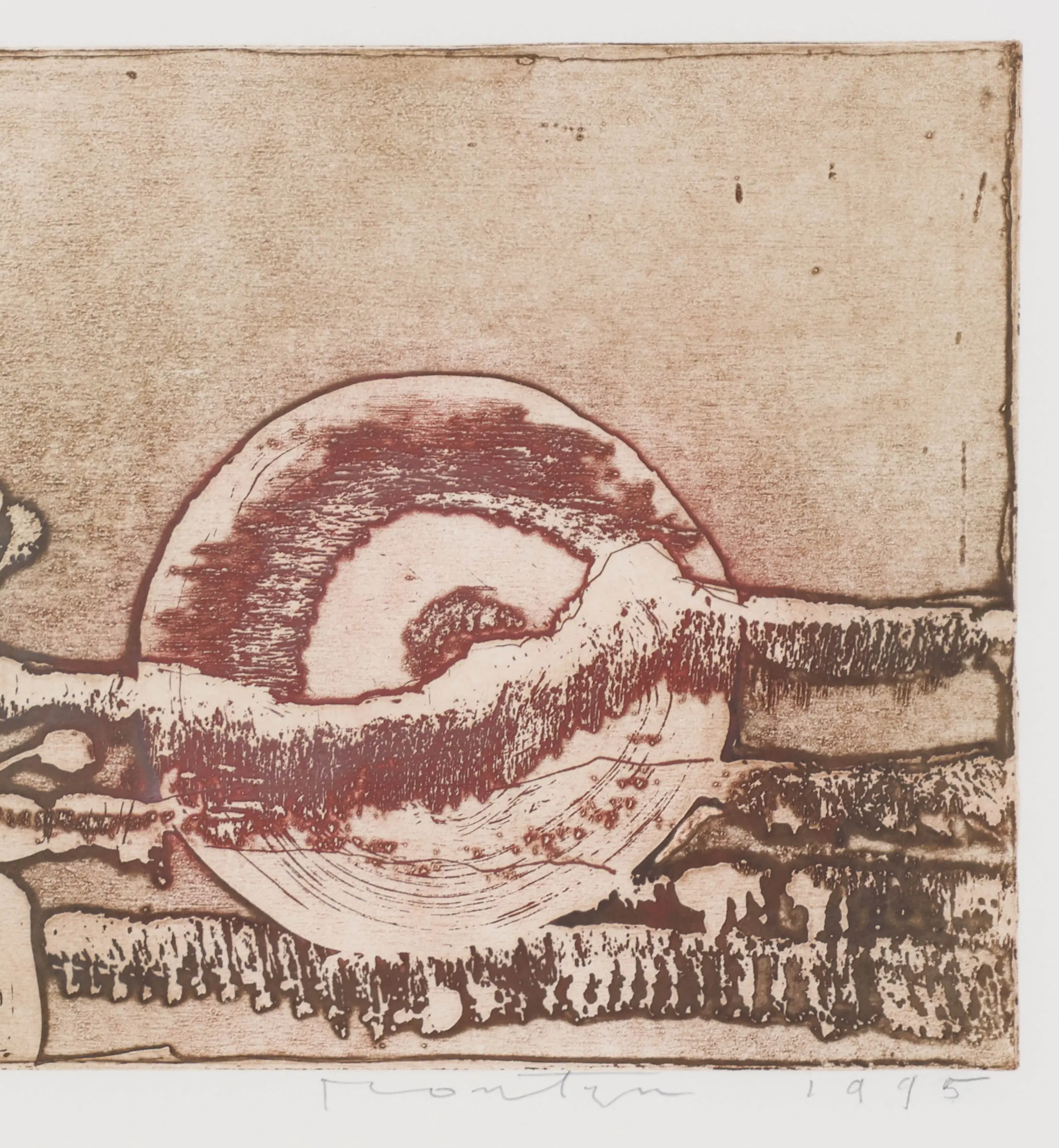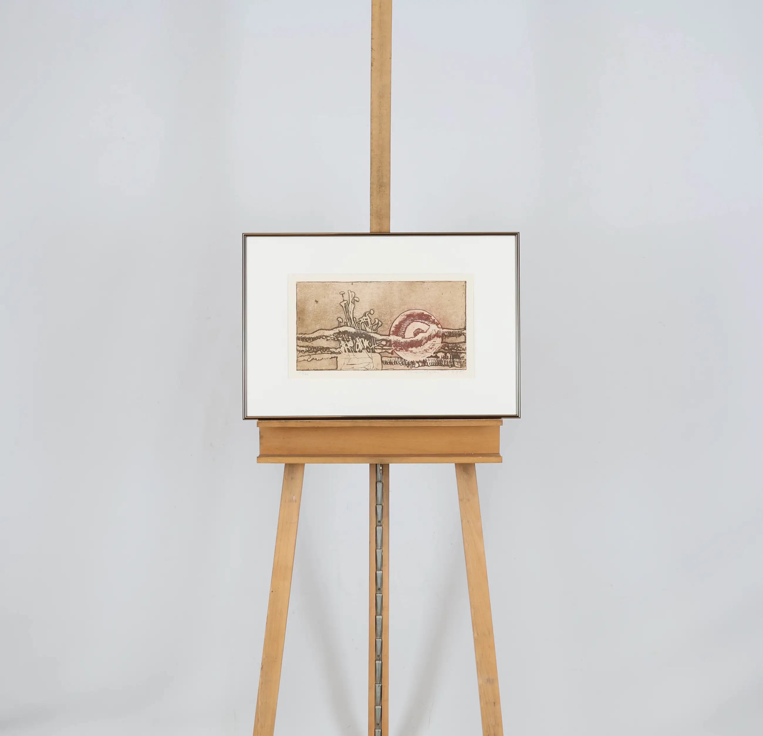 Deze subtiele litho van Jan Montyn trekt de aandacht door haar eenvoud. In de compositie lijken een landschap en een menselijke figuur te ontstaan — sober van vorm, maar rijk aan betekenis.