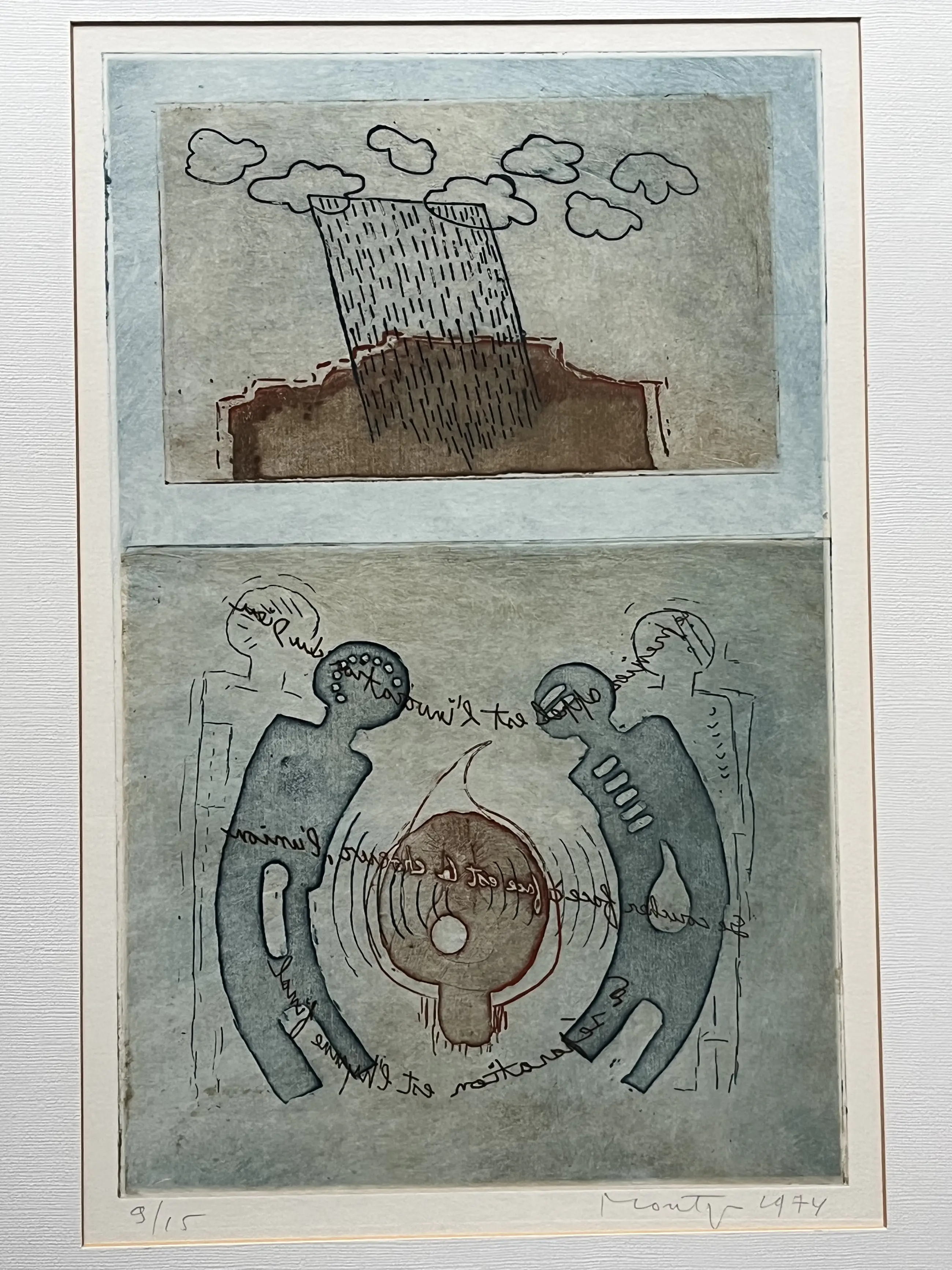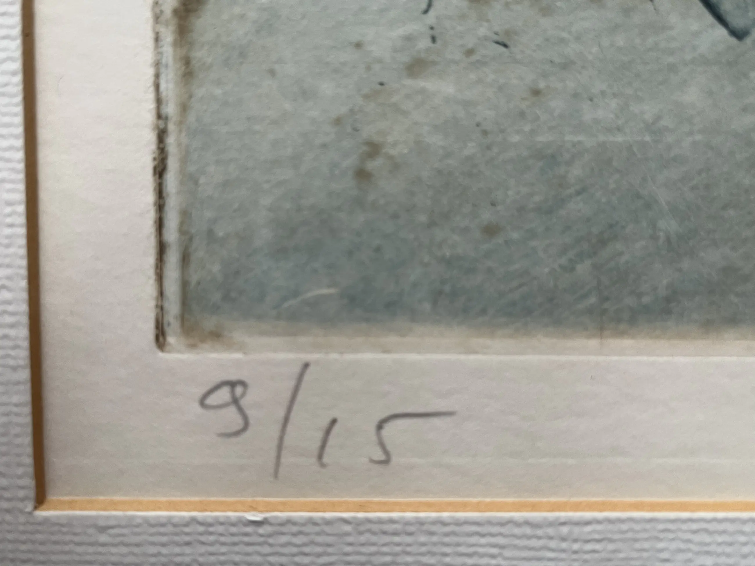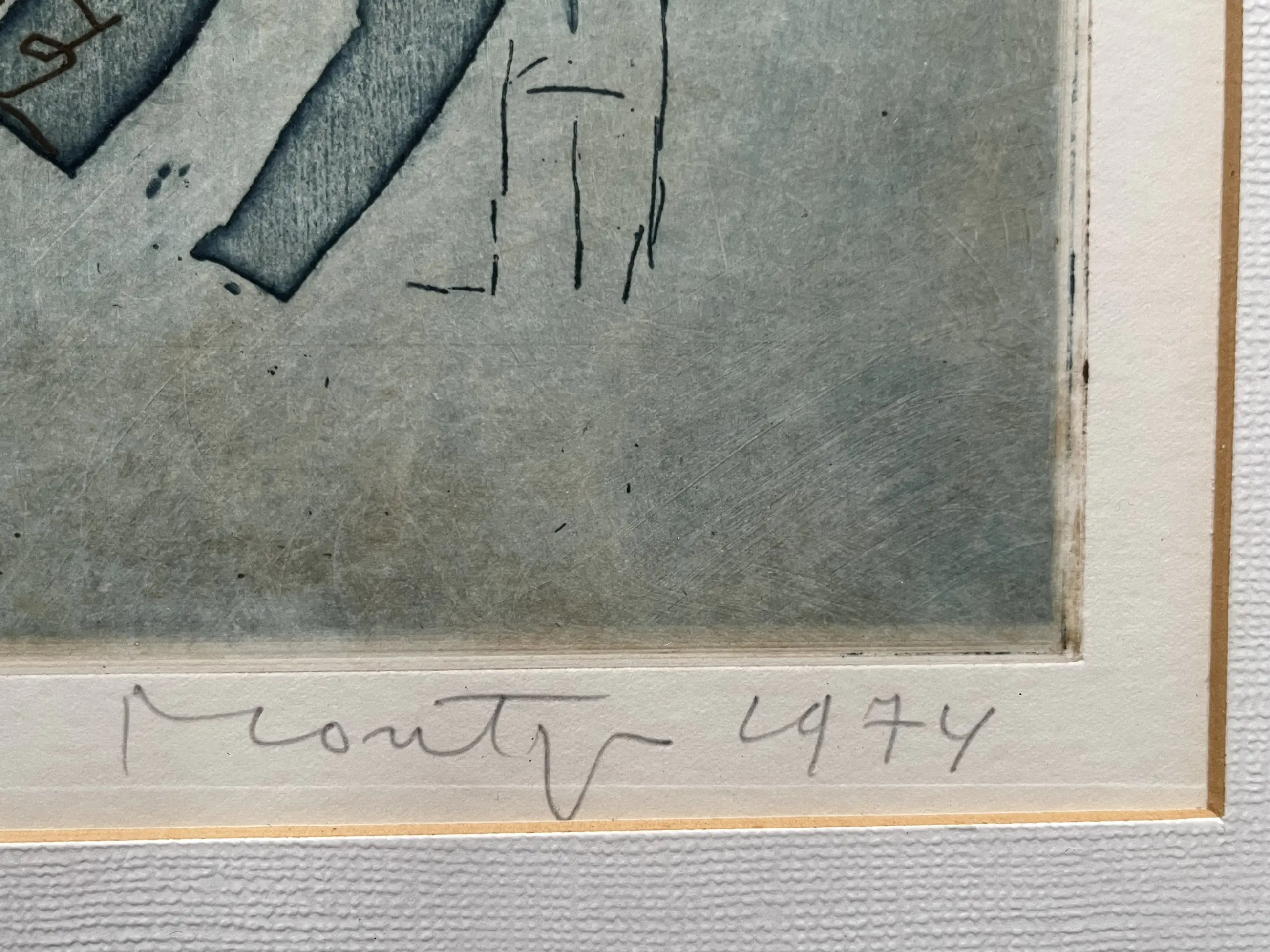 Fraaie ets uit 1974. Kleine oplage 9/15. In linkerhoek zitten wat bruine plekjes (detailfoto), waarvan ik niet kan inschatten of de kunstenaar het zo bedoeld heeft. Ets is gelijst in houten lijst. Afmetingen inclusief lijst 75 x 56 cm.
