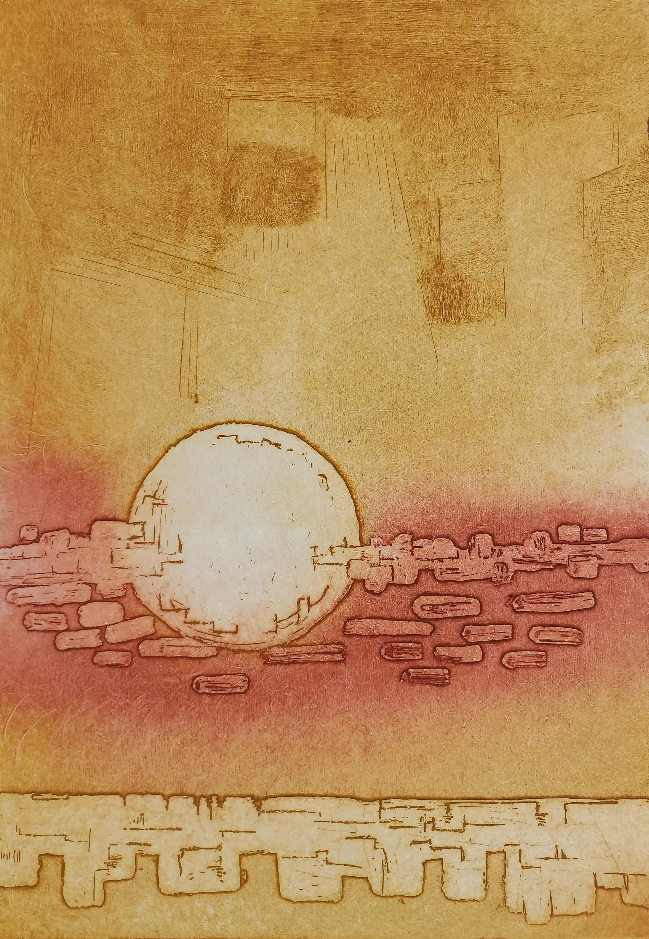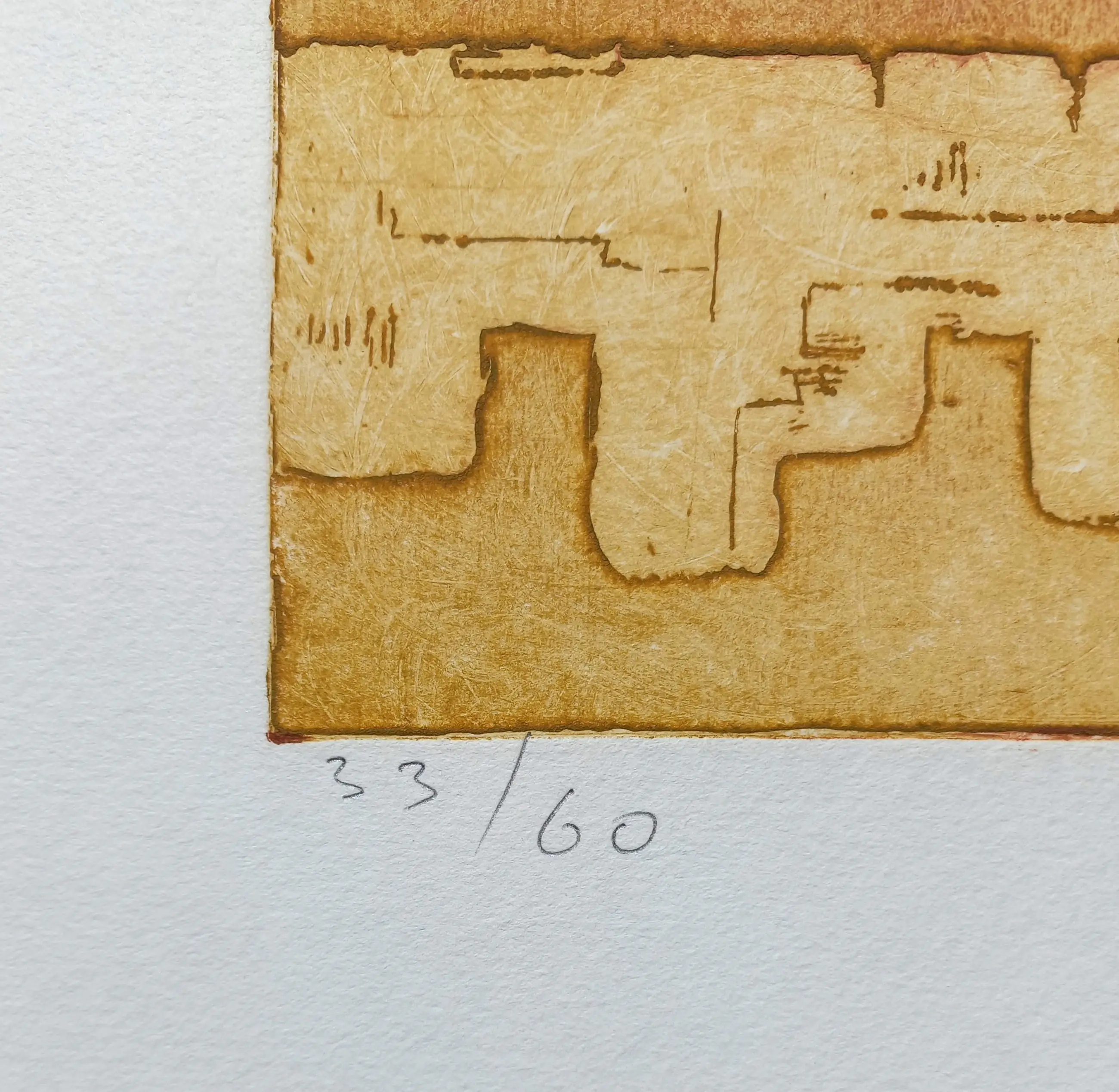 Prachtige ets van Jan Montyn uit de serie Wat betreft de zon. Aquatint ets op geschept papier, met potlood gesigneerd, gedateerd (1984) en genummerd (33/60). In uitstekende conditie.