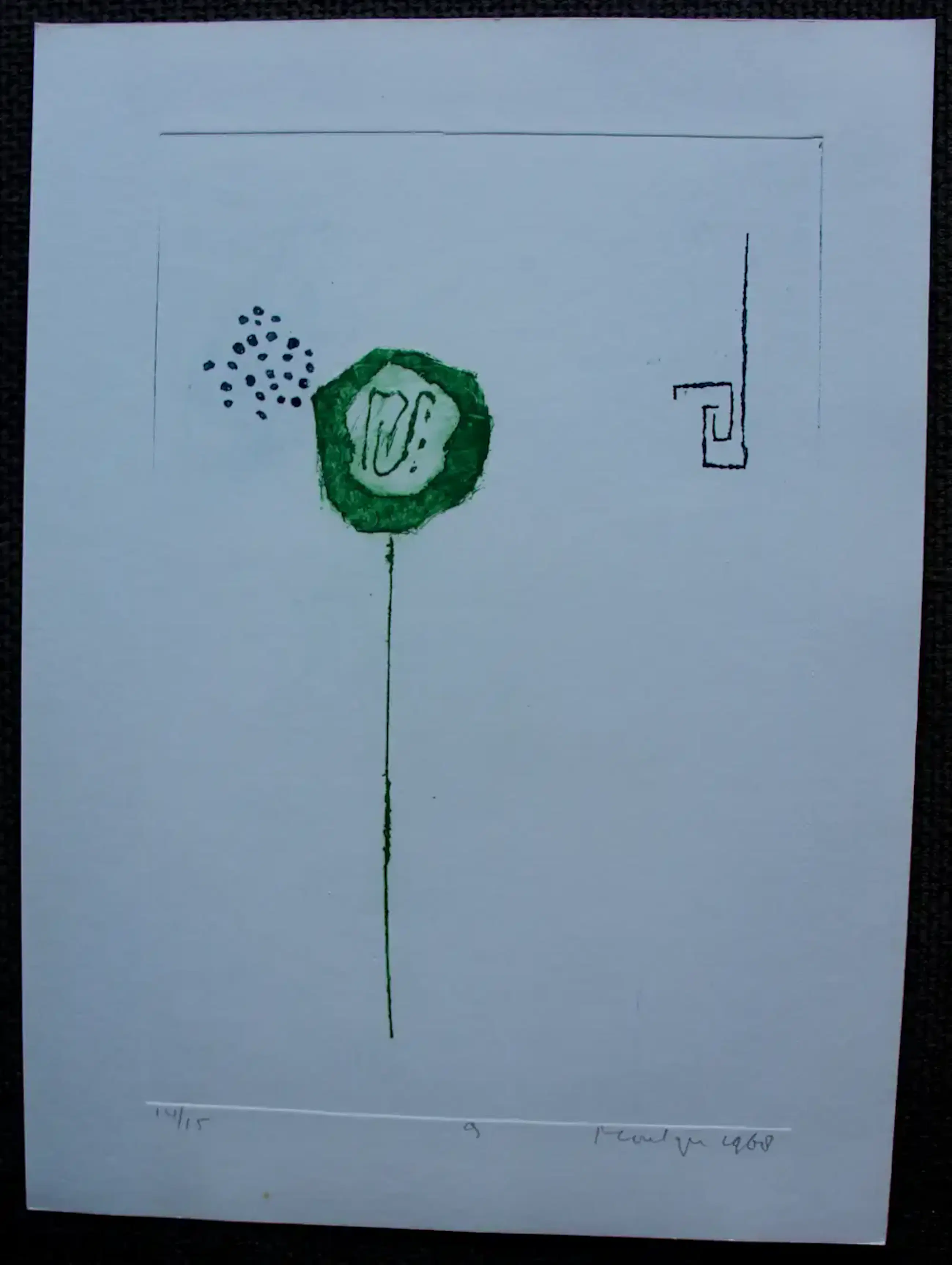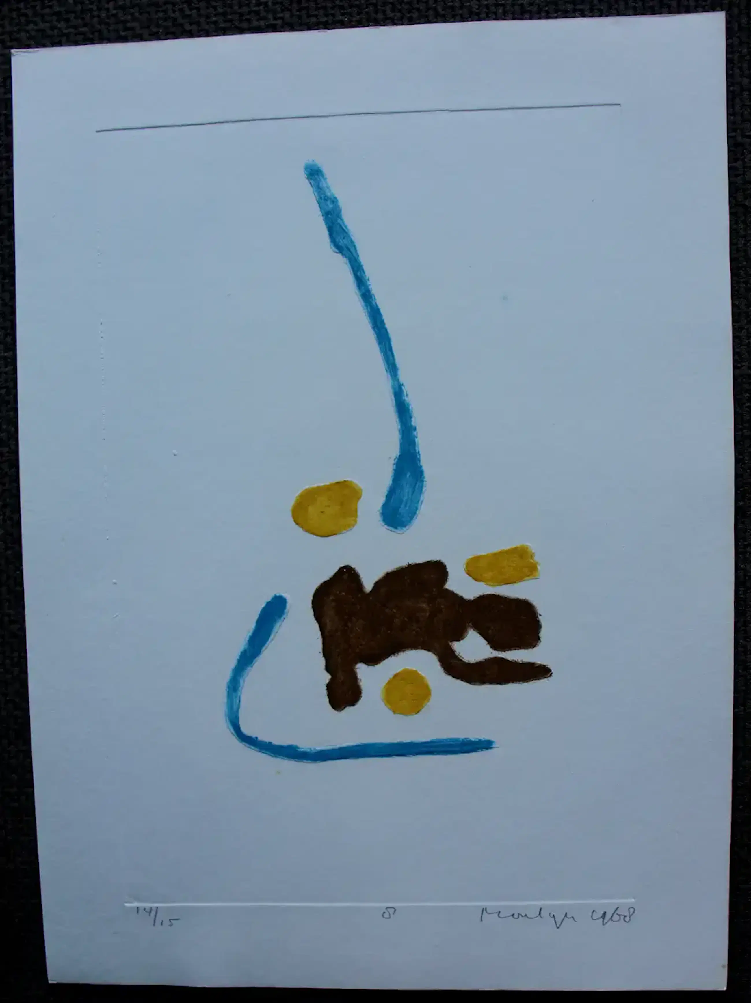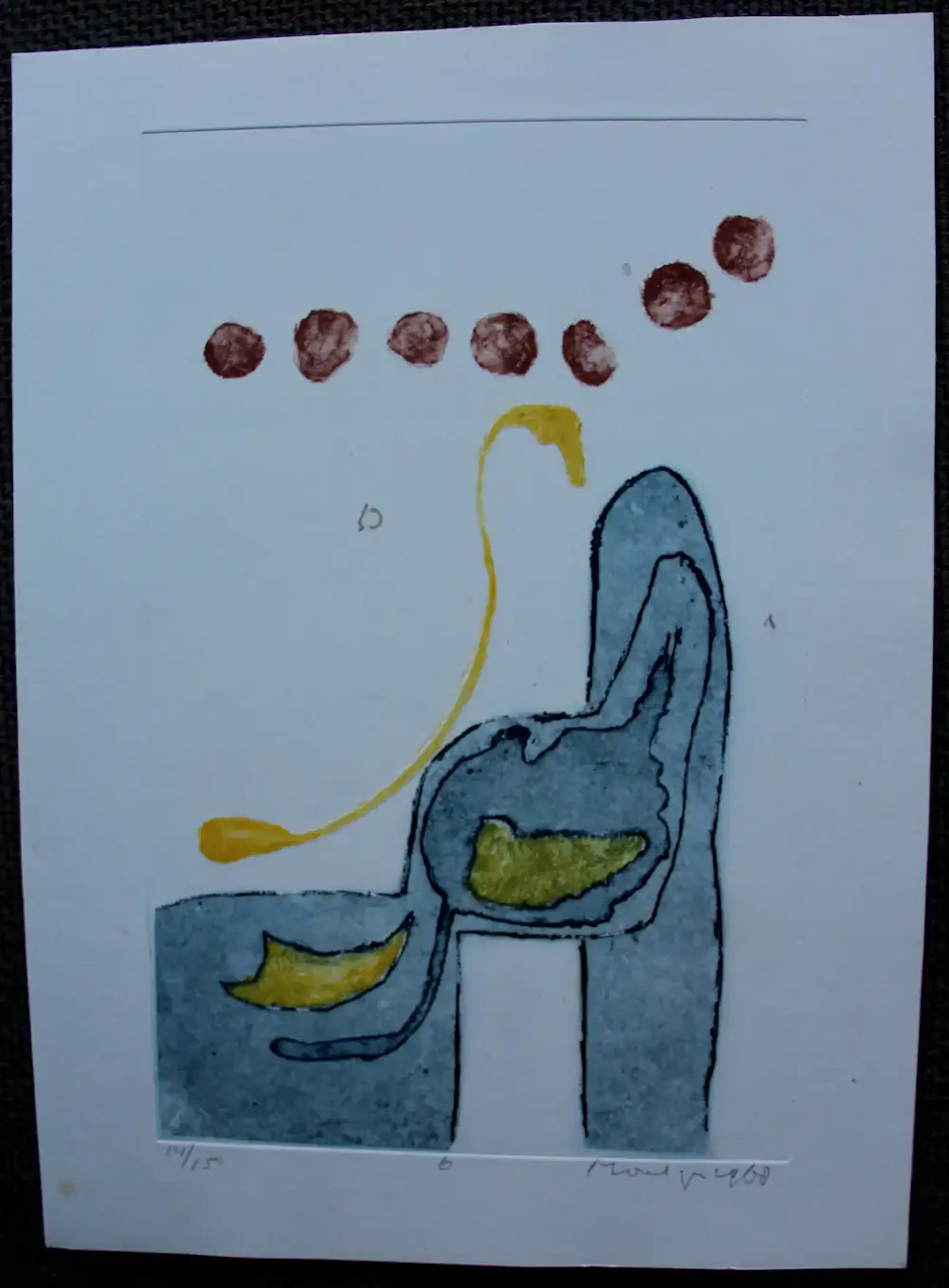 10 etsen en 10 korte gedichten, van Jan Montyn. Jaar: 1968. Beperkte oplage van 15 exemplaren. Oplage: 14/15. Afmetingen boek: H41 x b30.5cm. Alle werken zijn, met potlood, gesigneerd door de kunstenaar. De authenticiteit van de aangeboden werken, wordt volledig gegarandeerd. Een certificaat van echtheid kan, op aanvraag, worden gemaild. Op de eerste pagina geannoteerd ‘aan Jan van Zwieten voor + na ons leven je Jan Montijn’.