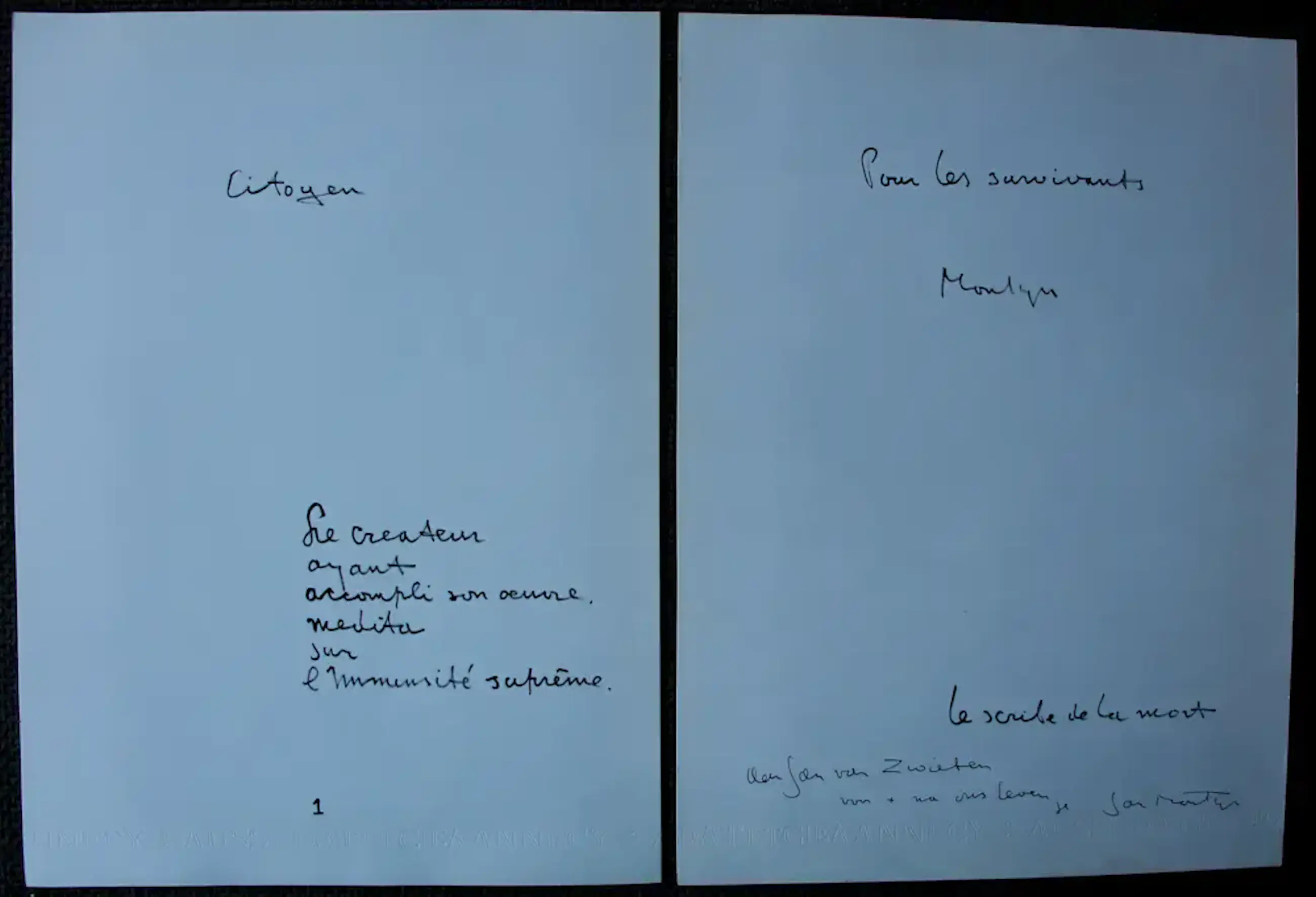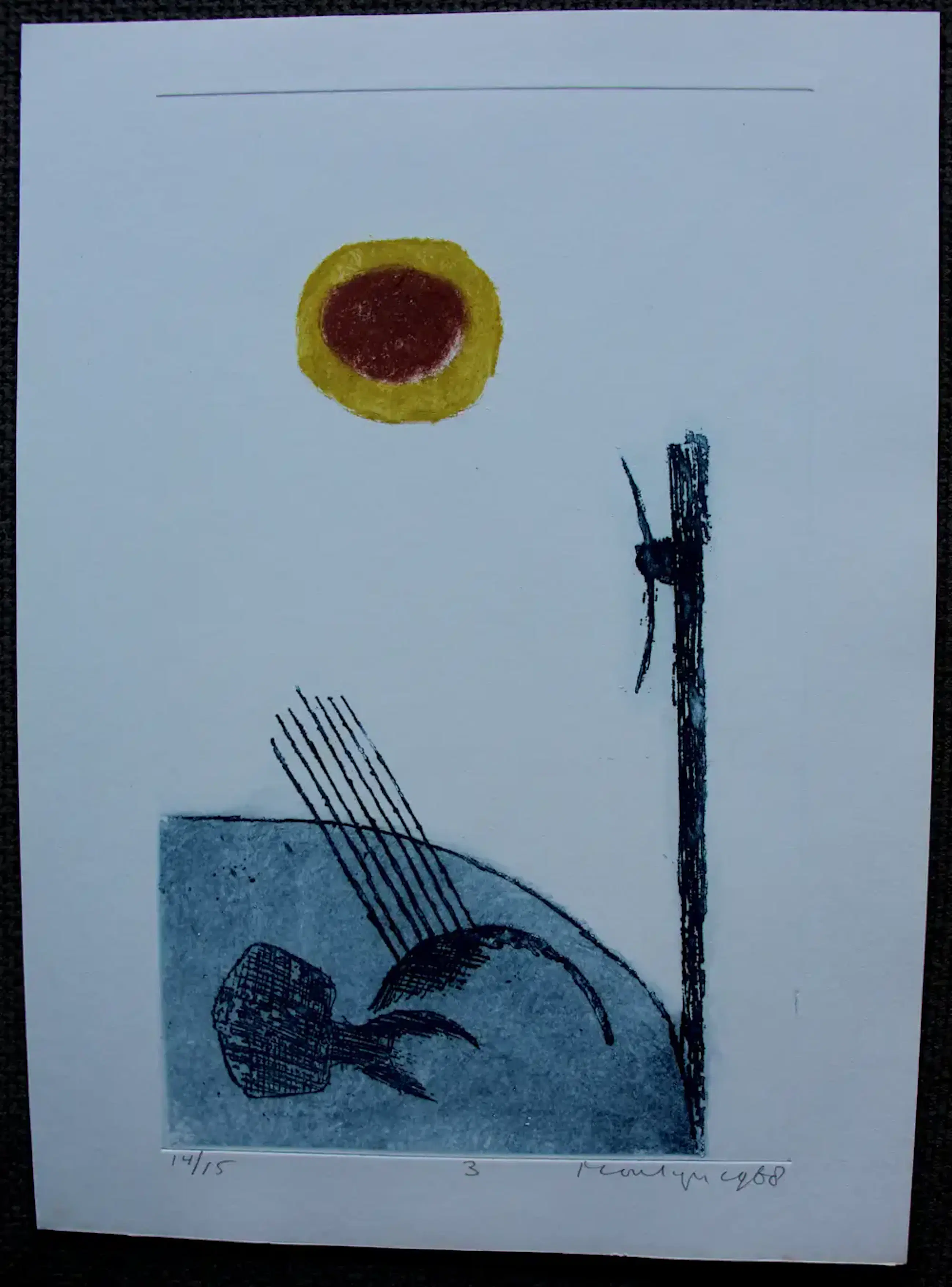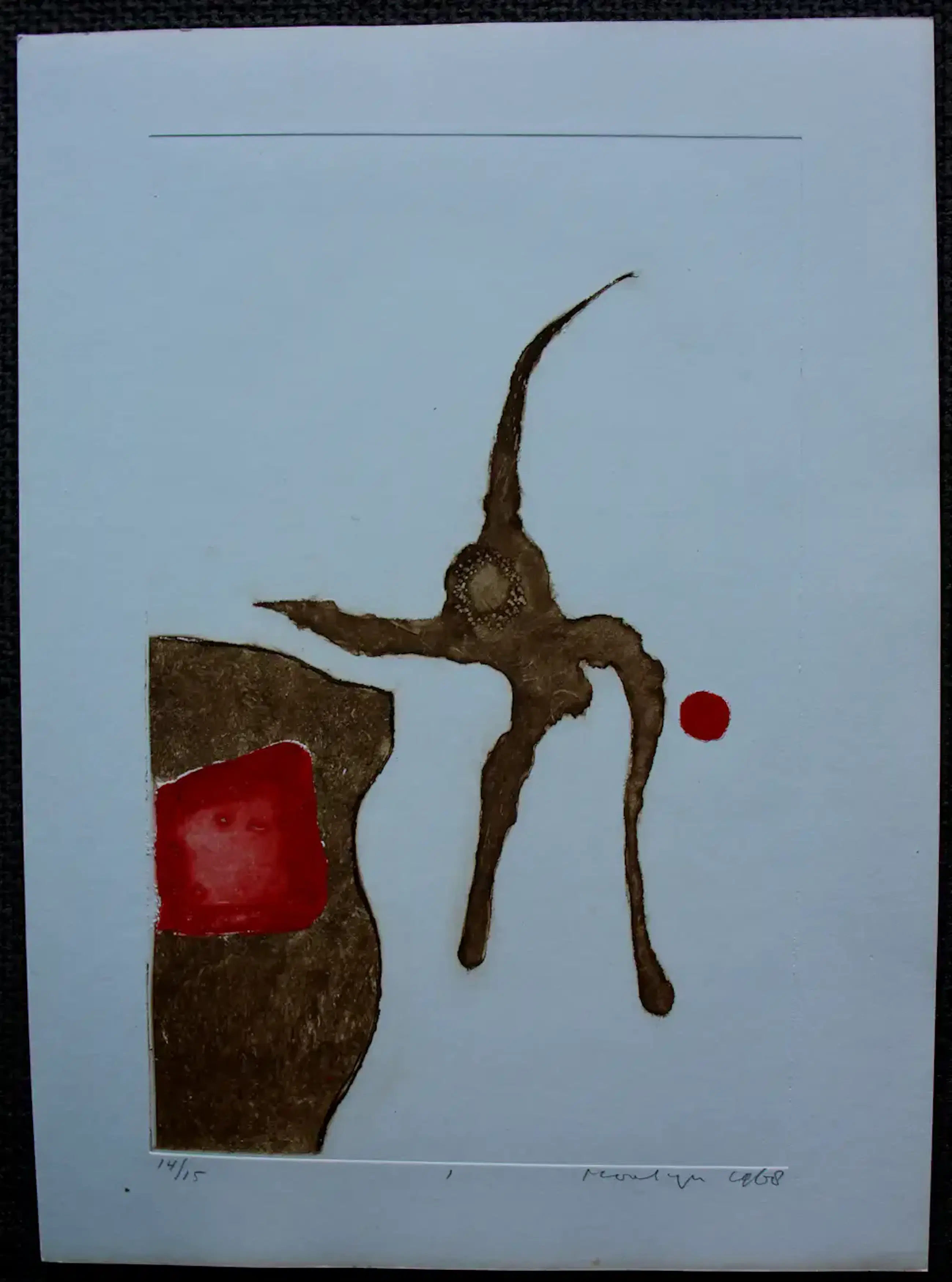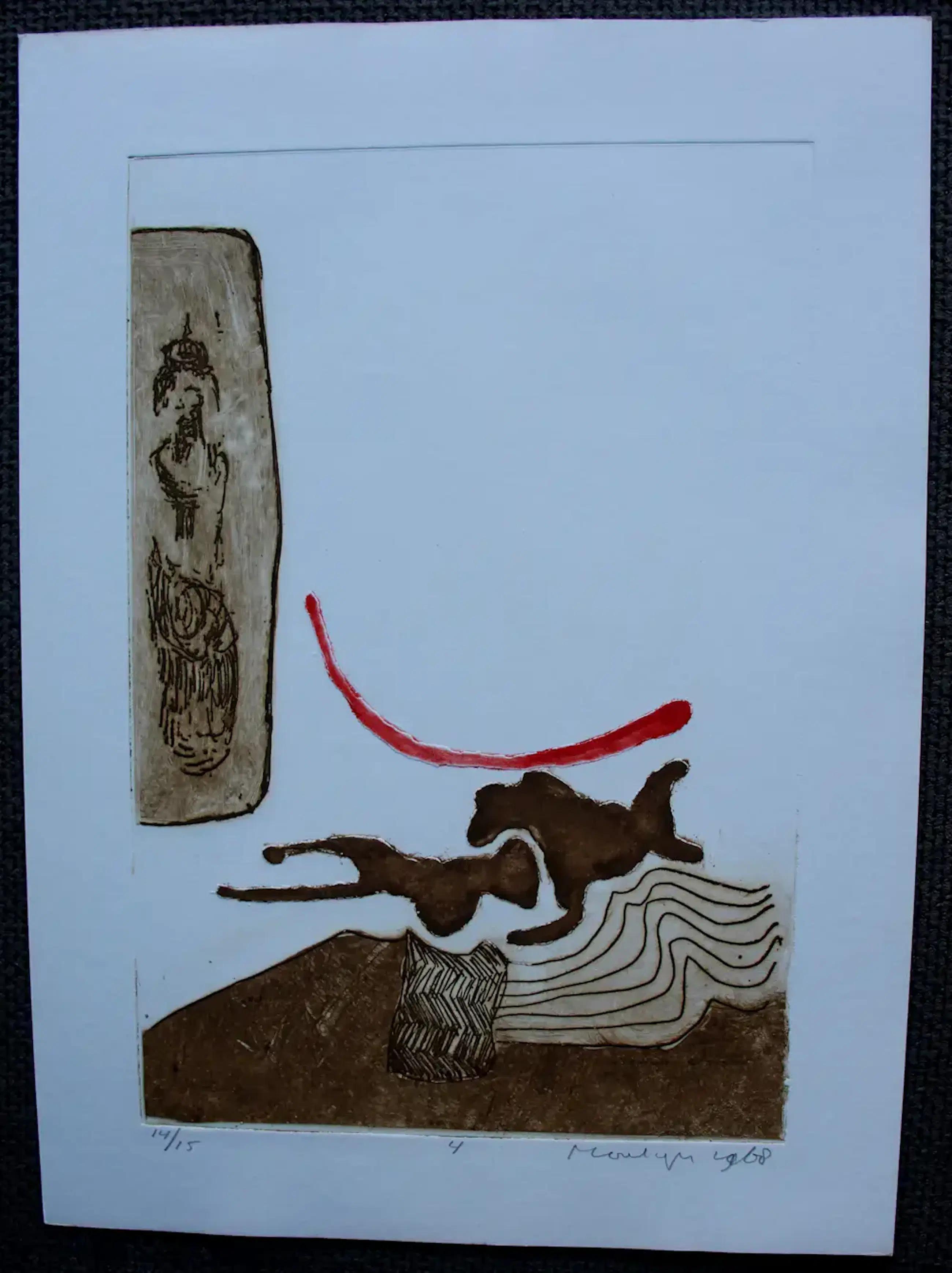 10 etsen en 10 korte gedichten, van Jan Montyn. Jaar: 1968. Beperkte oplage van 15 exemplaren. Oplage: 14/15. Afmetingen boek: H41 x b30.5cm. Alle werken zijn, met potlood, gesigneerd door de kunstenaar. De authenticiteit van de aangeboden werken, wordt volledig gegarandeerd. Een certificaat van echtheid kan, op aanvraag, worden gemaild. Op de eerste pagina geannoteerd ‘aan Jan van Zwieten voor + na ons leven je Jan Montijn’.