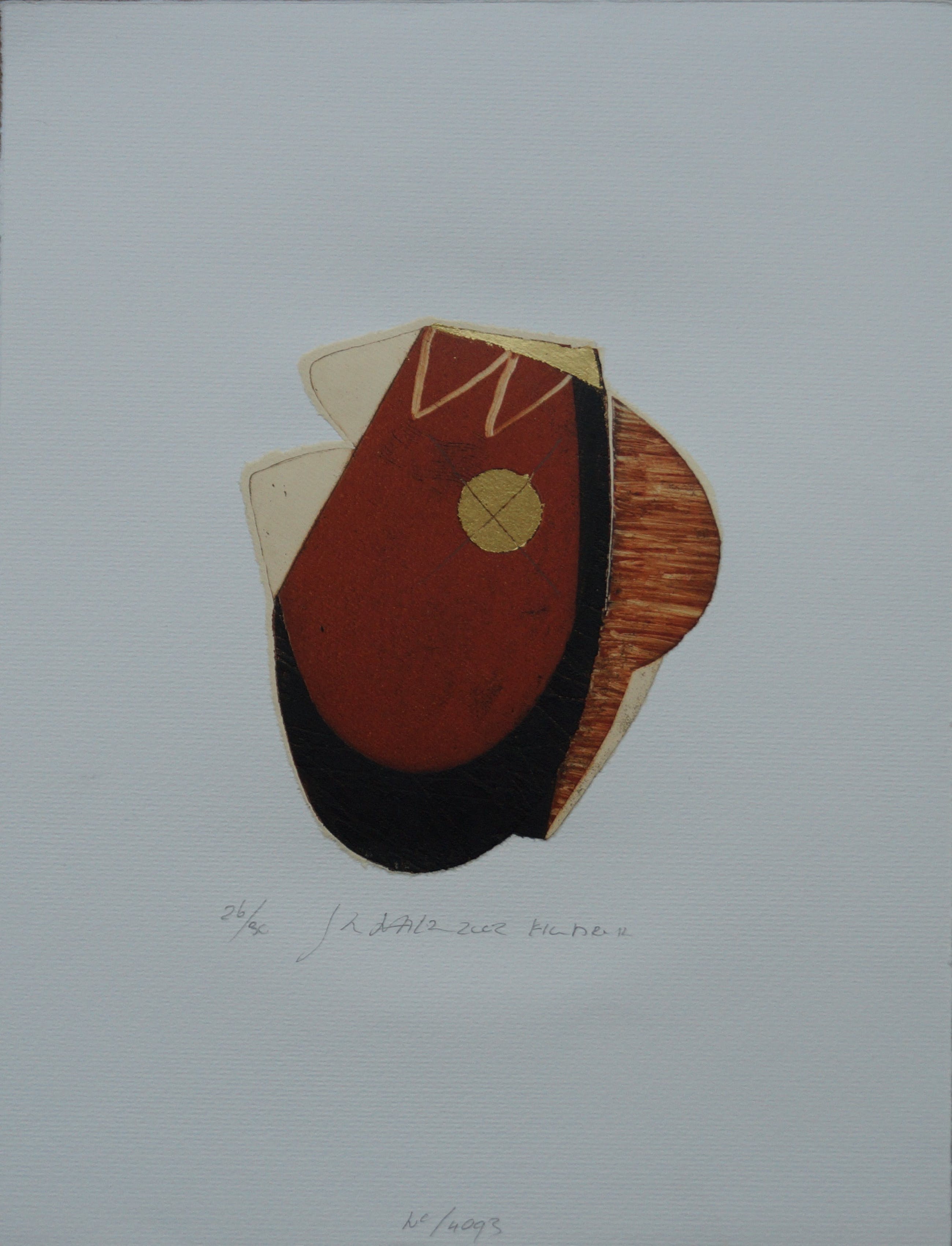 Etscollage met bladgoud in eigen druk Zonder titel Afmeting afbeelding: 15 x 13 cm (hxb) Oplagenummer: 26/ 30 In zeer goede conditie