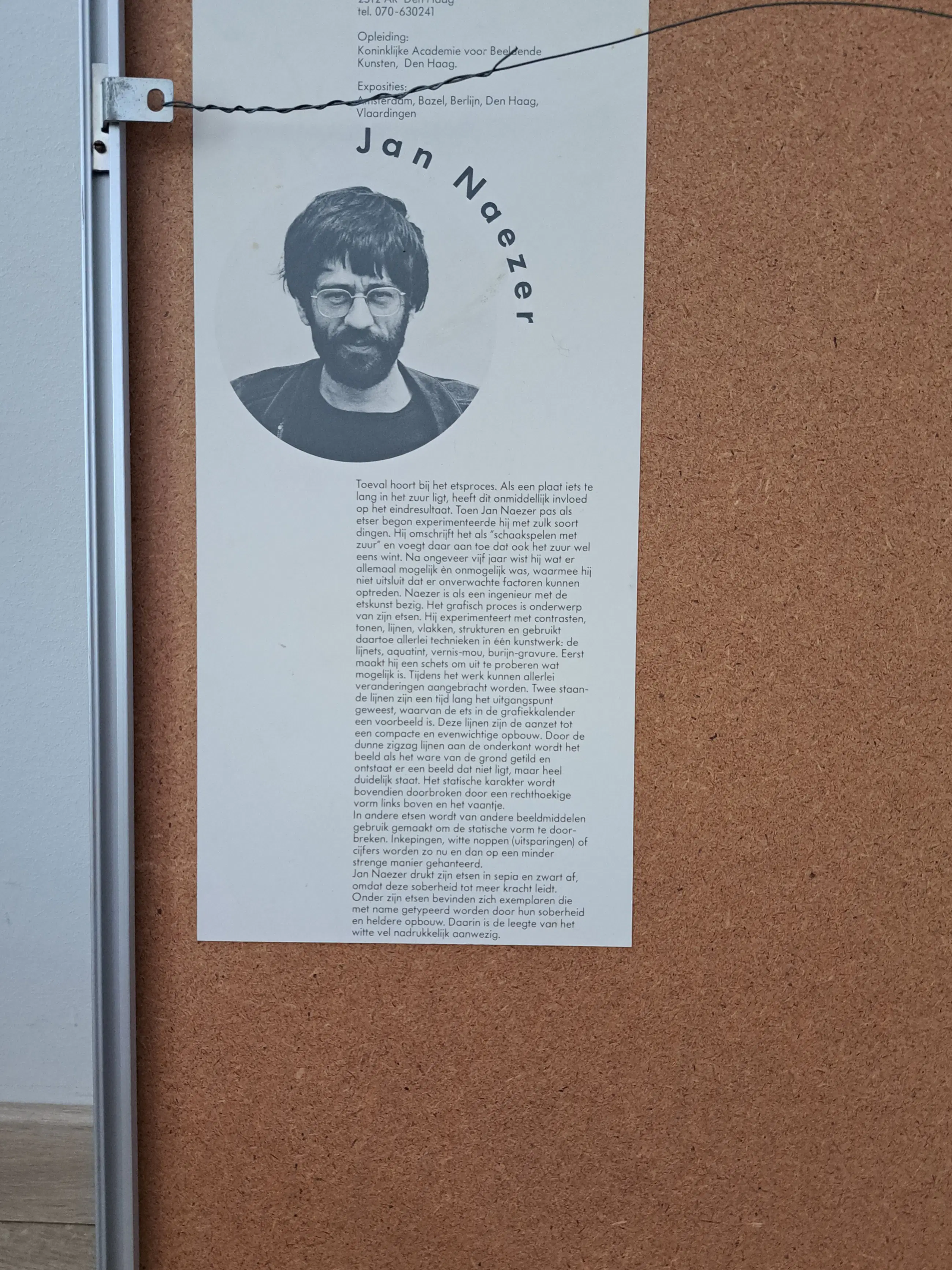 Jan Naezer is, zowel in Nederland als daarbuiten, een bekende naam in de grafische wereld. Als actief lid van Pulchri Studio en door zijn lesinstituut ( Atelier Jan Naezer) waar hij 47 jaar tal van cursussen verzorgde, heeft Naezer zich een prominente plaats verworven in de Haagse kunstwereld.