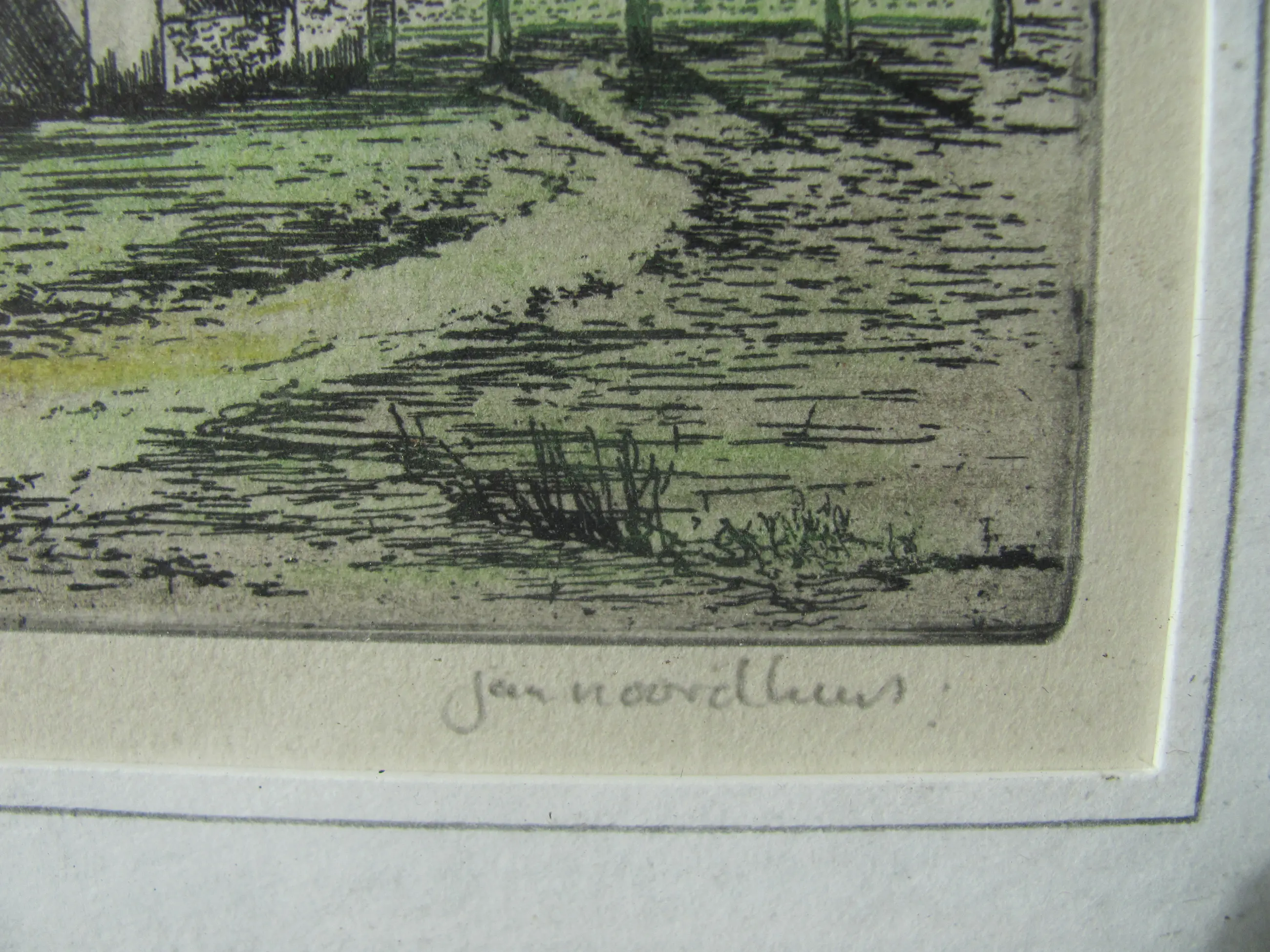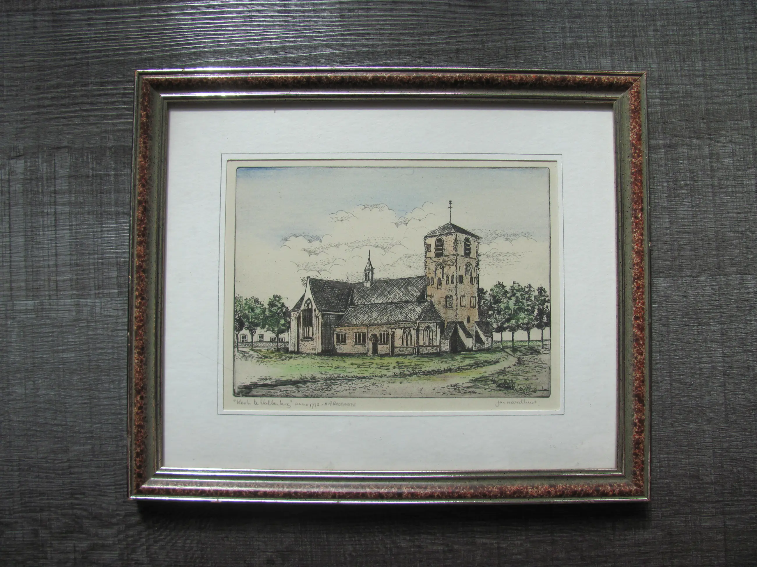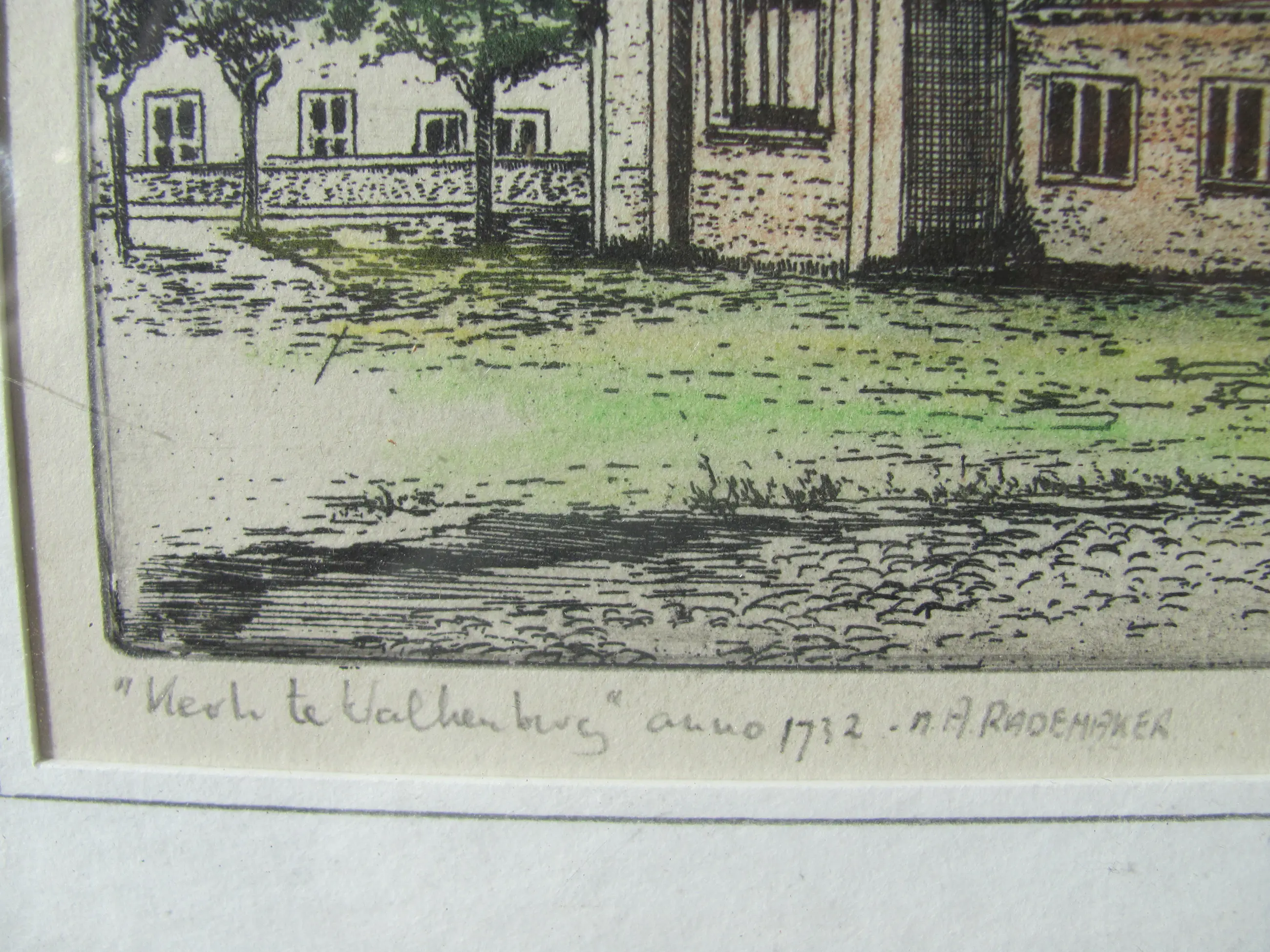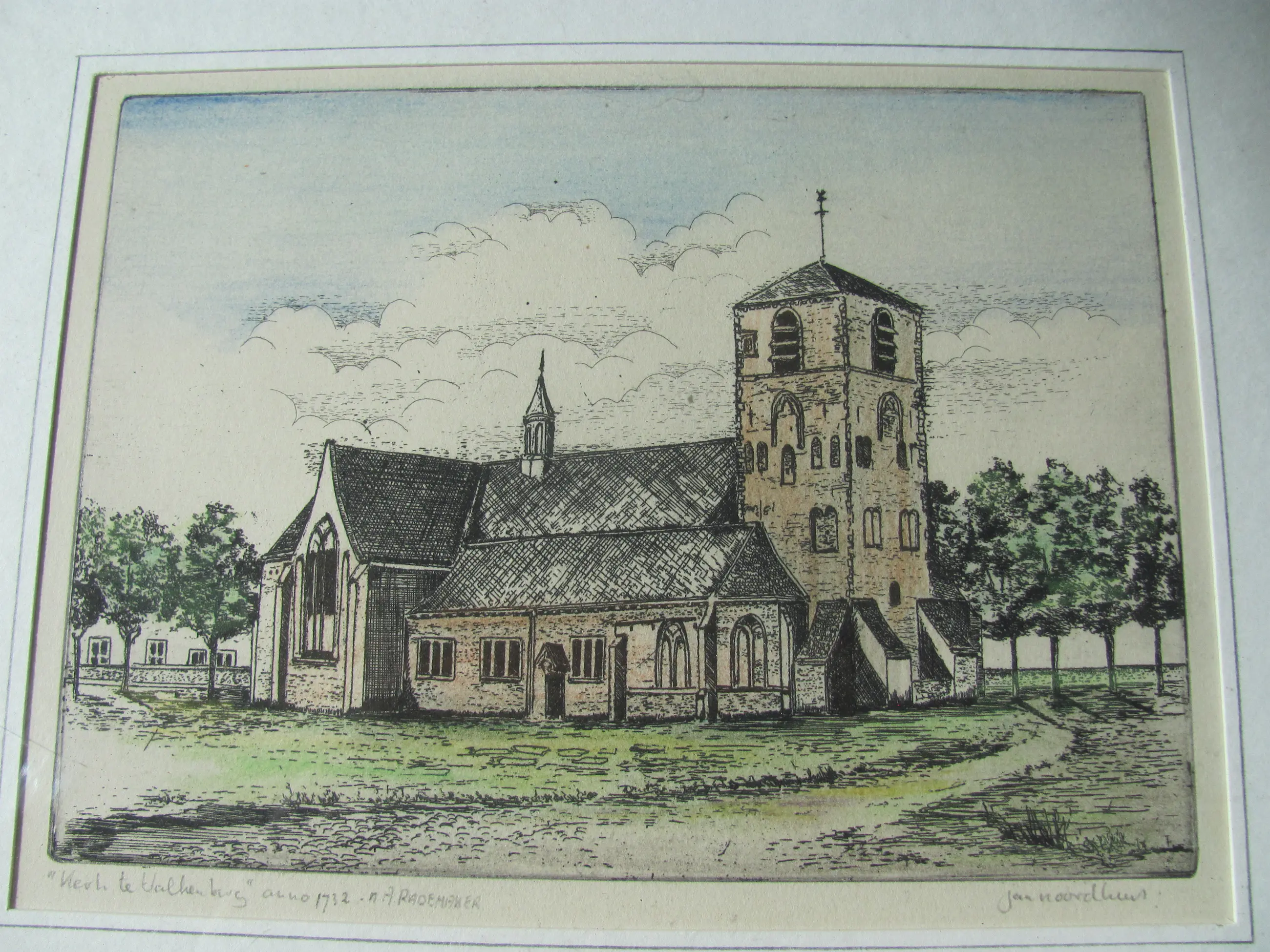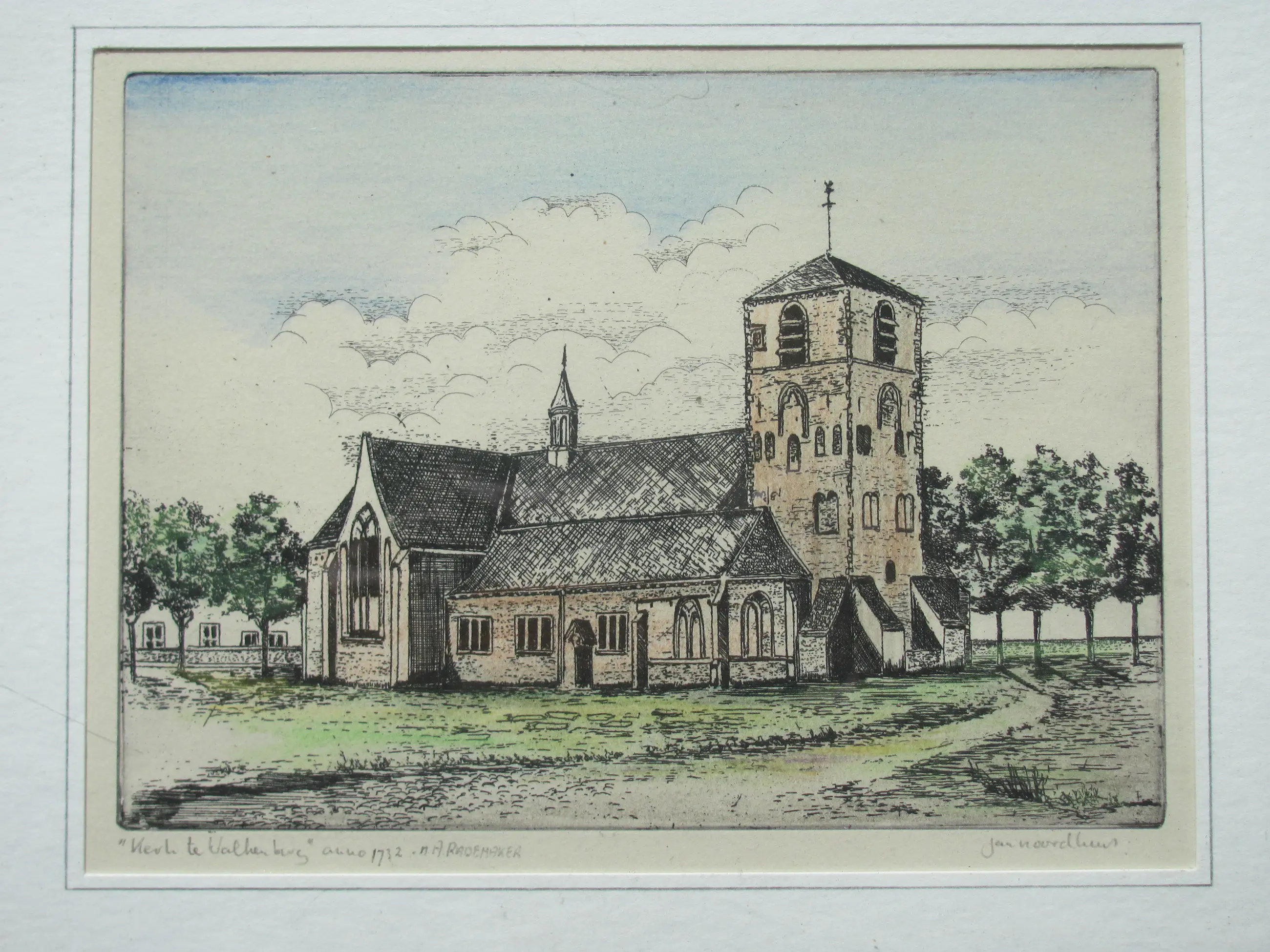 Ets van de kerk te Valkenburg (nu Katwijk) anno 1732 naar een gravure van Abraham Rademaker. Ingekleurd. Potlood getiteld en potlood gesigneerd.
