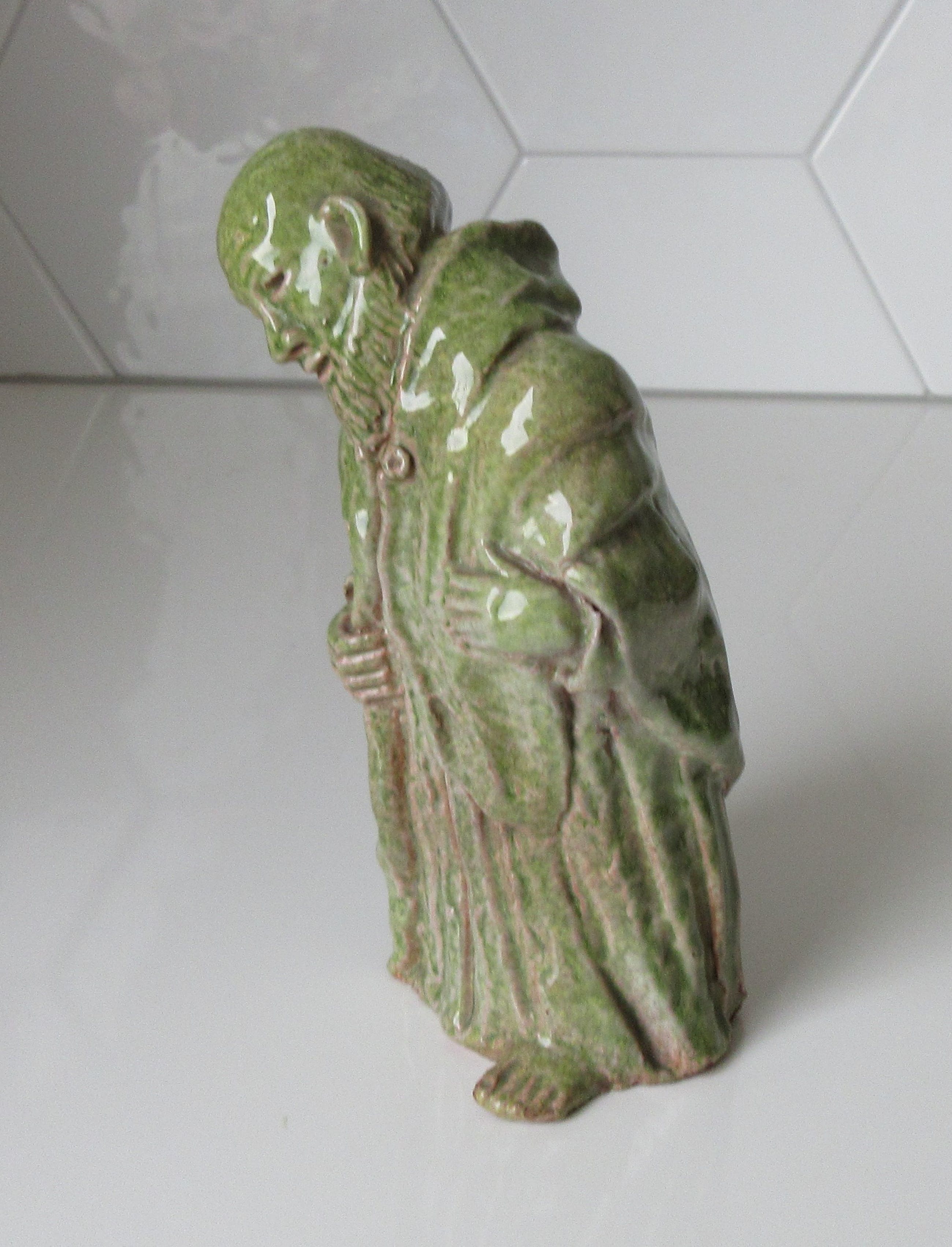 Groen rood aardewerken plastiek van oude man met stok een vroeg stuk gemaakt door de kunstenaar Jan Oosterman Jr. in zijn eigen atelier in Hilversum (Sloot) wat hij startte in 1945. Hier maakte hij ook religieuze beelden en objecten zoals crucifixen. Aan de binnenzijde gesigneerd JO. De plastiek is wel beschadigd, heeft een chip aan de zijkant en een kleiner chipje aan een van de voeten. Aan de voorzijde is er nog een minieme glazuurflinter bij de pl1astiek.