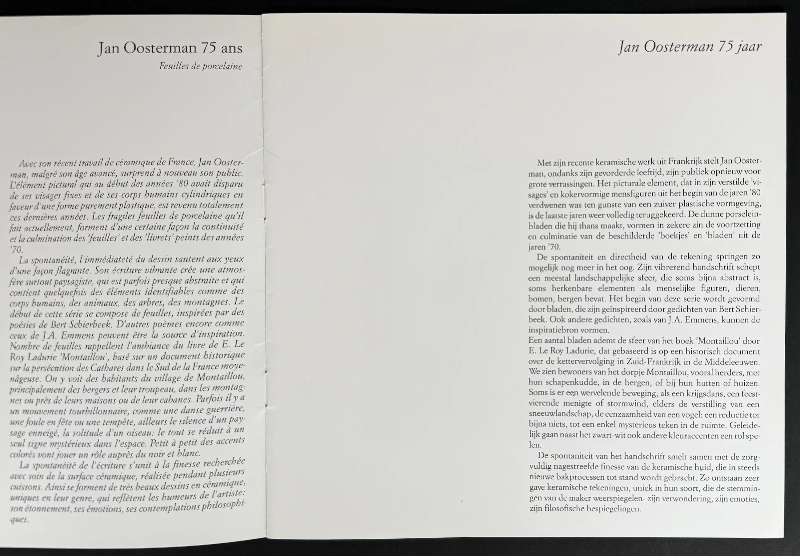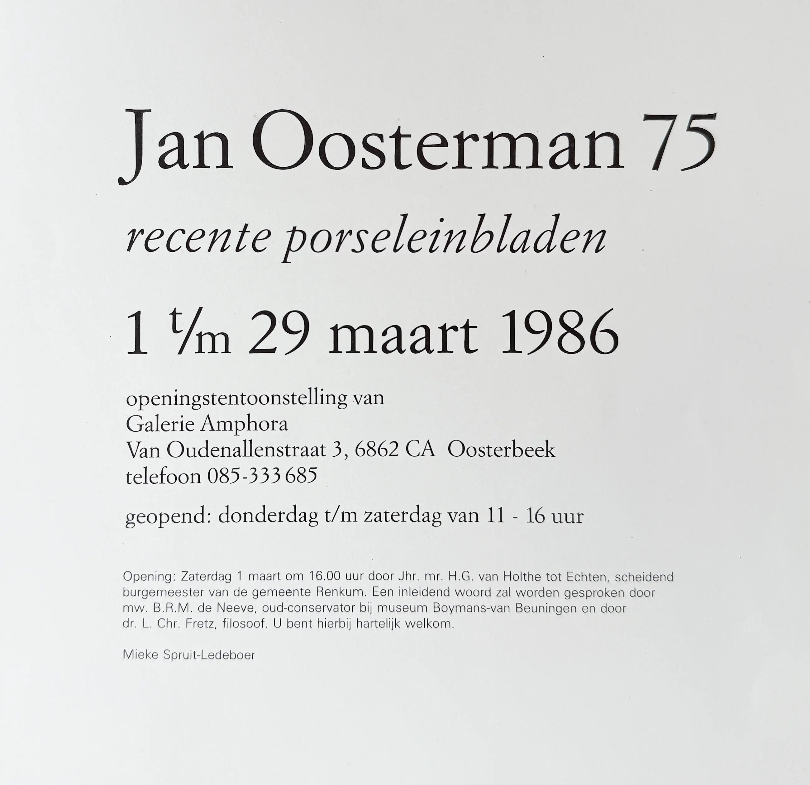 Het hier aangeboden porseleinen blad werd tentoongesteld tijdens de expositie Jan Oosterman 75: recente porseleinbladen, gehouden in Galerie Amphora te Oosterbeek in maart 1986.
