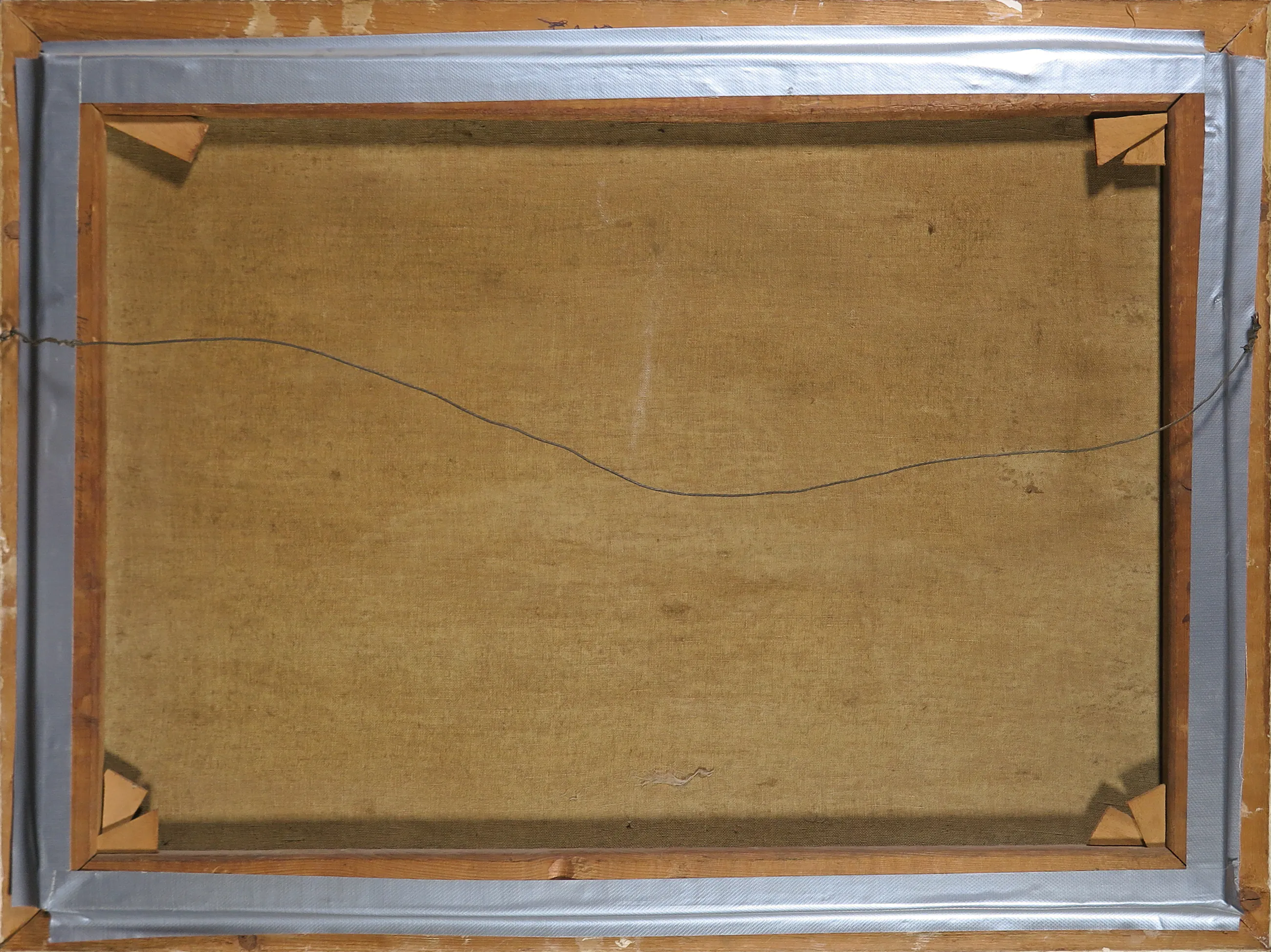Redelijke conditie. Sterke vervuiling. Scheurtjes/craquelé in de verf. Wat slijtage langs randen/hoeken.Het spieraam wordt in de lijst op zijn plaats gehouden door duct-tape. | |