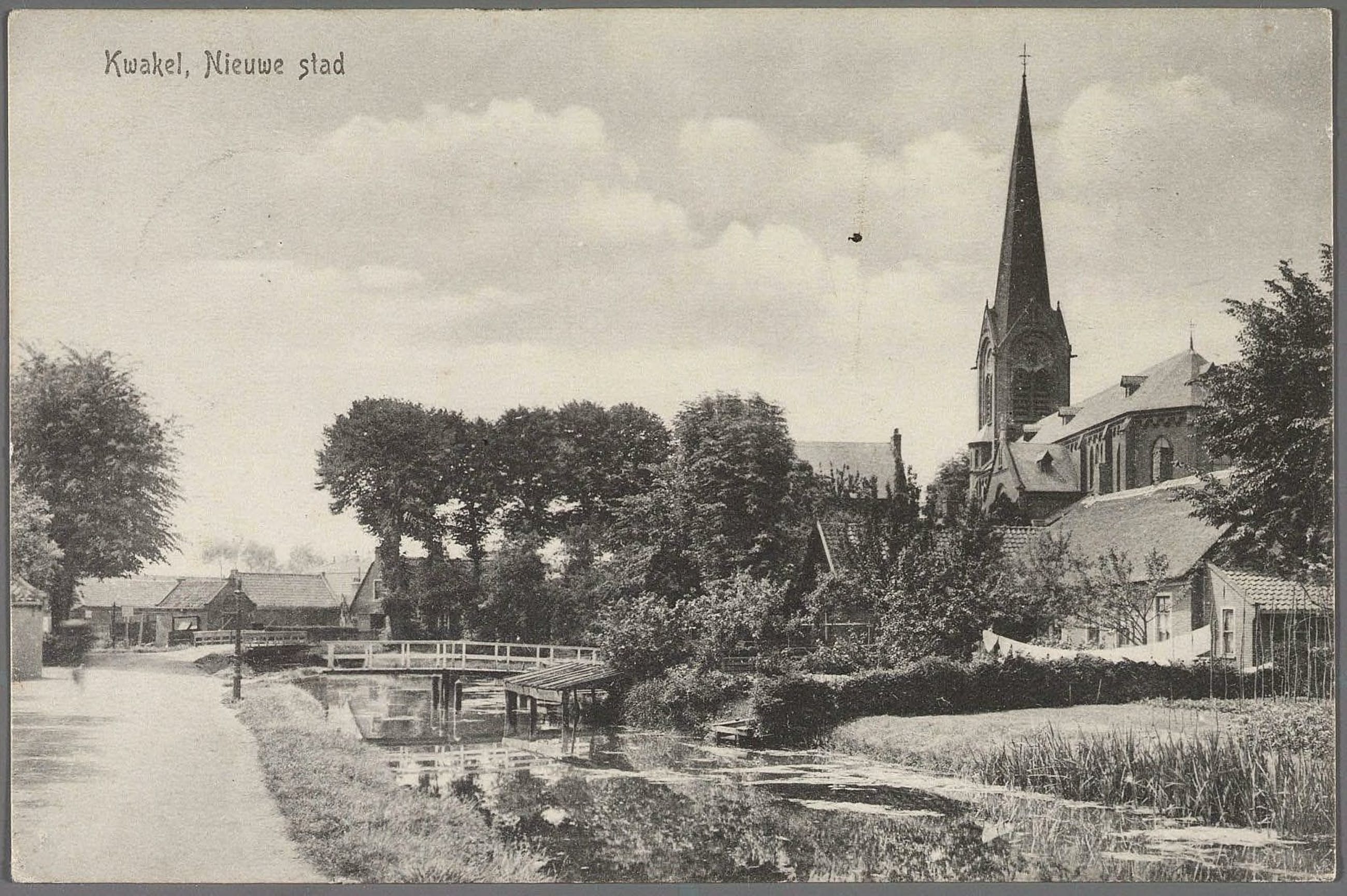 Dit prachtige werk uit 1955 geeft een historisch inkijkje in De Kwakel (gem. Uithoorn), met prominent de voormalige Rooms-katholieke St.Jans Geboortekerk in beeld. Deze kerk heeft enkele jaren erna (1958) zijn toren verloren en is uiteindelijk in 1968 gesloopt en vervangen door de huidige, moderne en kleinere versie.