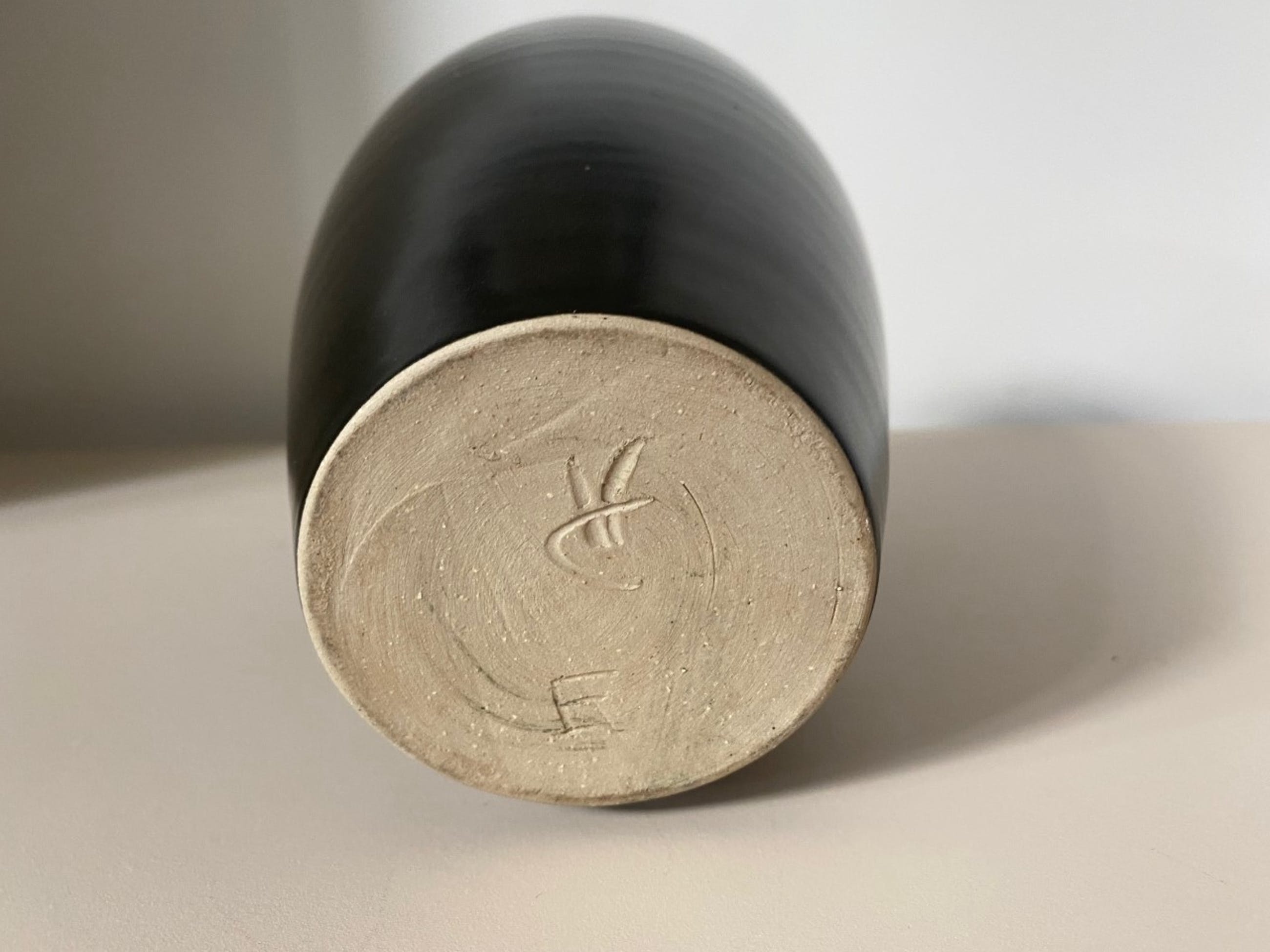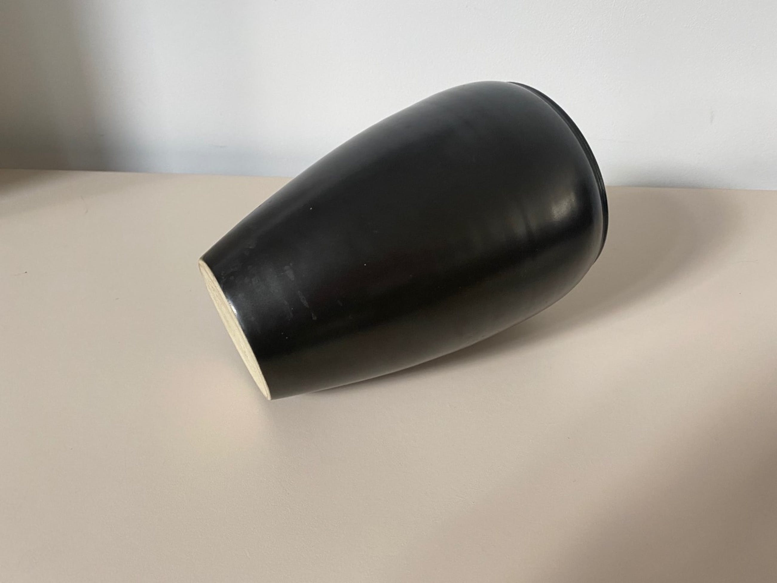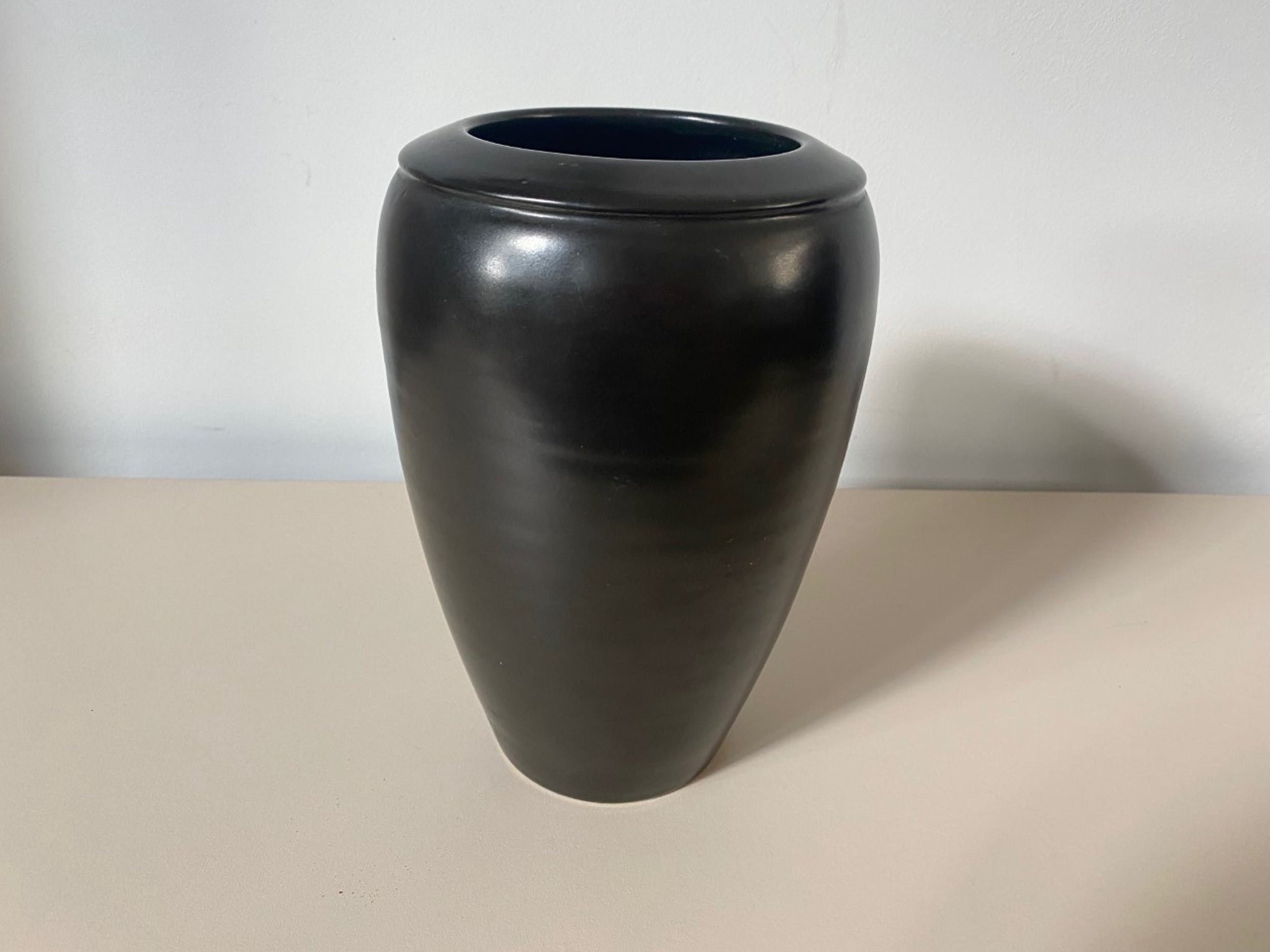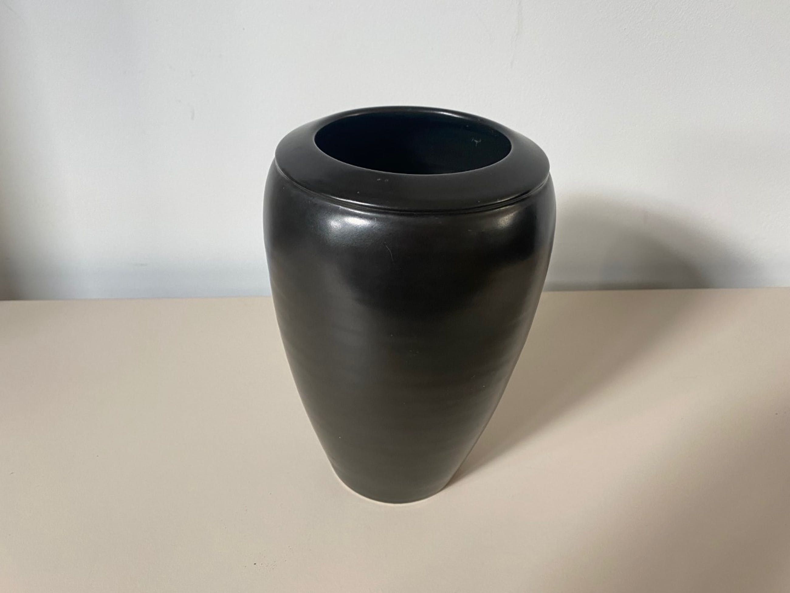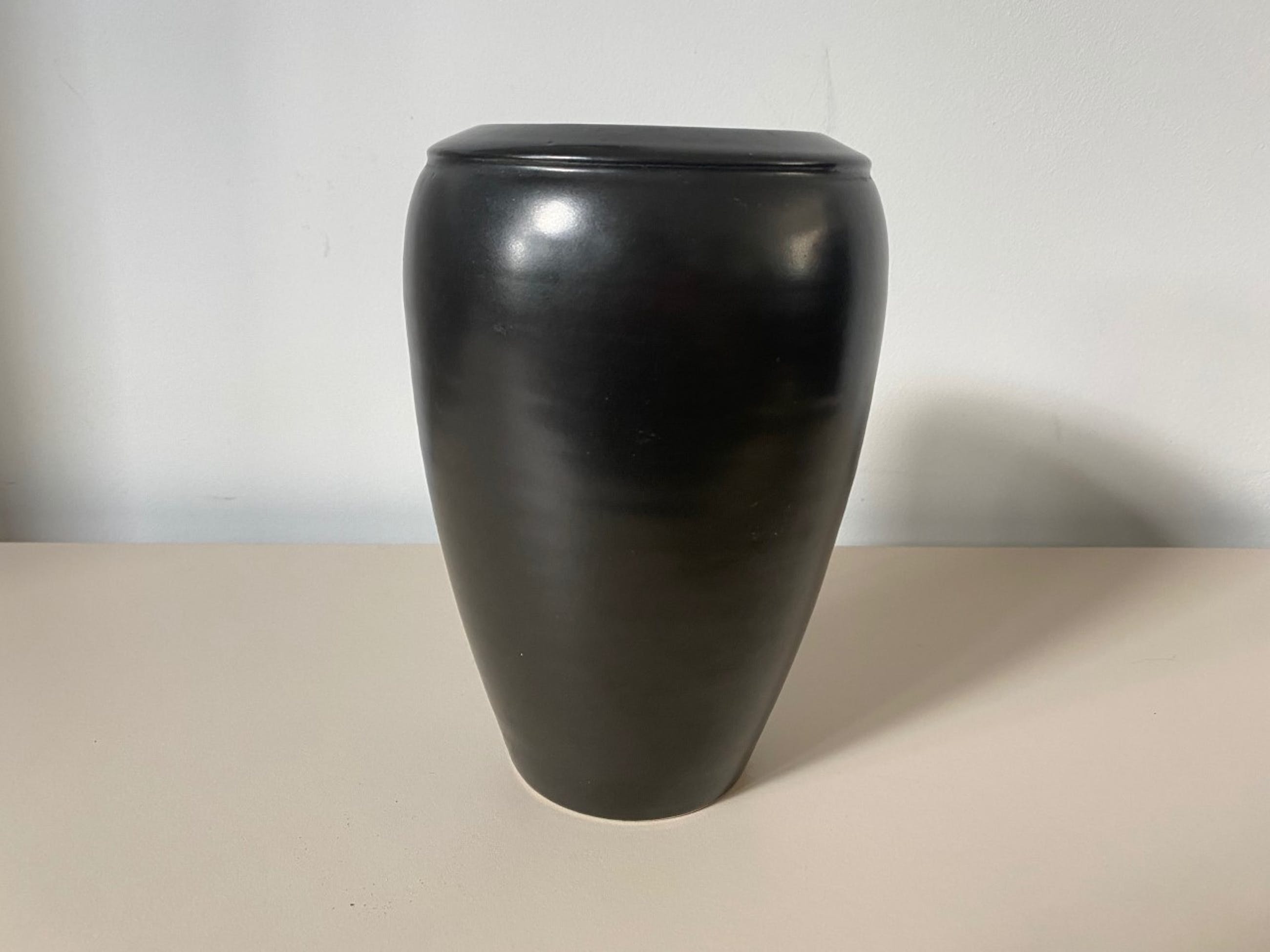 Zwarte studio keramische vaas van gres aardewerk of steengoed. Gemaakt door keramist Jan Paasman in zijn pottenbakkerij De Baardman in Vollenhove. In onbeschadigde conditie en gesigneerd JP en E. afmetingen; 20 cm hoog en 13 cm diameter.