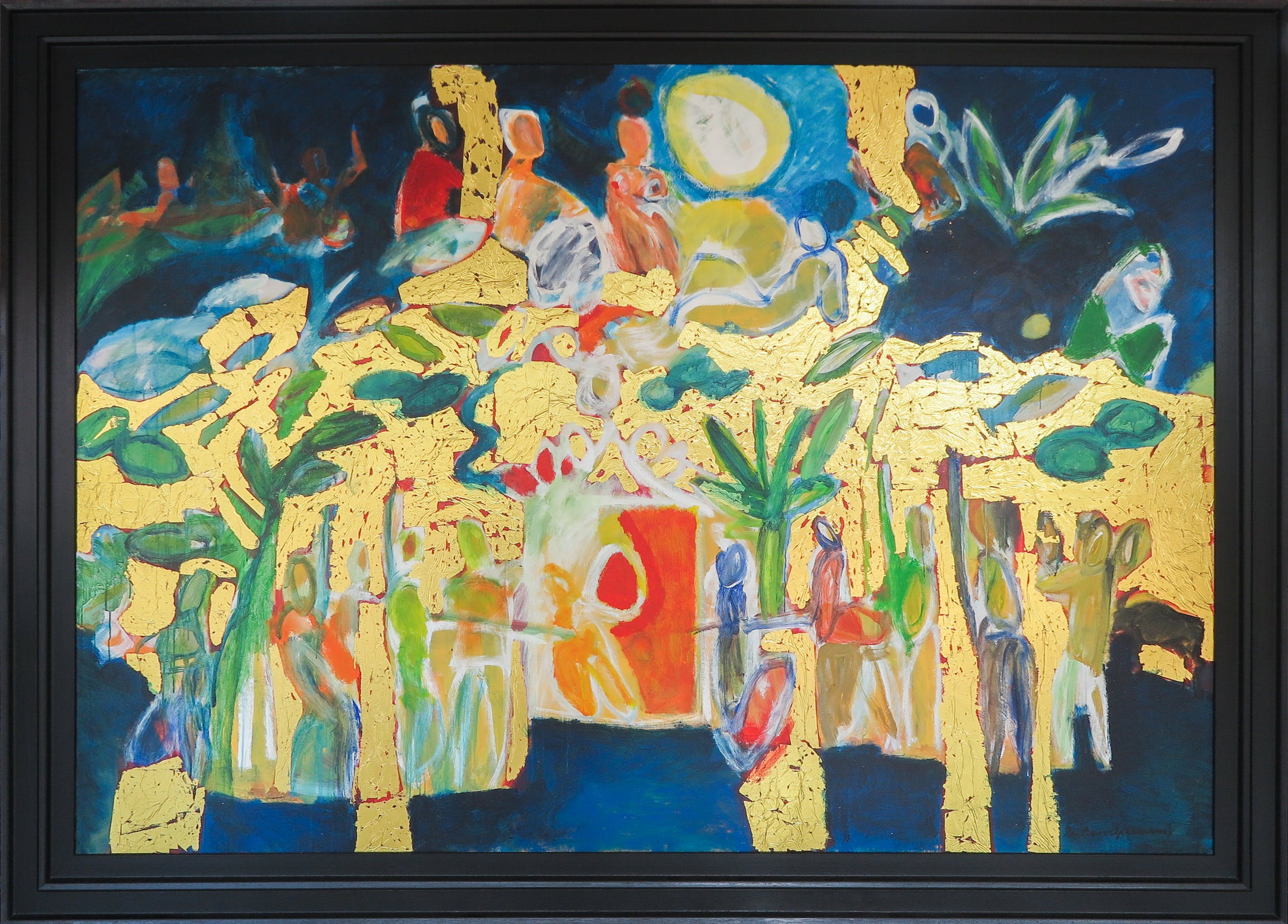 Prachtig doek, van monumentaal formaat, getiteld Banket der Goden. Het doek is rijkelijk voorzien van bladgoud, wat een mooi contrast vormt tegen de heldere kleuren van de vele figuren. Ingelijst in een nette, strakke doch klassieke, zwarte lijst.