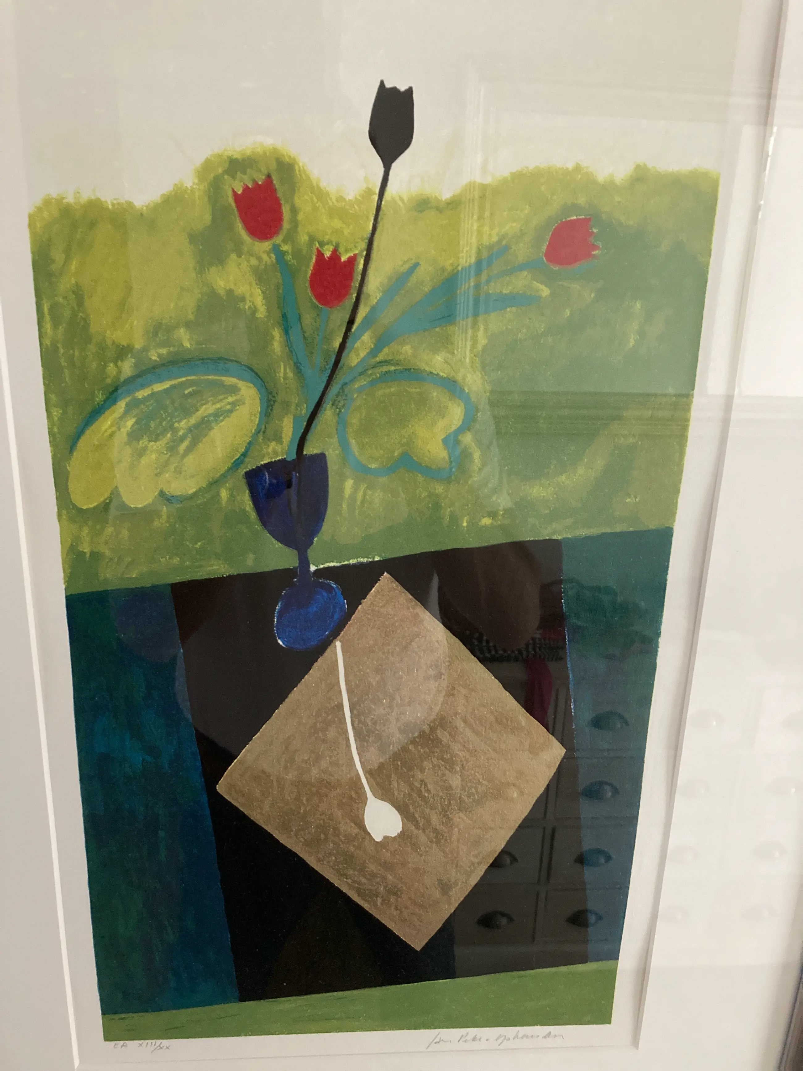 Moderne voorstelling van een vaas met tulpen op een tafel. In een zilverkleurige houten lijst ( b 3 cm en h 3 cm ). Met l.o. EA XIII/XX met potlood en r.o. Jan Peter van Opheusden met potlood.