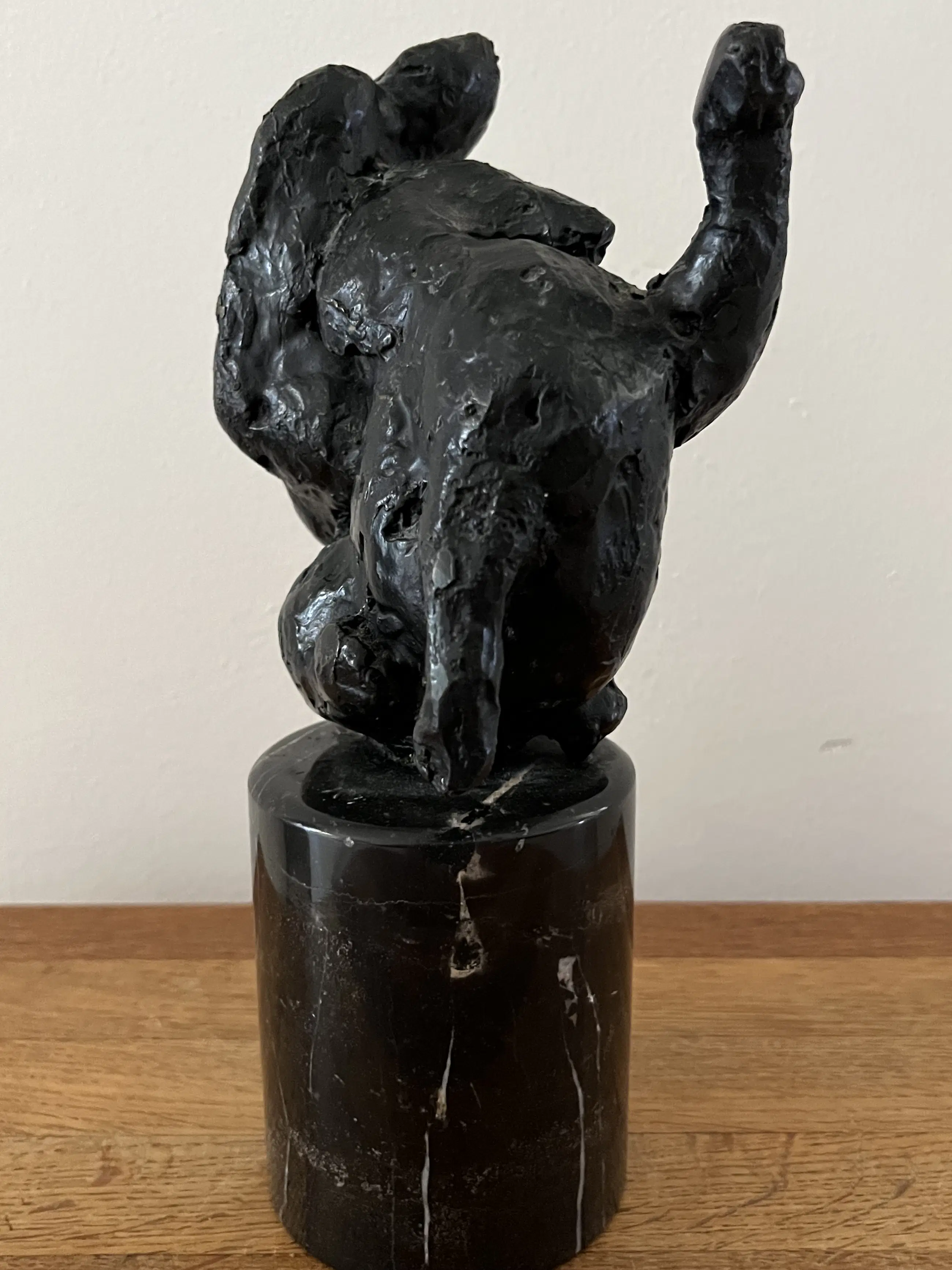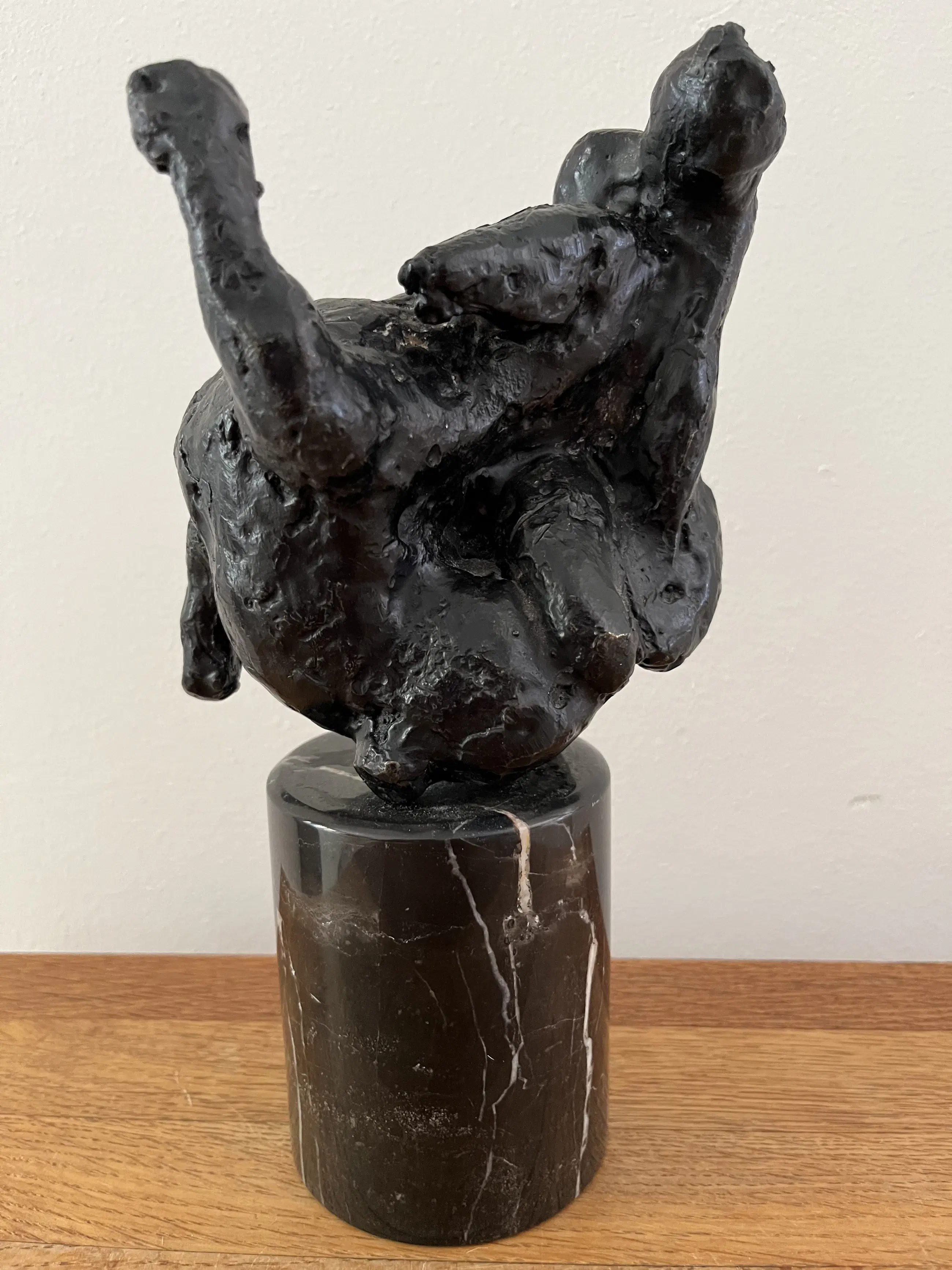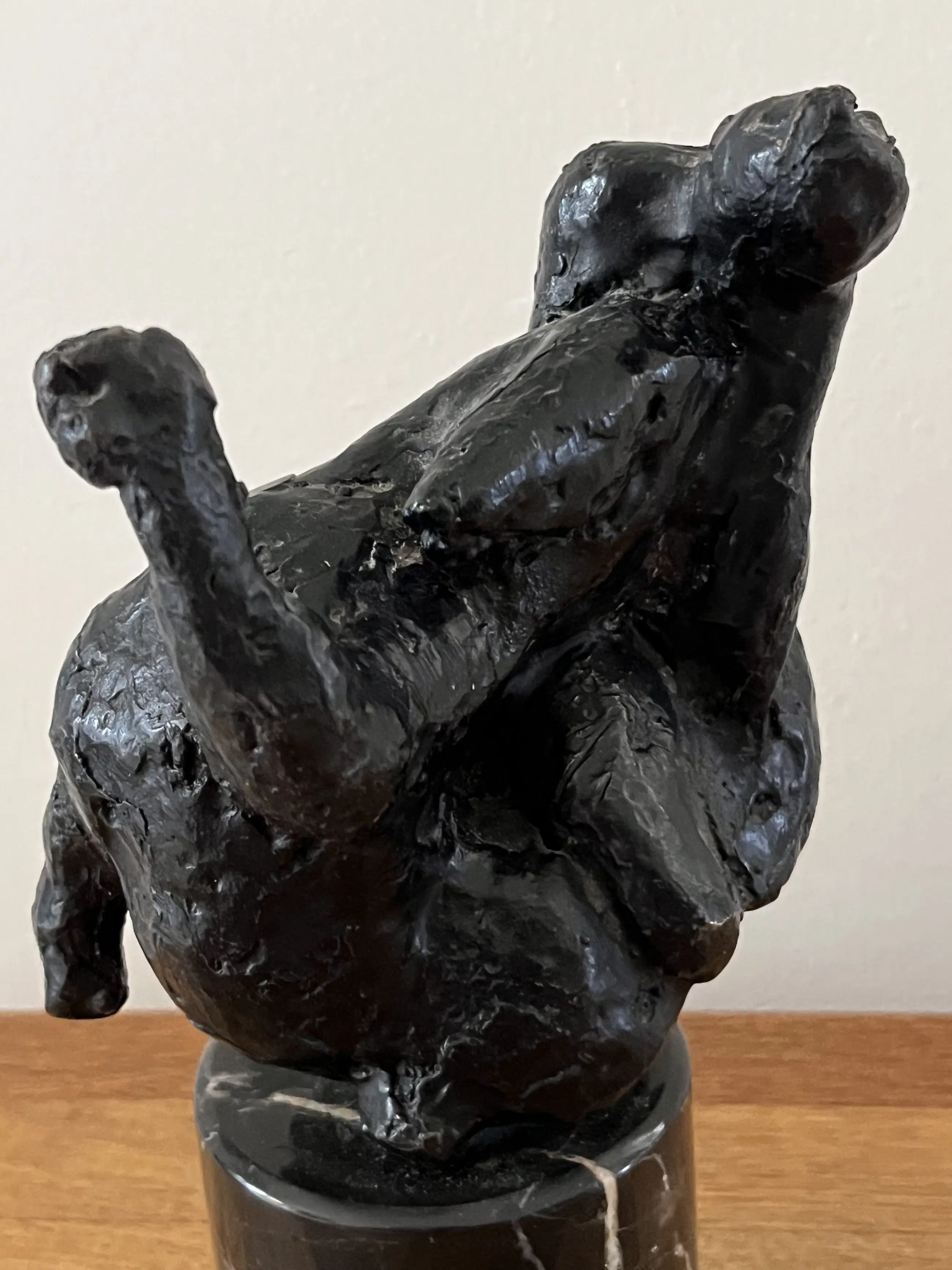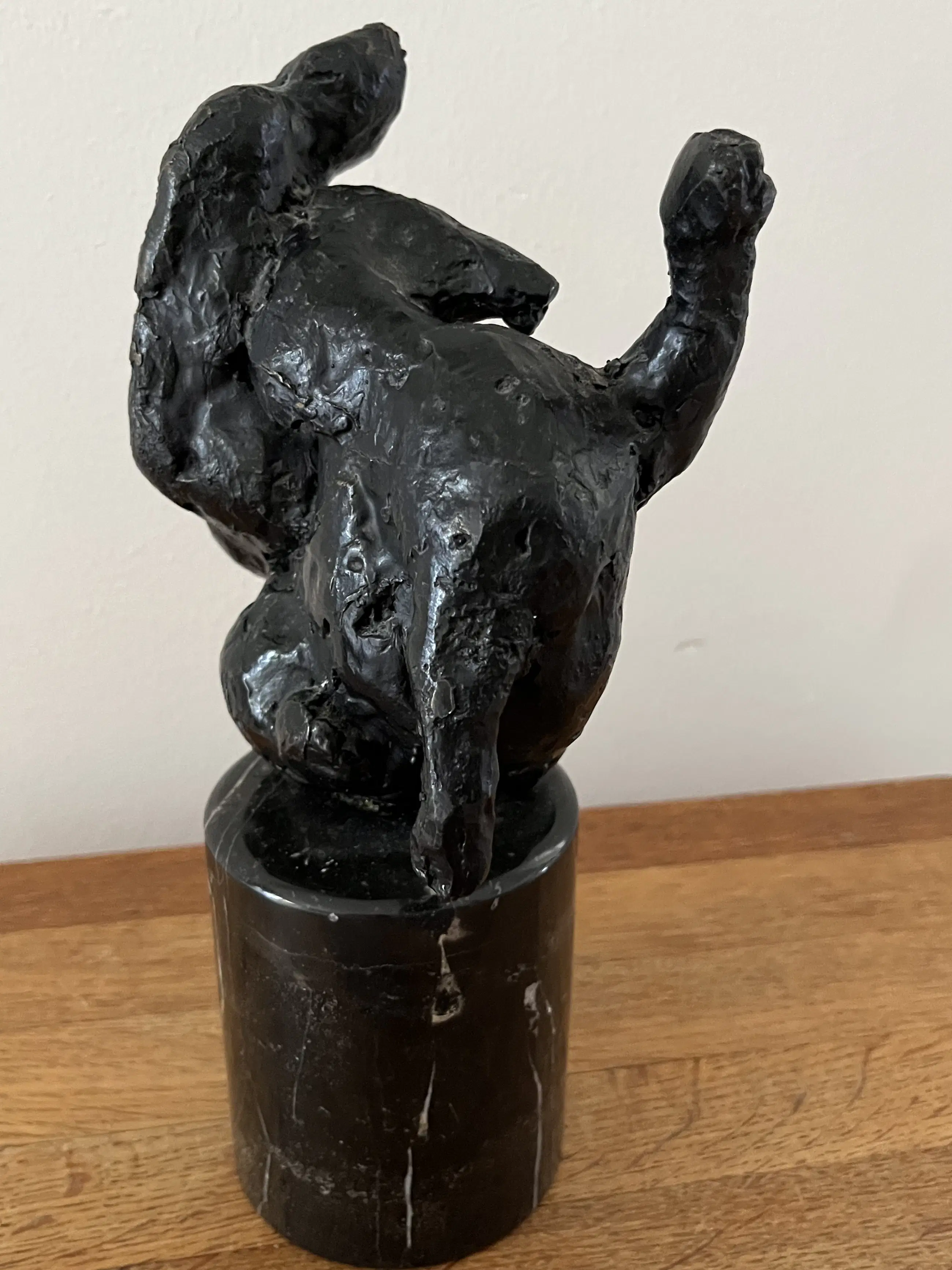 Bronzen beeld van een ruiter te paard. Beeld is op een zwarte marmeren ronde voet gezet. Afmeting beeld h x b x d. 14,5 x 12,5 x 7 cm. Voet hoog 9 cm. Doorsnede 7,8 cm. Beeld is aan achterzijde goudkleurig gesigneerd.