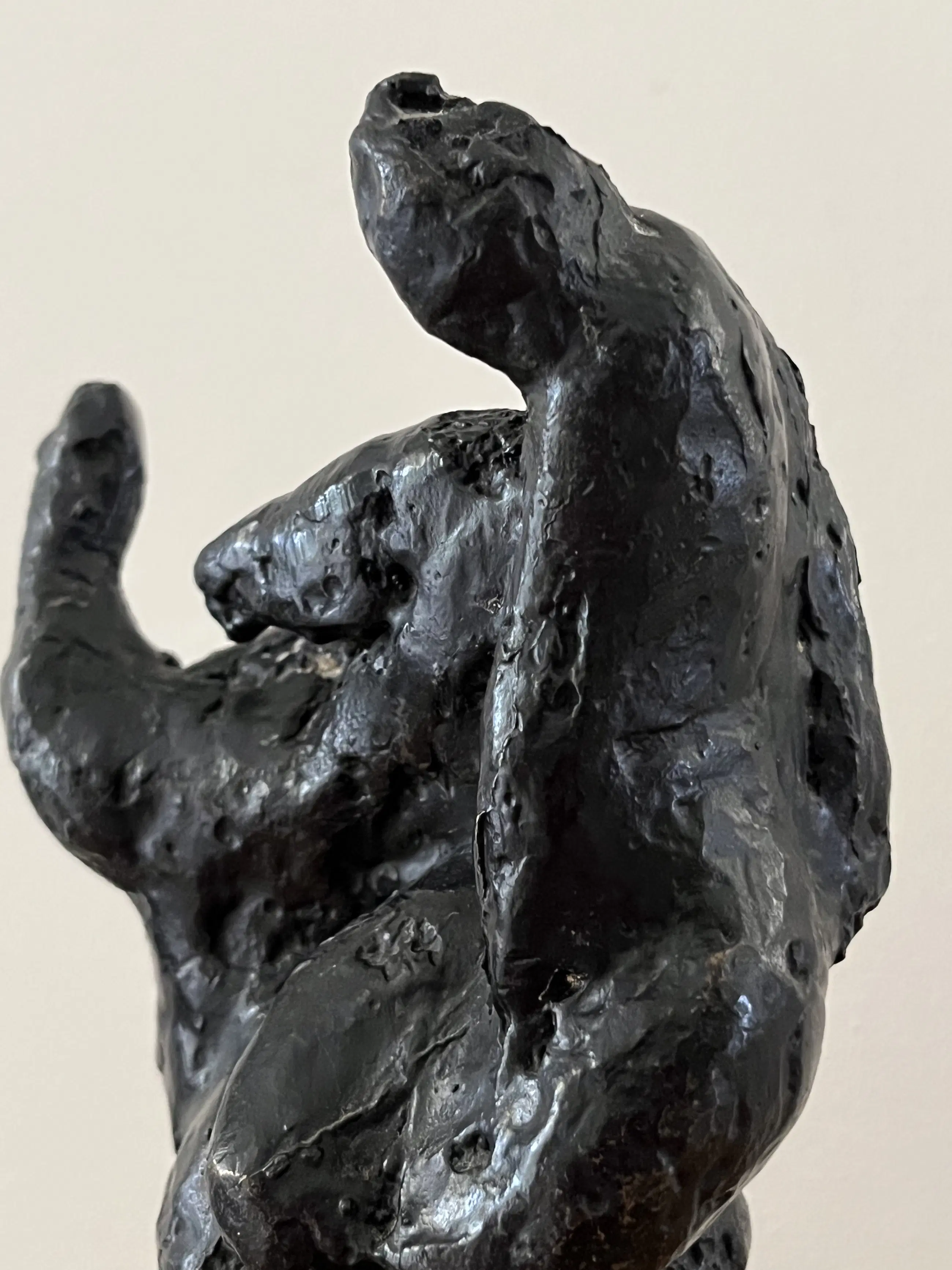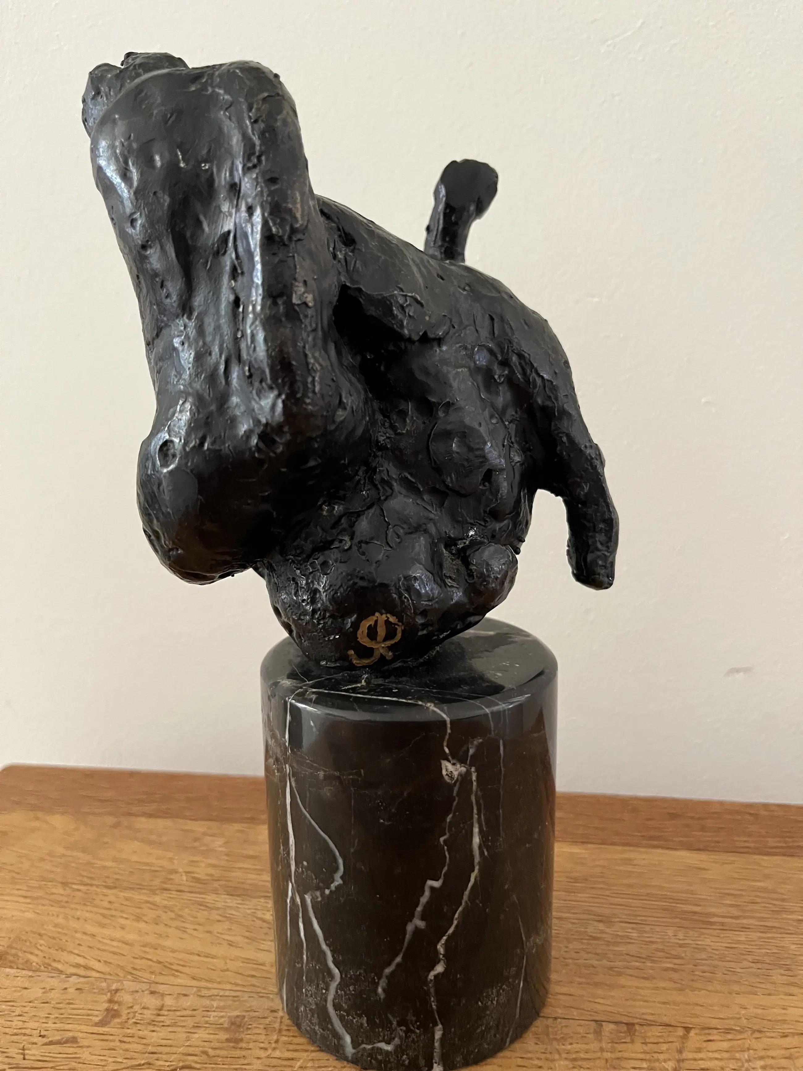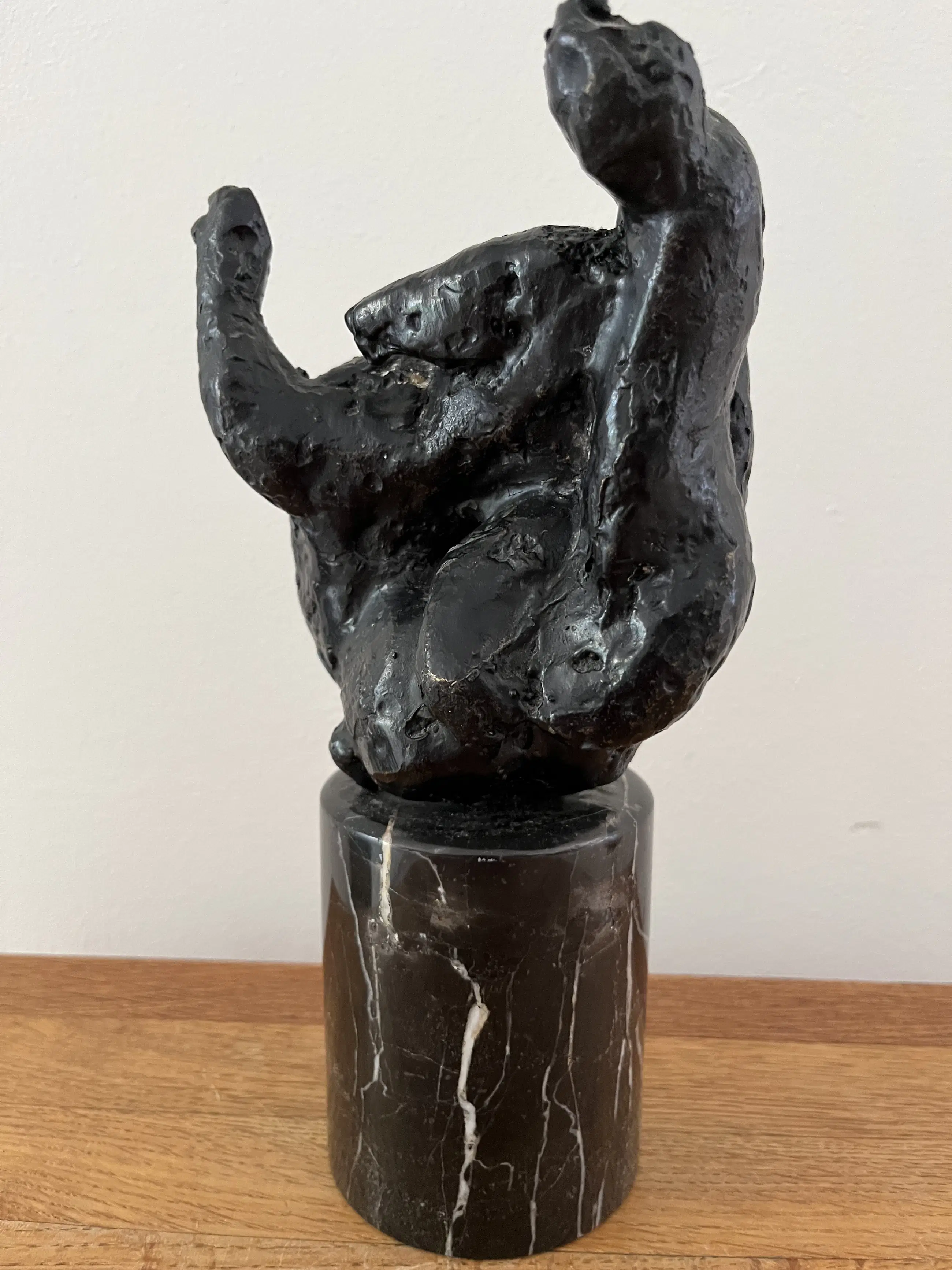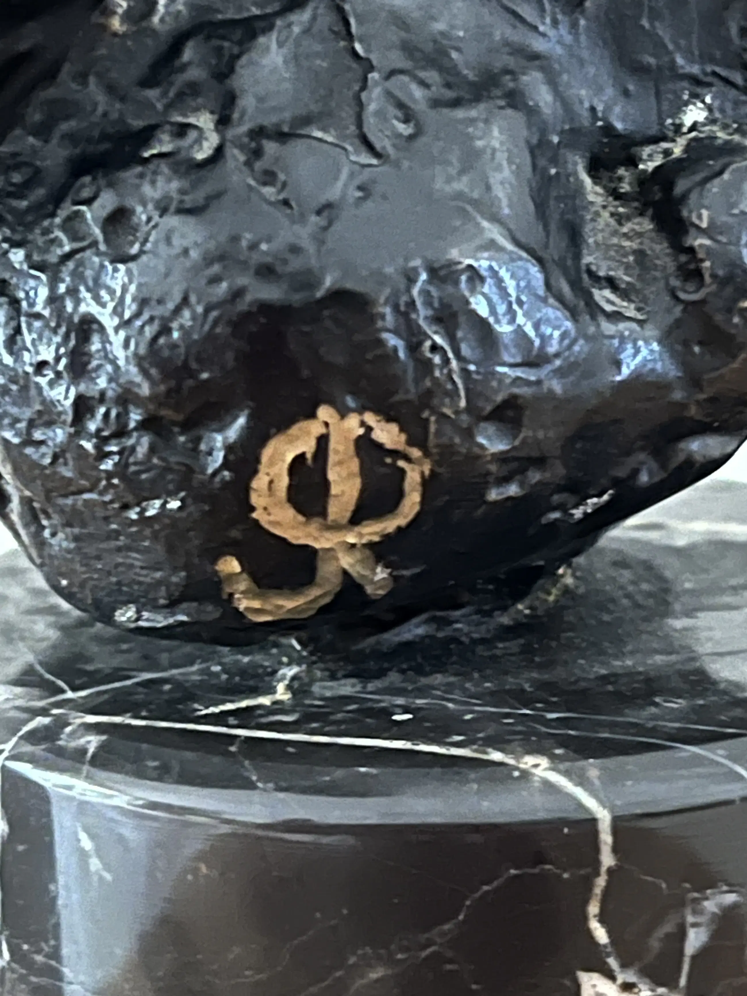 Bronzen beeld van een ruiter te paard. Beeld is op een zwarte marmeren ronde voet gezet. Afmeting beeld h x b x d. 14,5 x 12,5 x 7 cm. Voet hoog 9 cm. Doorsnede 7,8 cm. Beeld is aan achterzijde goudkleurig gesigneerd.