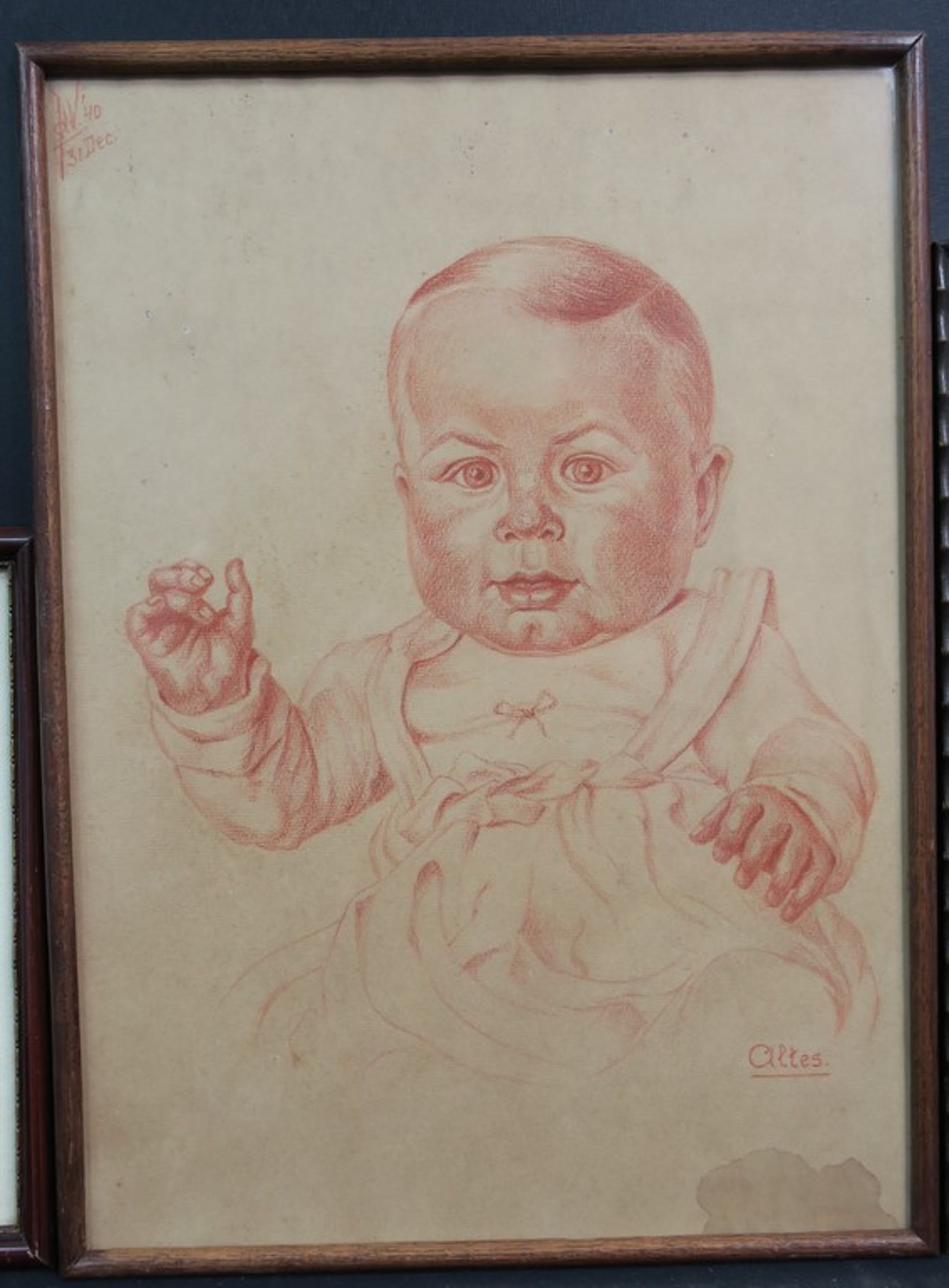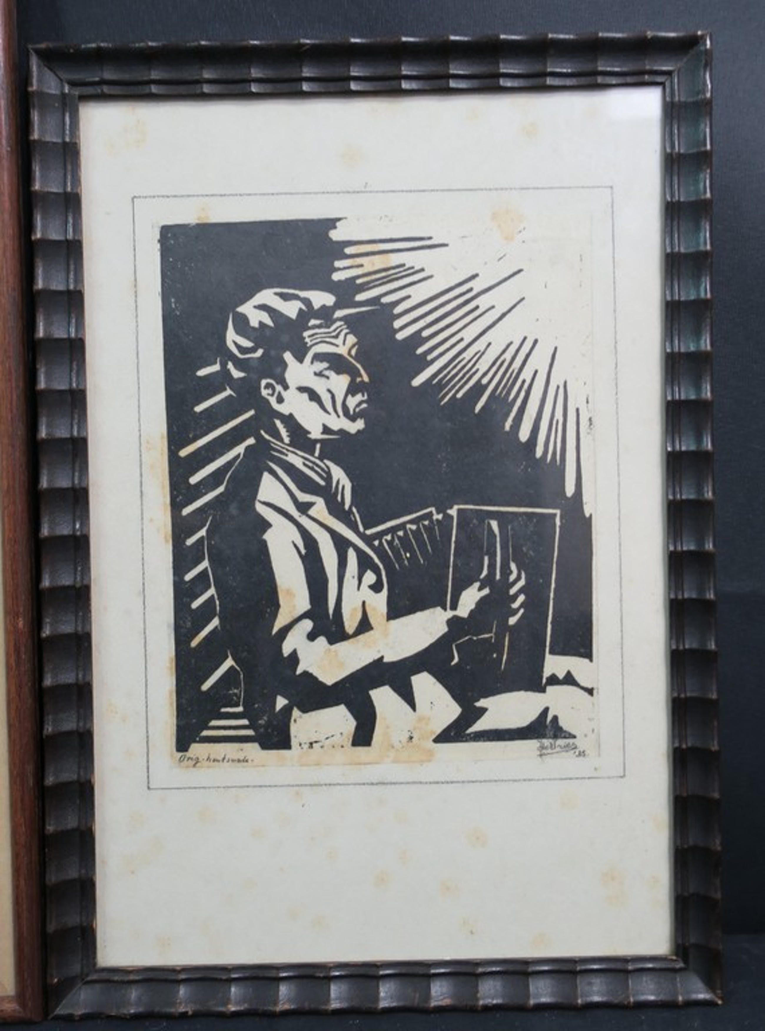 Conditie: De tekening van de vrouw is in zeer goede staat. De tekening van de baby is licht beschadigd en heeft een vochtvlek in de hoek rechtsonder. De houtsnede heeft oxidatiestippen in het blad.