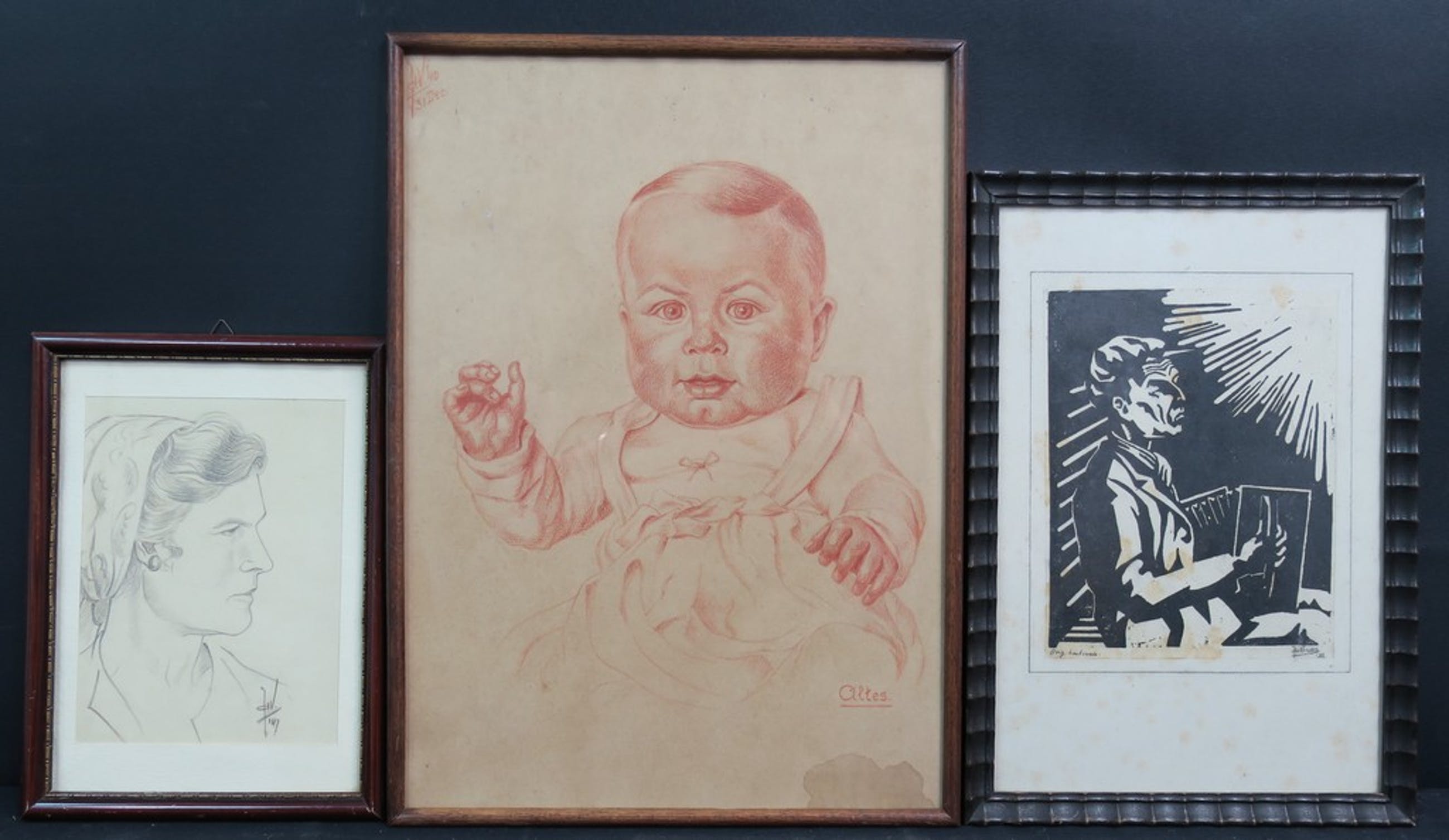 Lot met 2 potloodtekeningen en 1 houtsnede, waaronder: