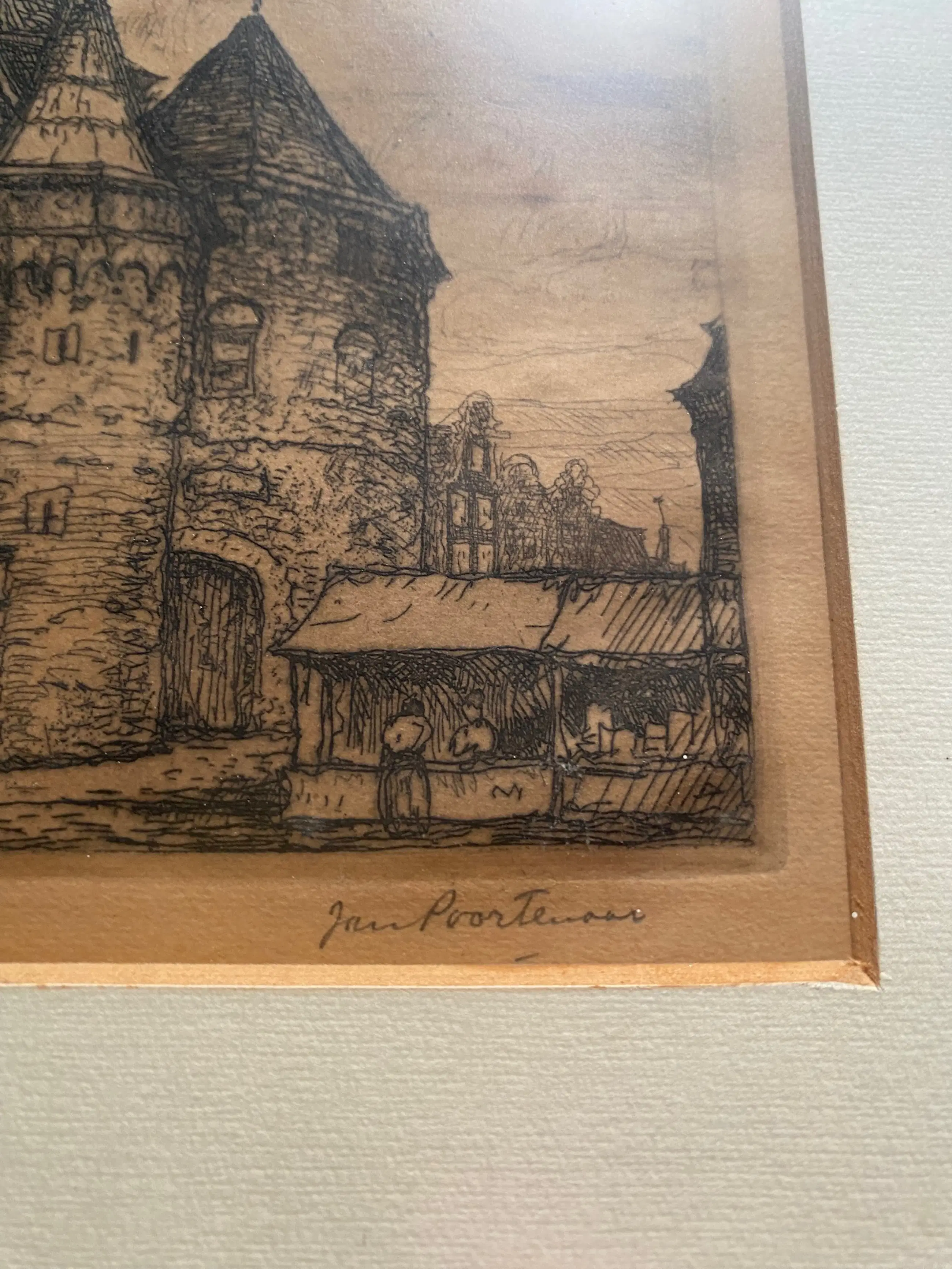 Jan Poortenaar (Amsterdam 23 juli 1886 - Naarden 15 oktober 1958). Ets voorstellende De Waag te Amsterdam. Rechtsonder in potlood gesigneerd. Linksonder No 2.