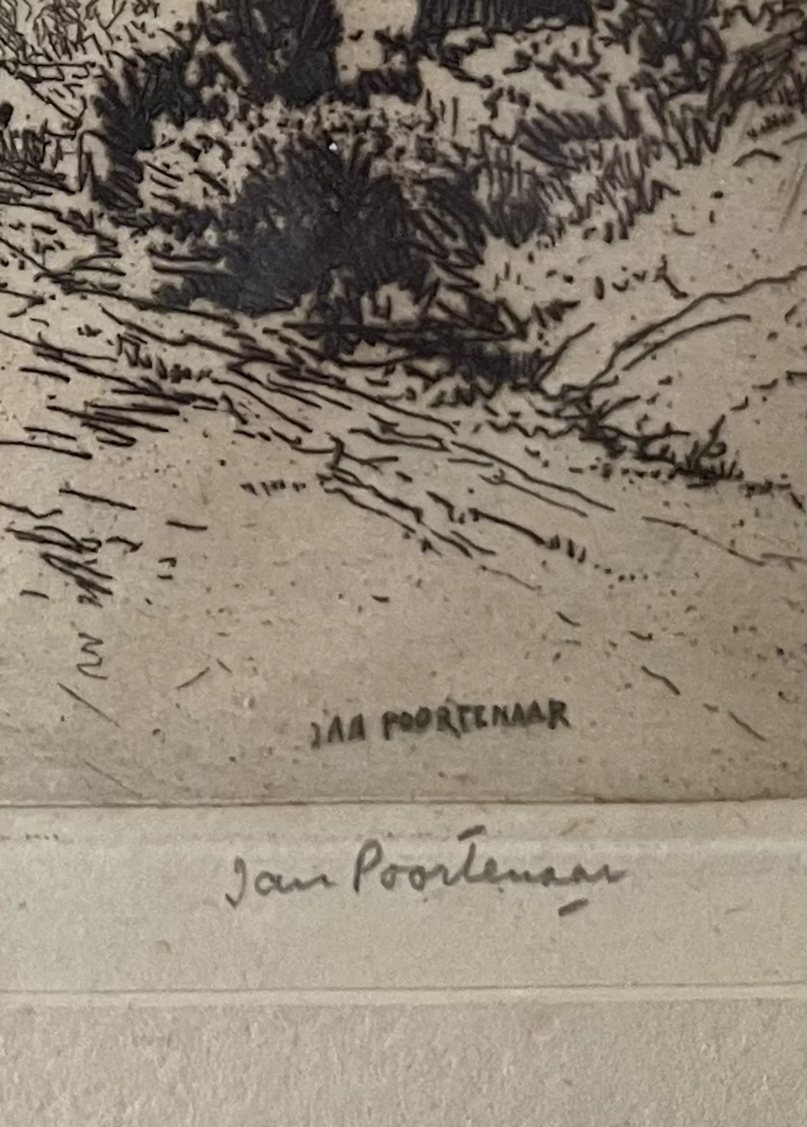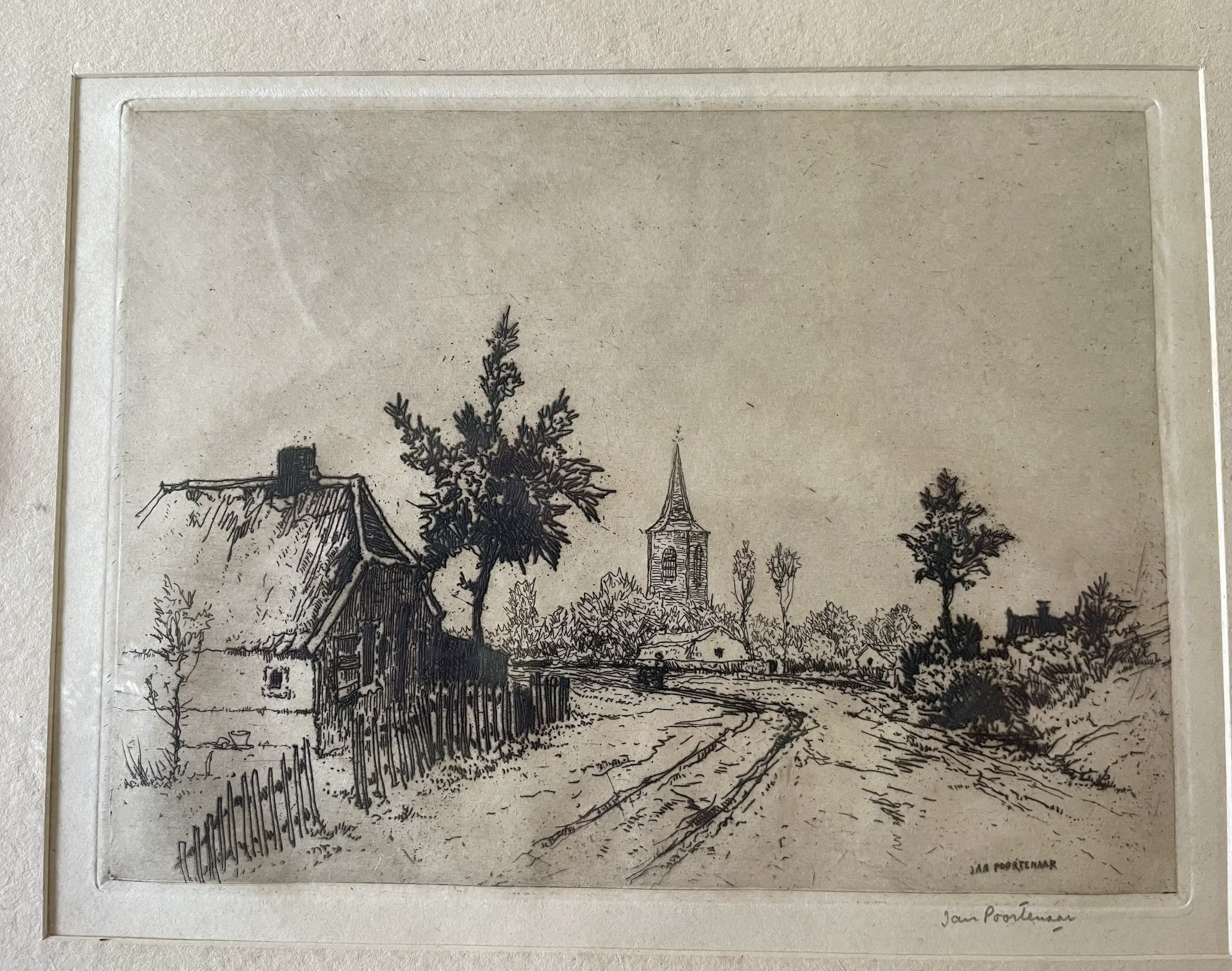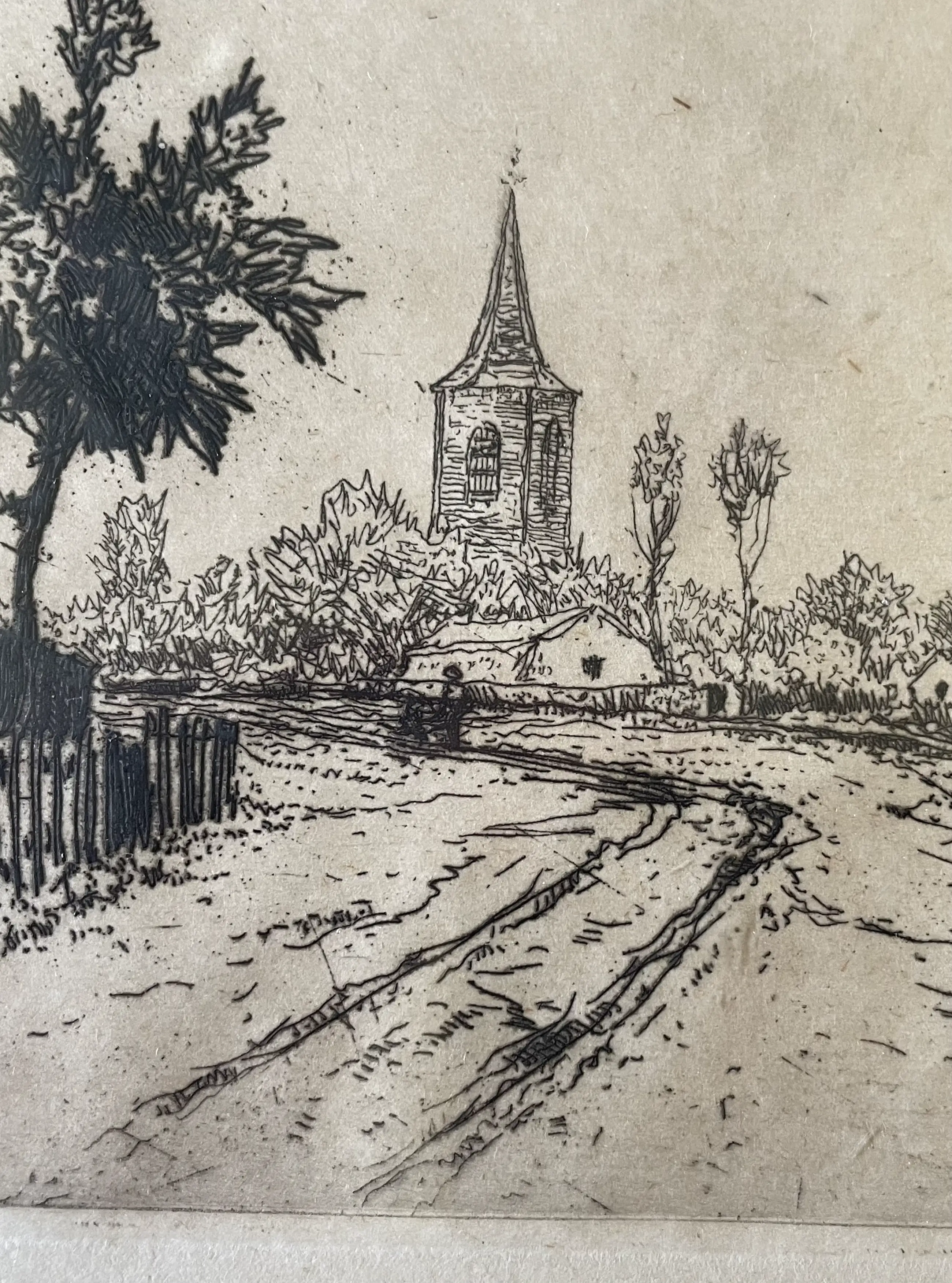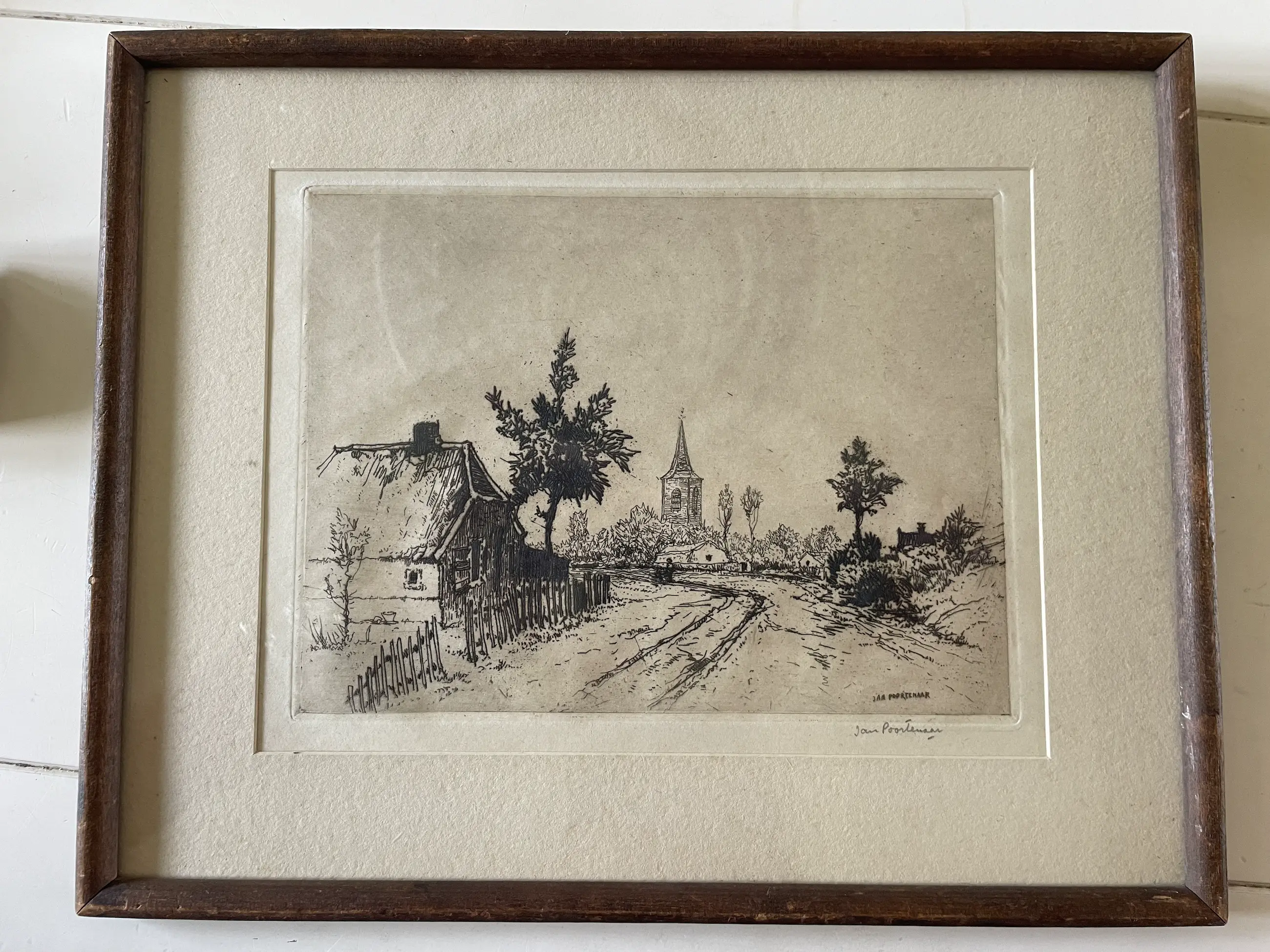 Mooie Ets van landschap / kerk / boerderij / water . Met pen op ets gesigneerd én met potlood op lijst / passé partout gesigneerd .