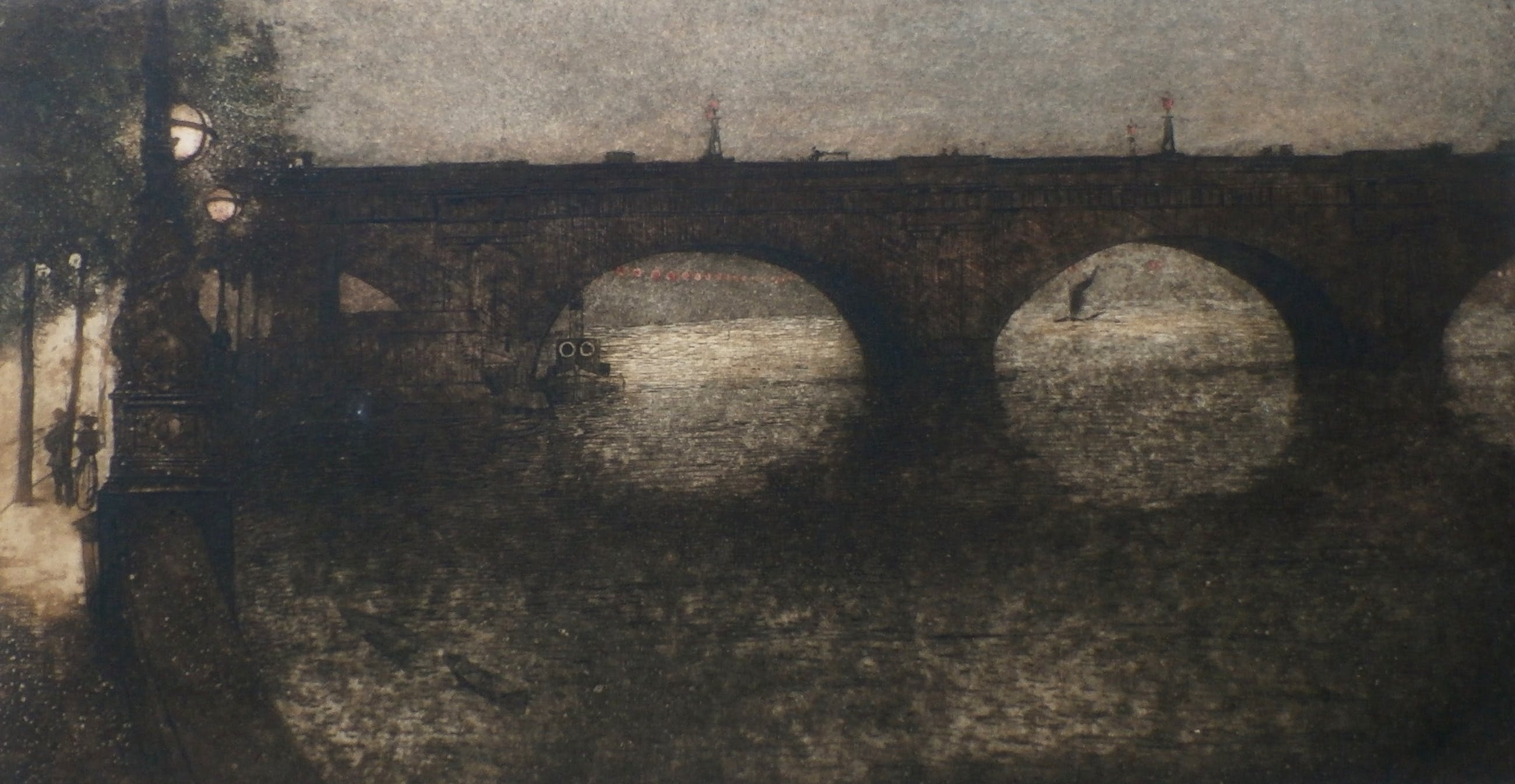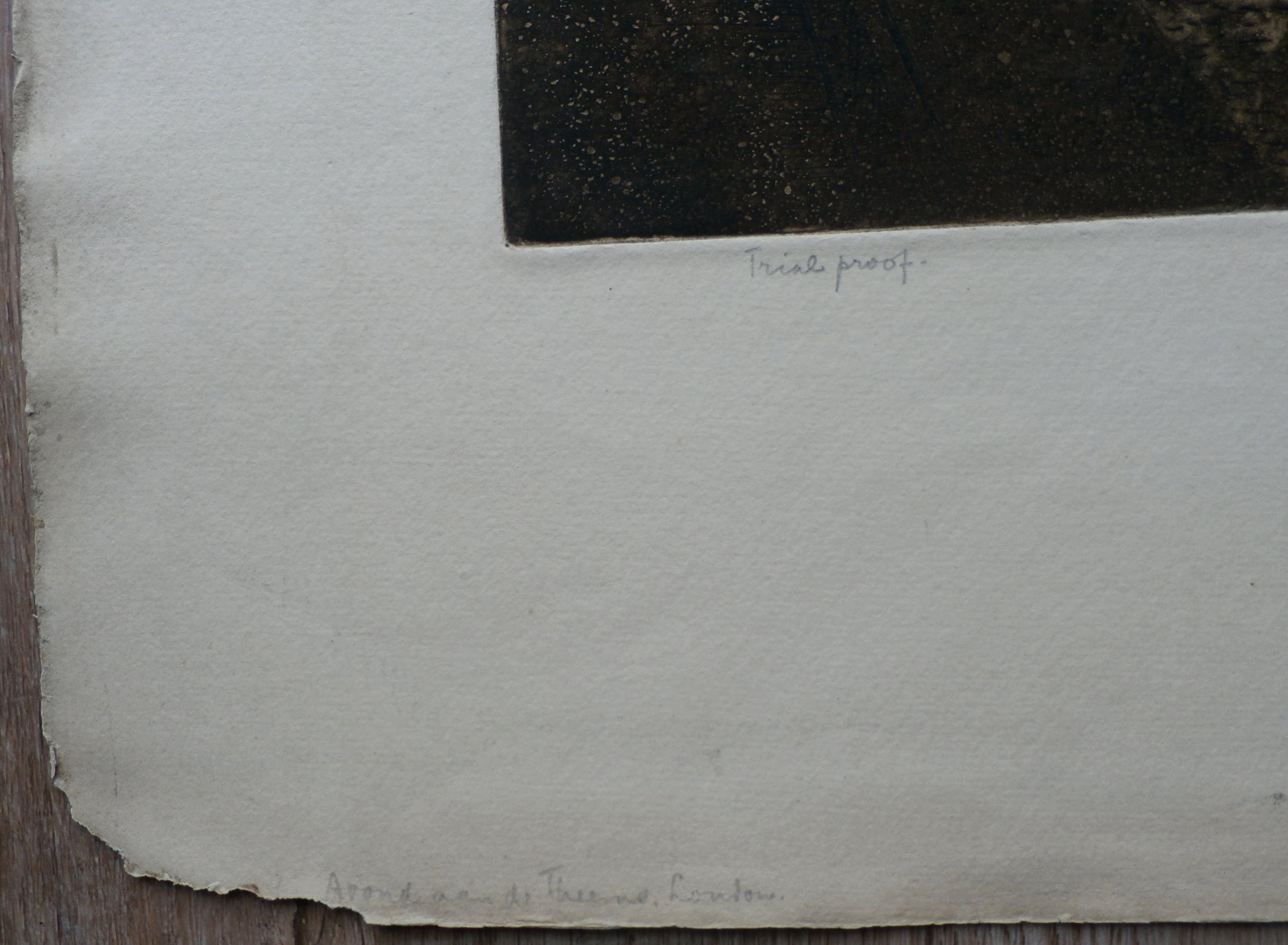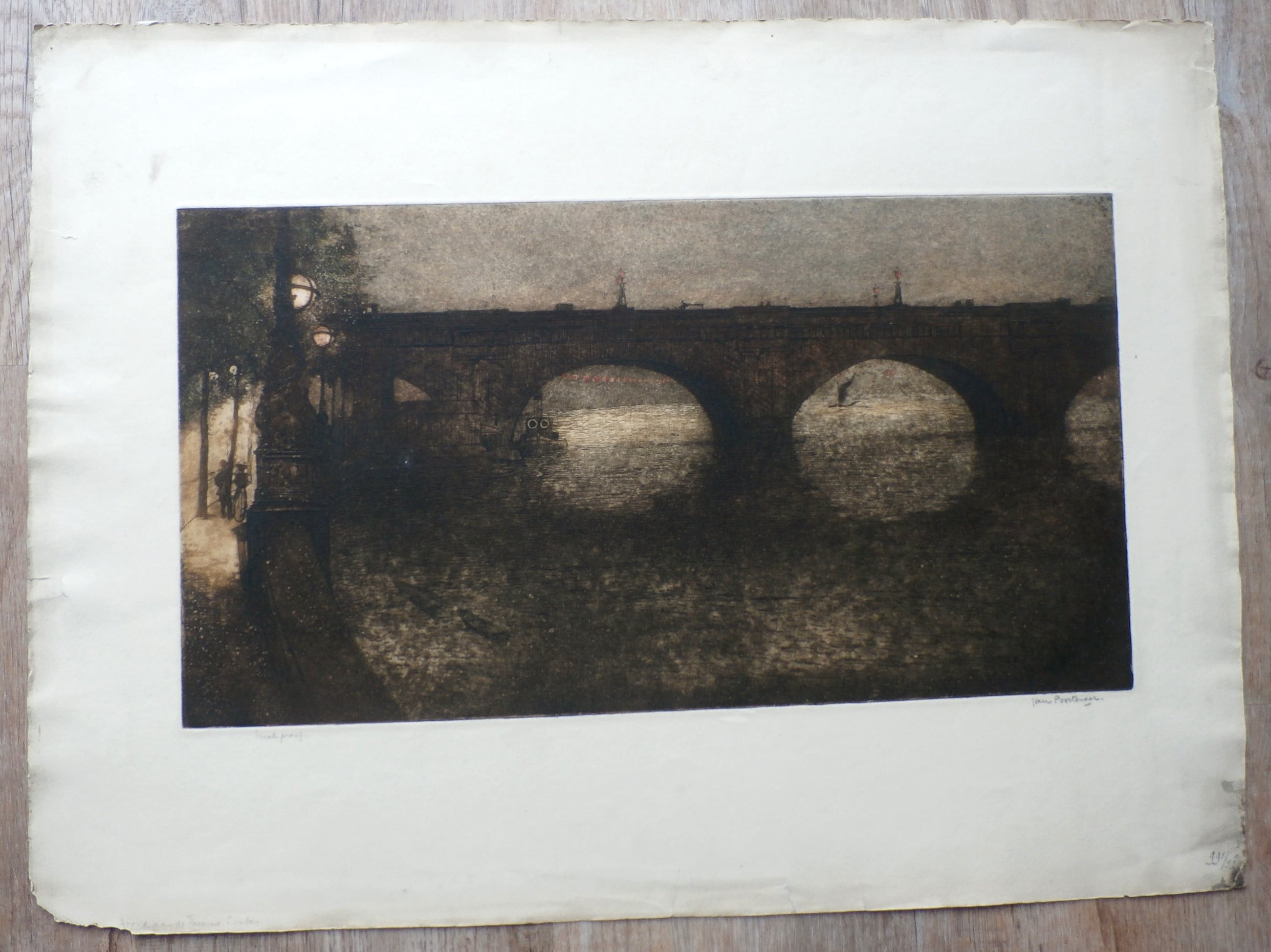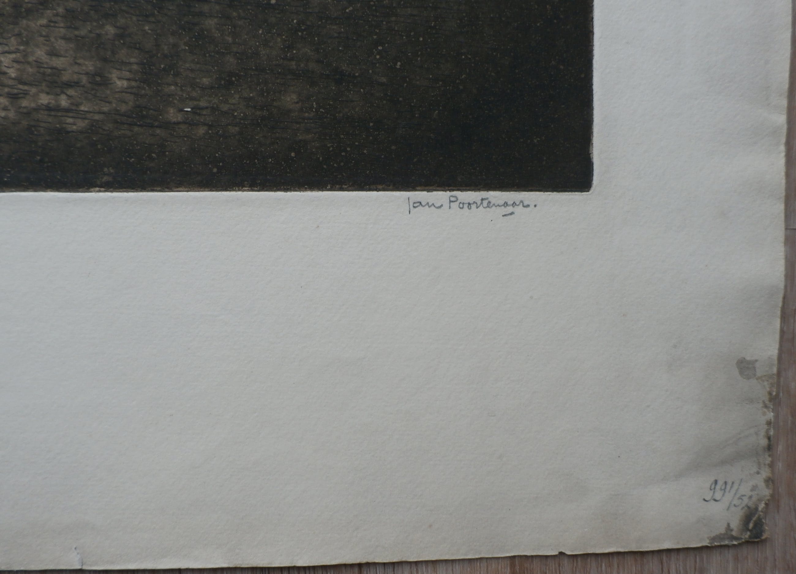 Ets van Jan poortenaar. Afmetingen blad: H52 X b68. Afmetingen voorstelling: H29 X b54. Titel: Avond aan de Theems, Londen. Het werk is rechtsonder gesigneerd door de kunstenaar. De authenticiteit van het aangeboden werk kan voor 100% worden gegarandeerd. Een certificaat van echtheid kan, op aanvraag worden meegestuurd. Conditie: ingoede staat. De randen om het werk zijn wat verkleurd/vergeeld en er zitten wat scheurtjes in. Er zitten wal plakresten op de achterzijde van een vorige inlijsting. Goed ingelijst valt dit in de lijst/onder de passepartout.
