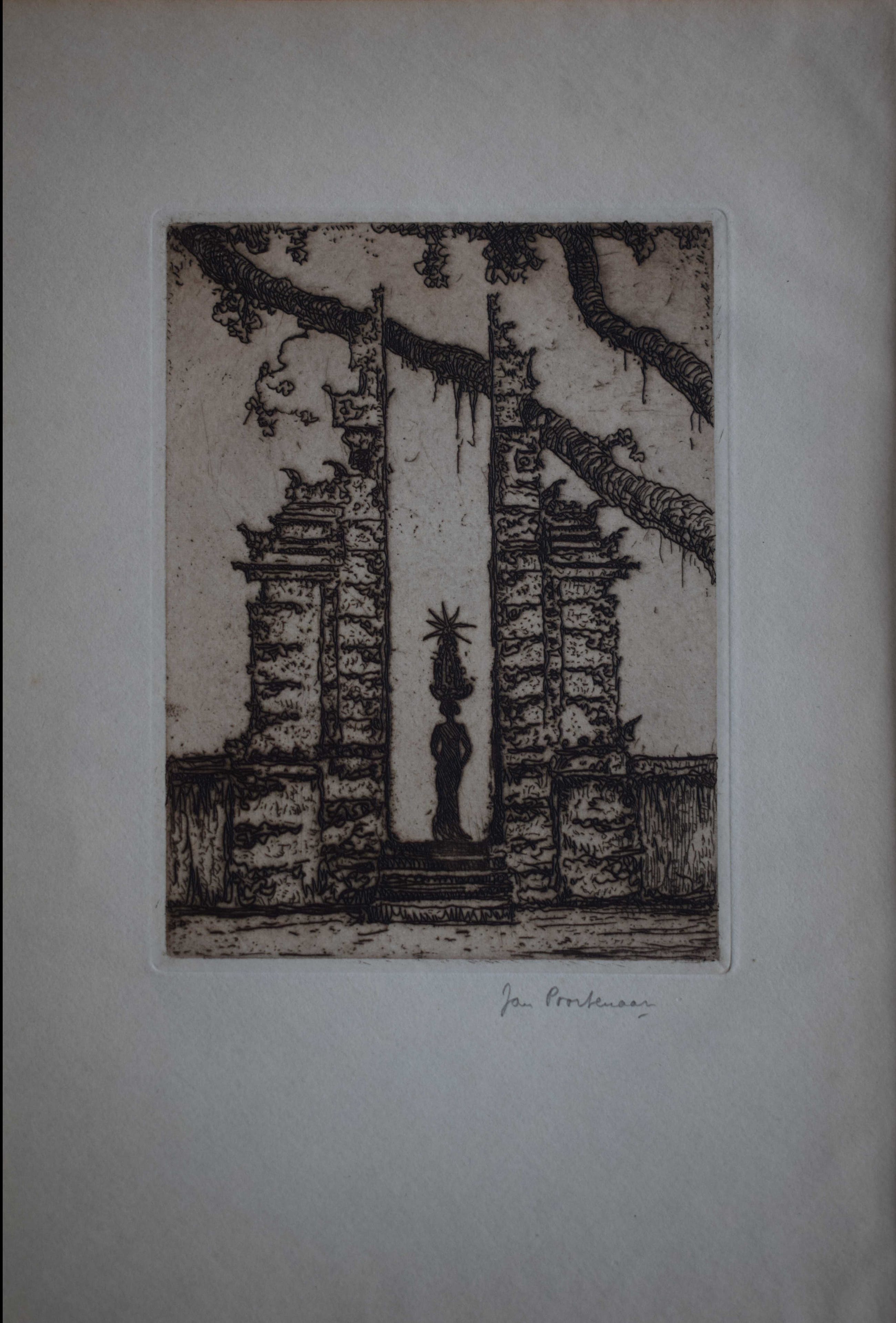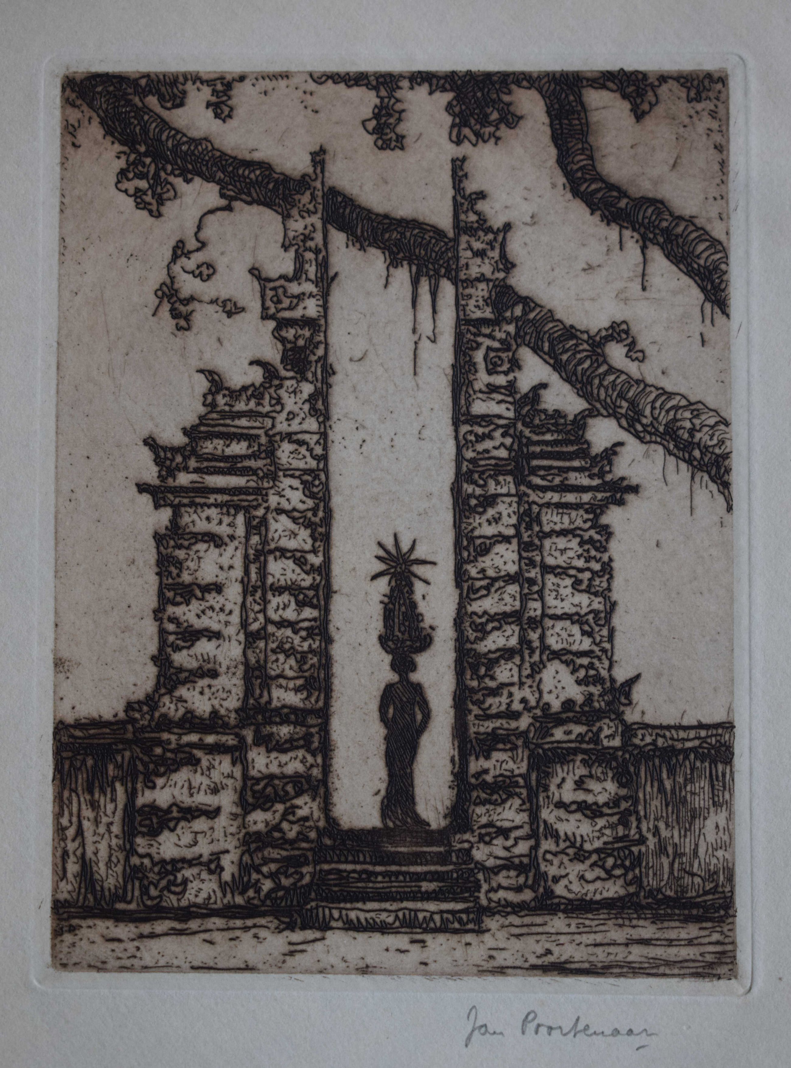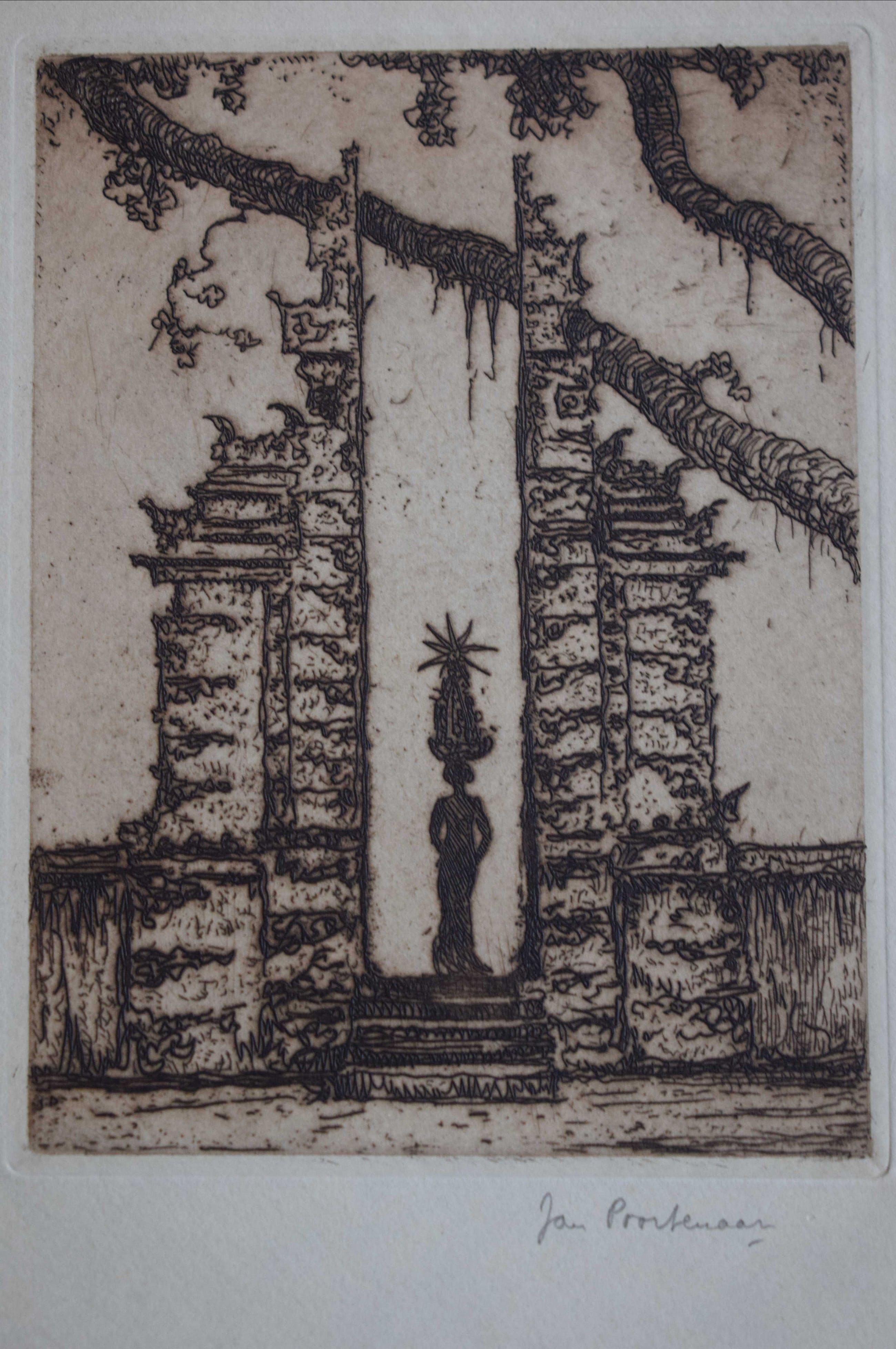 Jan Poortenaar heeft veel werken gemaakt over onderwerpen uit Indonesië. Deze Ets is van een tempel uit Bali, waar een Indonesische dame haar offers op haar hoofd meedraagt.