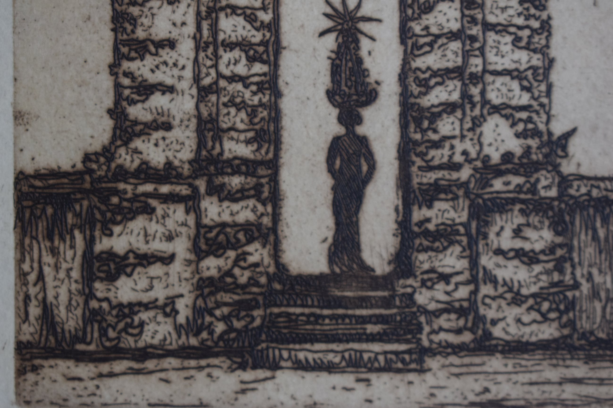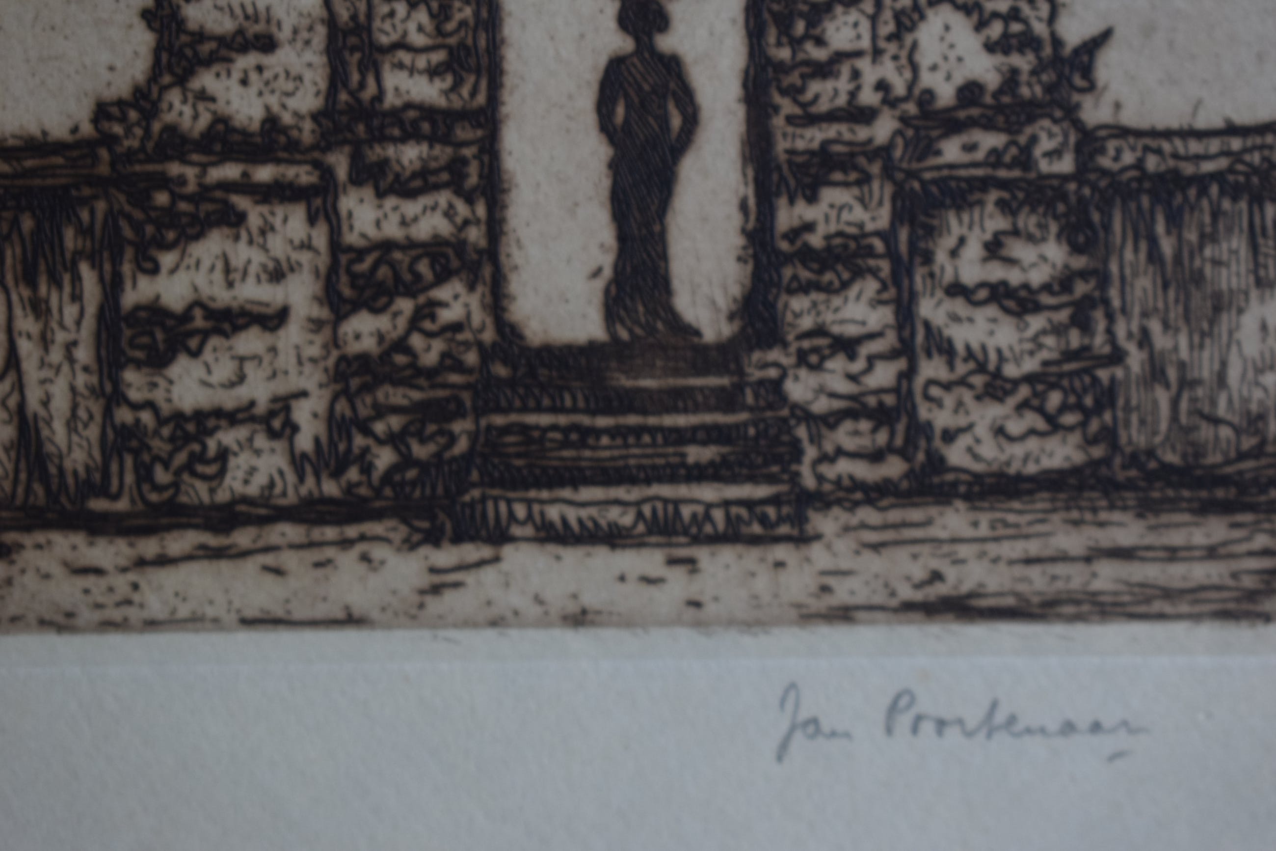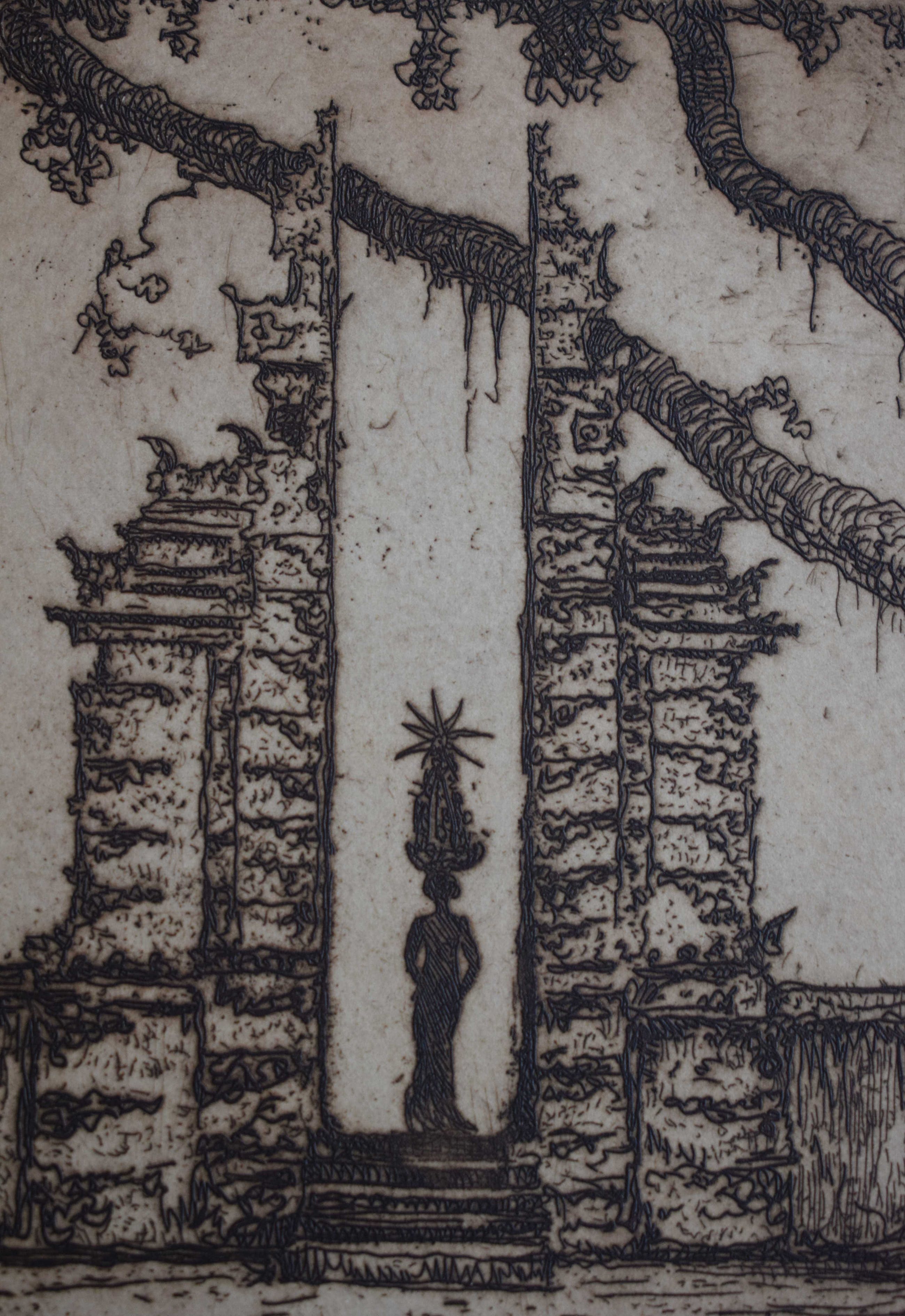 Jan Poortenaar heeft veel werken gemaakt over onderwerpen uit Indonesië. Deze Ets is van een tempel uit Bali, waar een Indonesische dame haar offers op haar hoofd meedraagt.