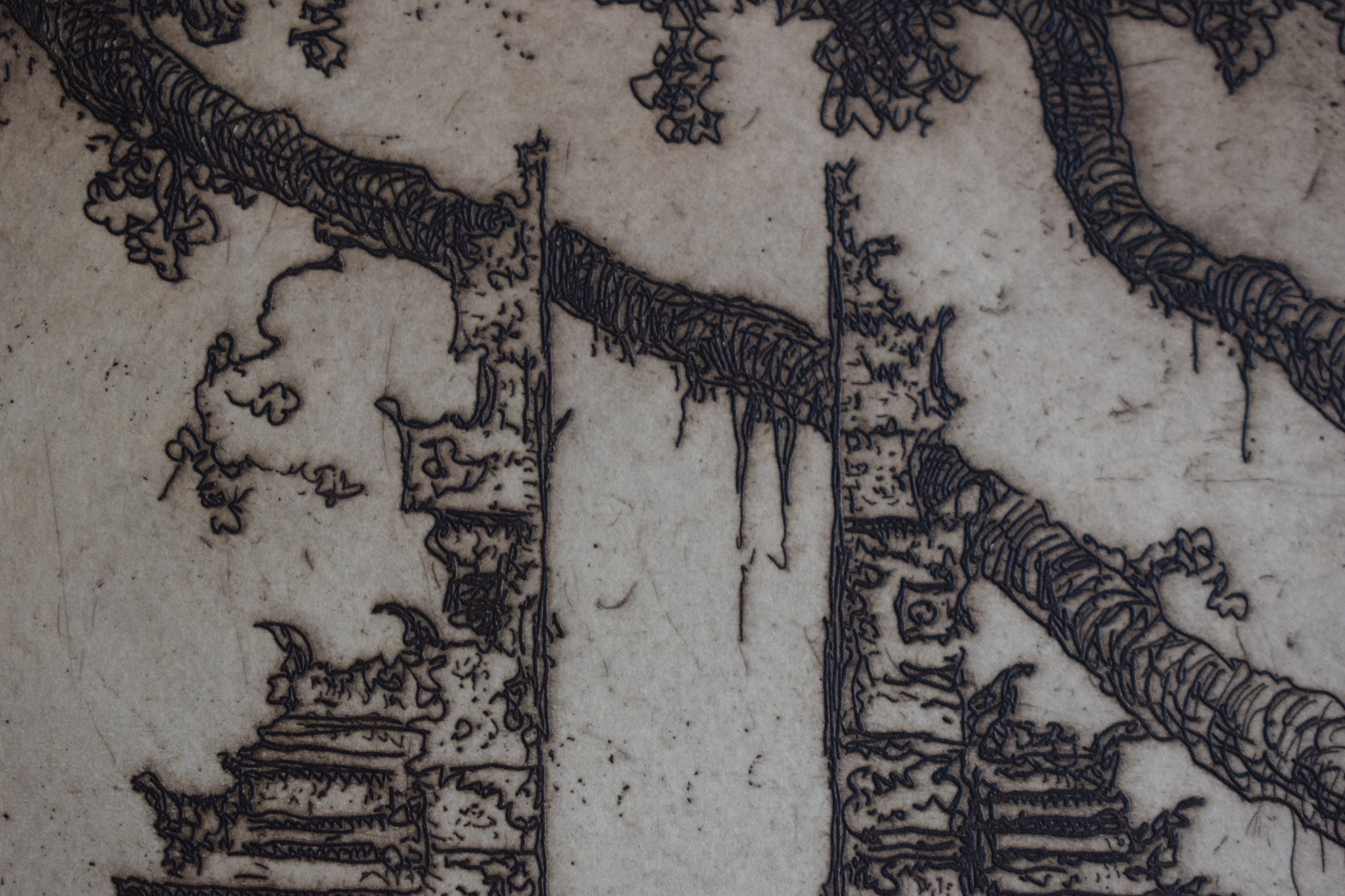 De ets heeft zijn beschermblad nog, dat laat ik eraan zitten ter bescherming van de ets. Wilt u de ets inlijsten, dan kan de lijstenmaker deze er afhalen of om de ets heenvouwen.
