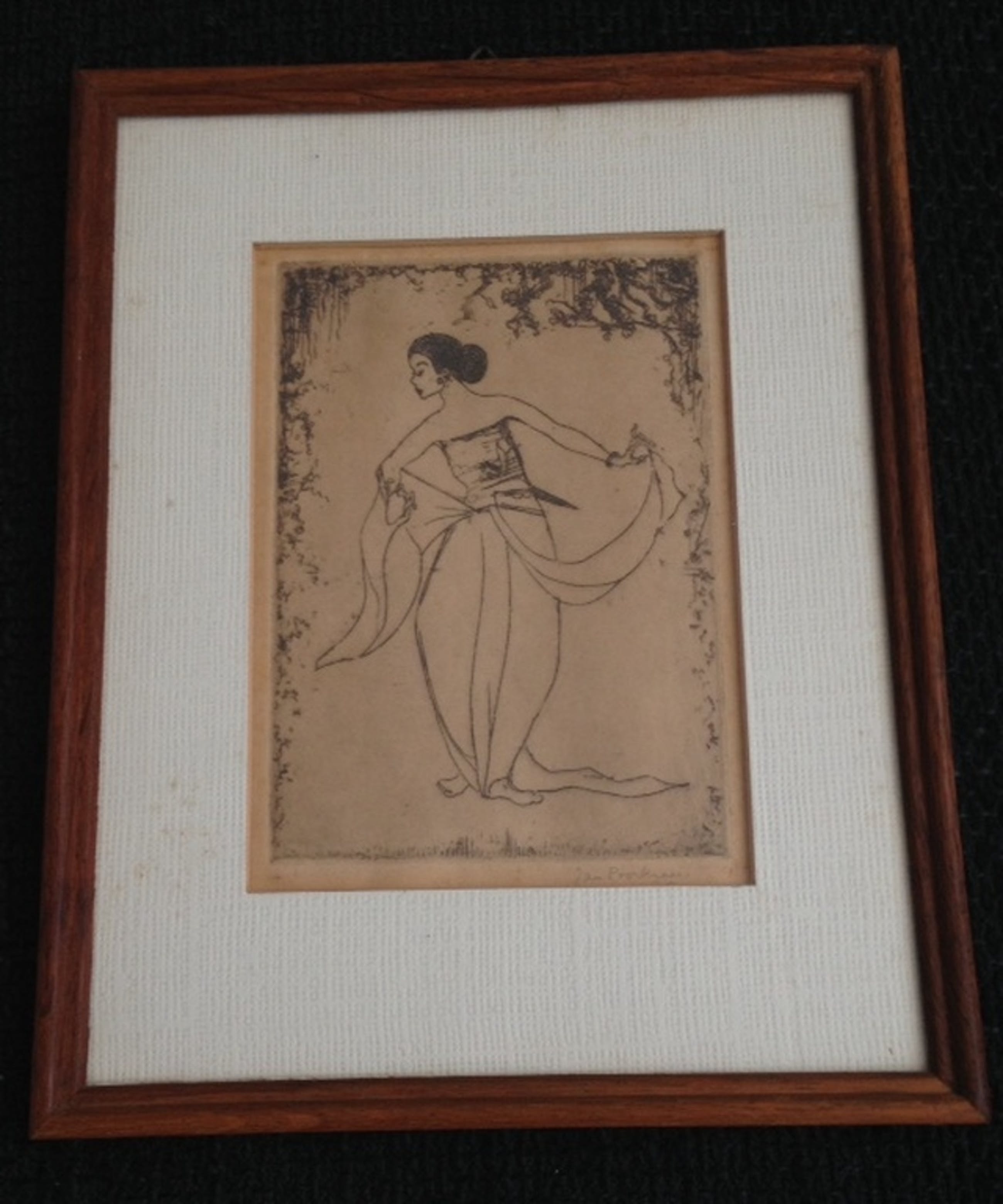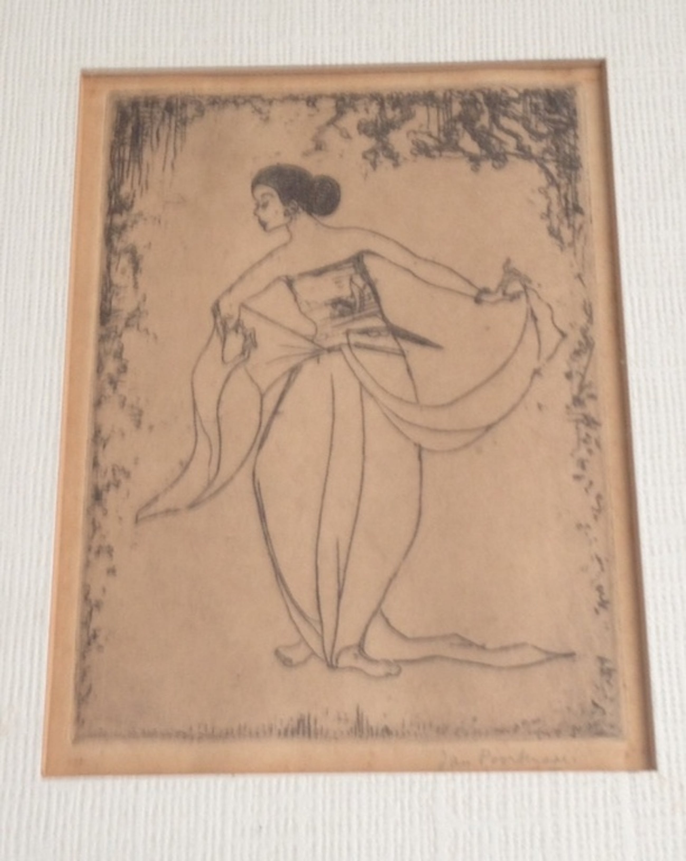 Leuke ets van een Balinese danseres door Jan Poortenaar. Nog origineel gelijst en in een prima staat.