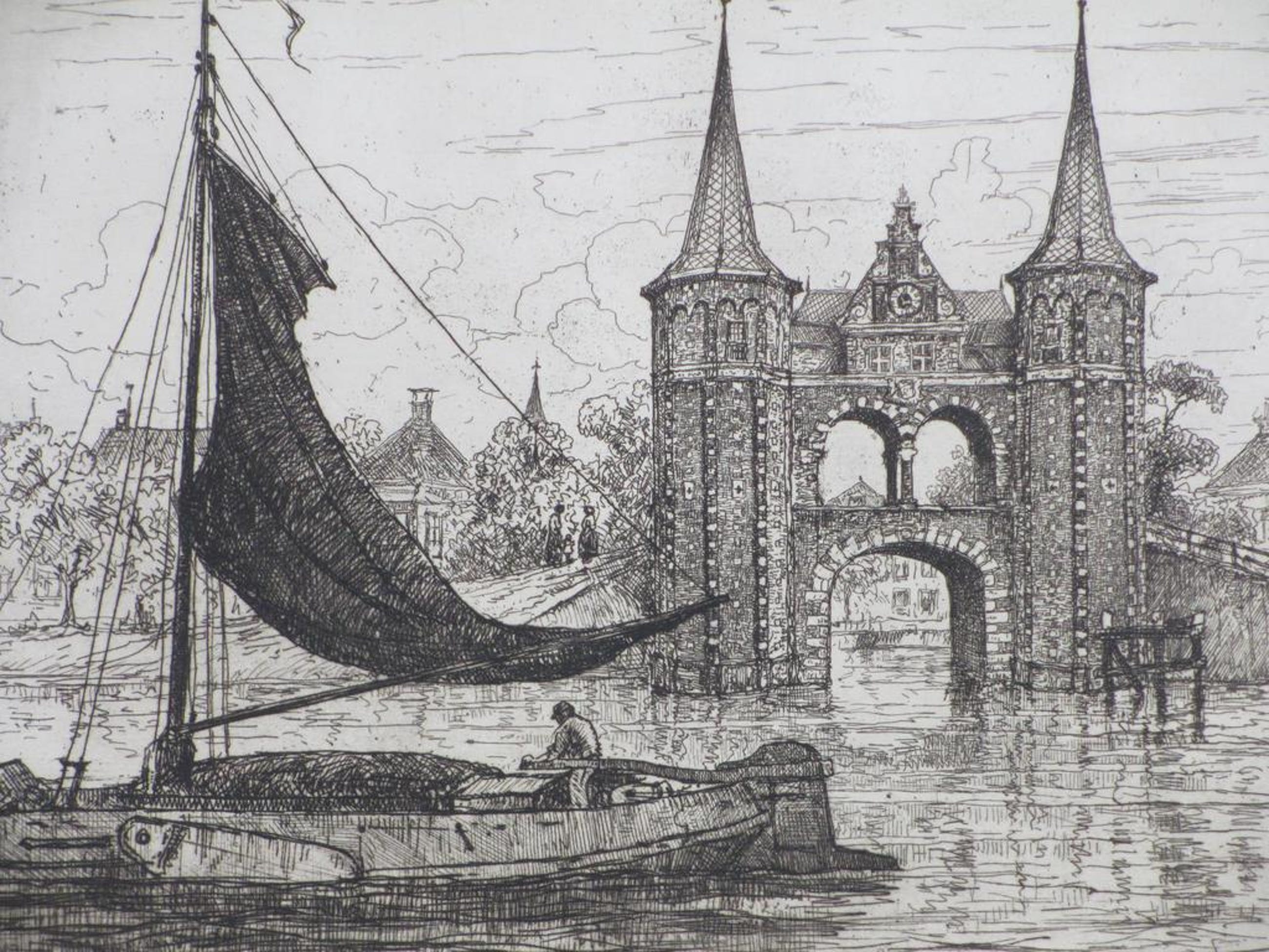 Voorstelling van de Waterpoort in Sneek met zeilschip in het water.