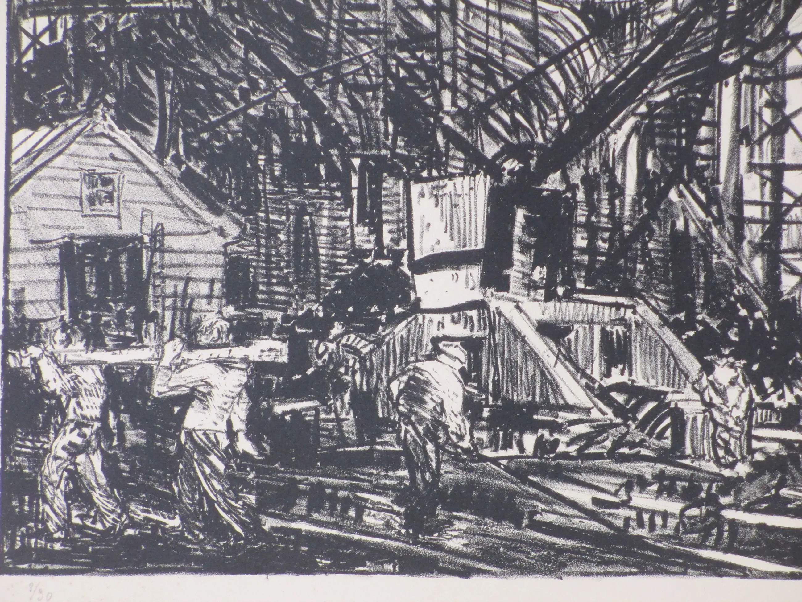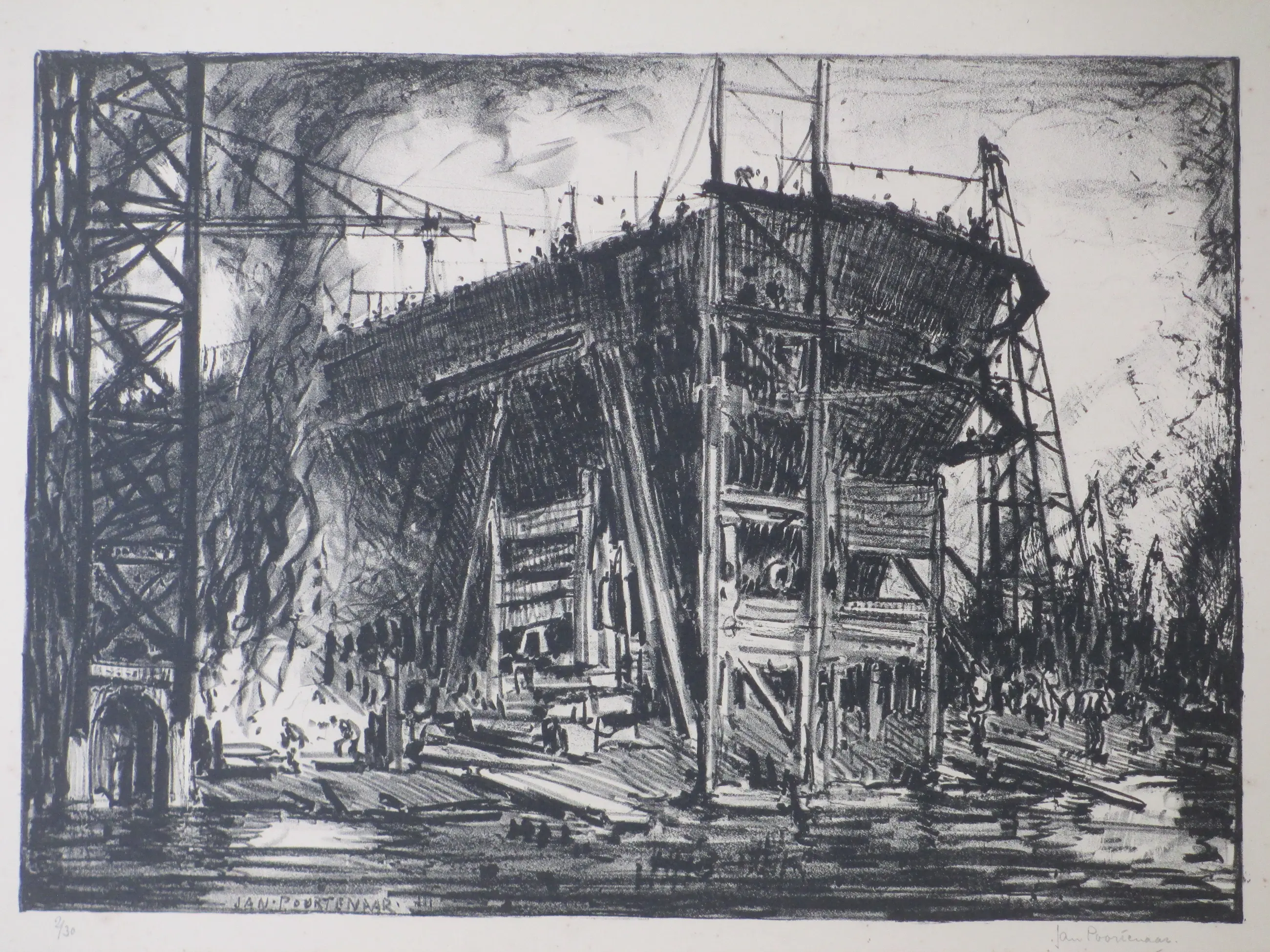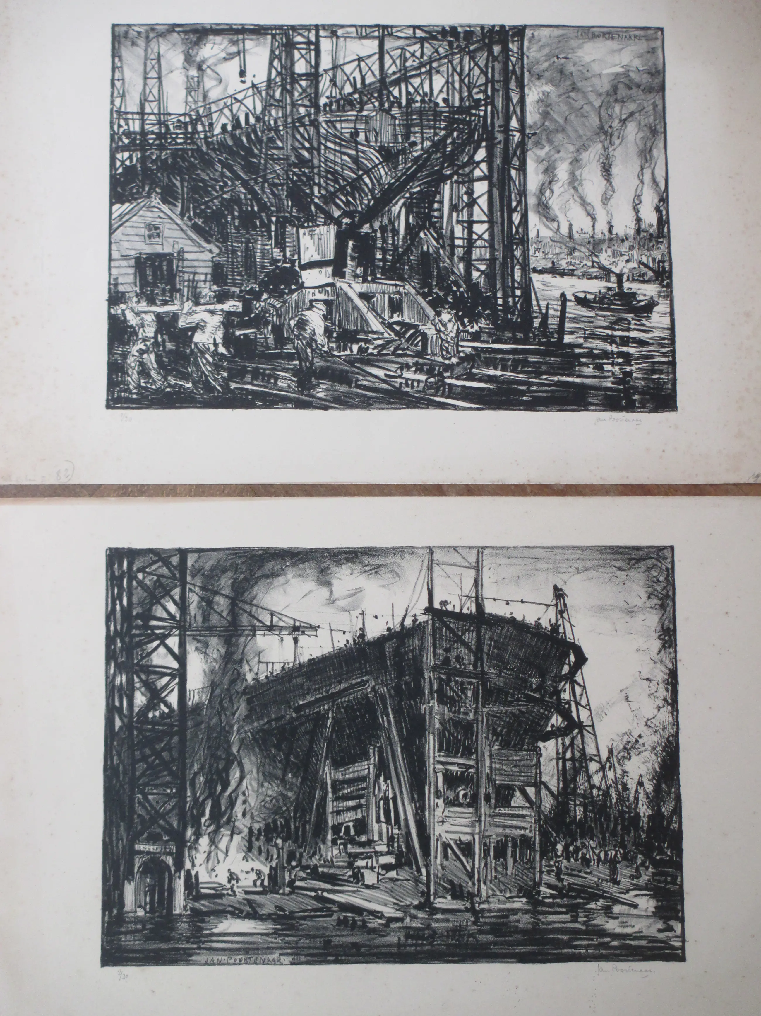 Twee weinig geziene litho's uit Jan Poortenaar zijn Engelse periode. Voorstellingen van scheepswerven, bekend onder de titels: Schiffbau & Scheepswerf Newcastle Beiden losbladig, beeldmaten 25x36 & 25x35, bladmaten 32x50 Beiden gesigneerd in potlood l.o.: '3/30 & 2/30' Authenticiteit volledig gegarandeerd