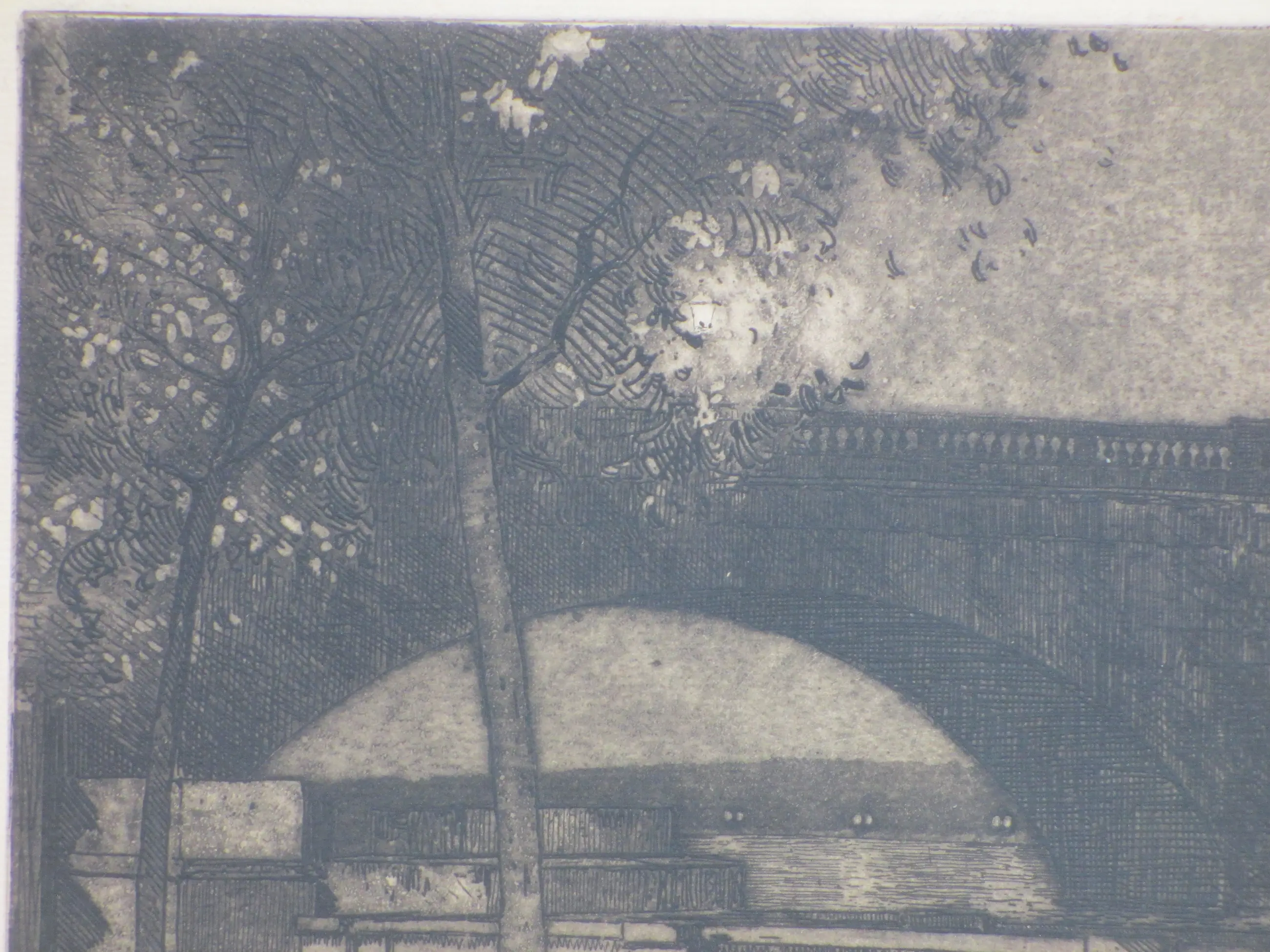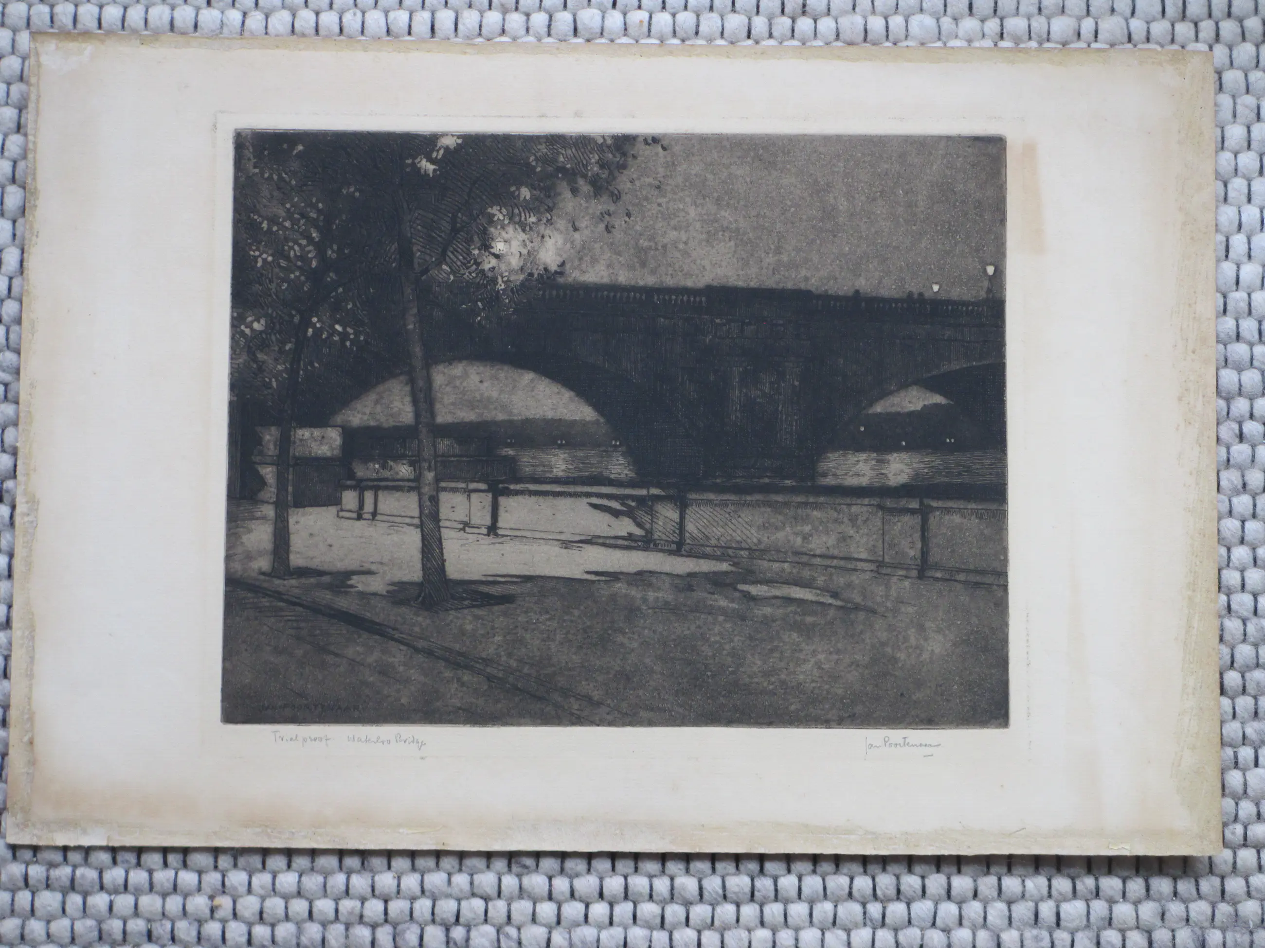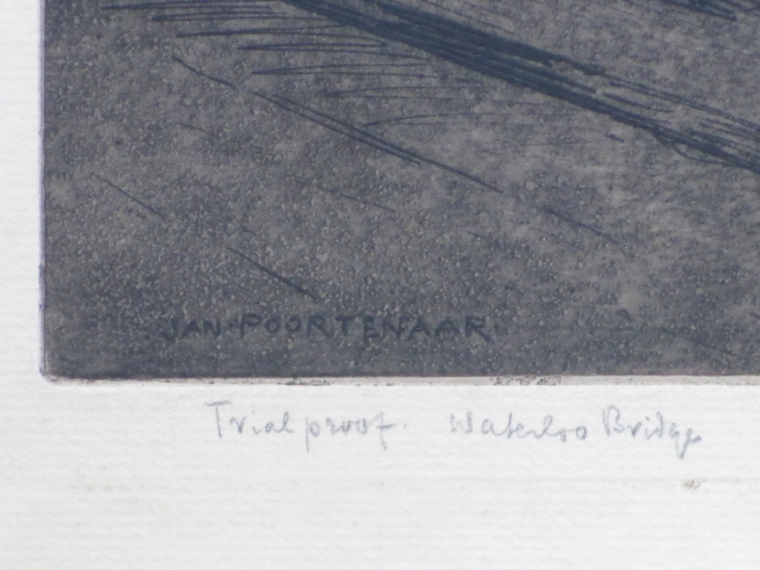 Fraaie en zelden geziene ets door Jan Poortenaar Voorstelling van een gezicht op Waterloo Bridge bij avond Werk uit zijn Londense periode Losbladig, beeldmaat 25x32, bladmaat 32x48 Gesigneerd in potlood r.o.: 'Jan Poortenaar' en tevens l.o. in de druk Annotatie en titel in potlood l.o.: 'Trial proof' en 'Waterloo Bridge'