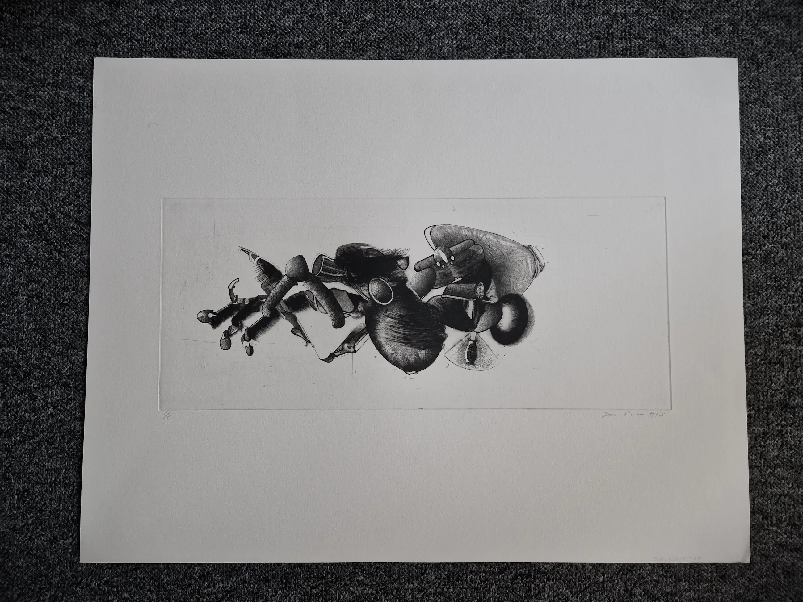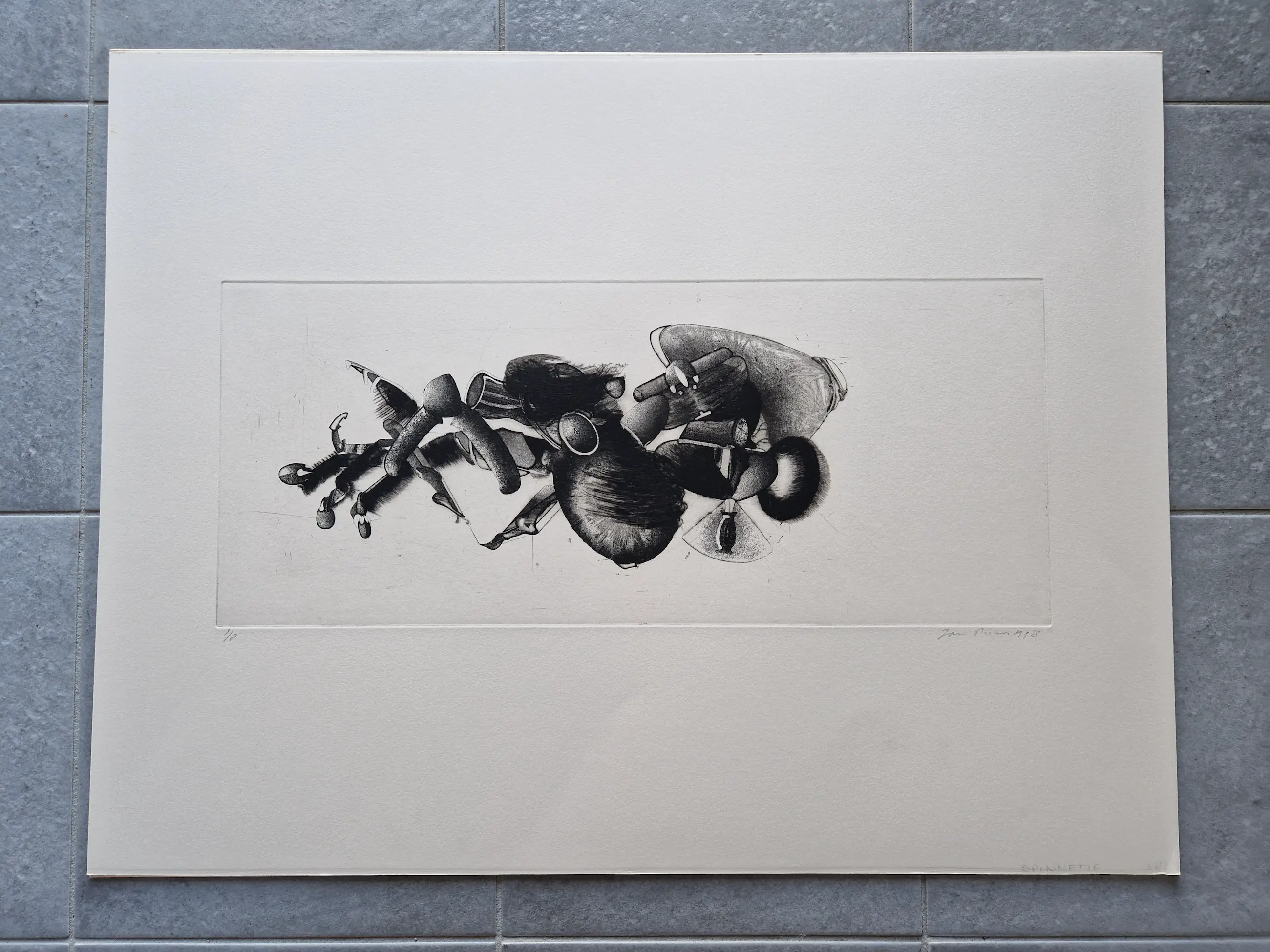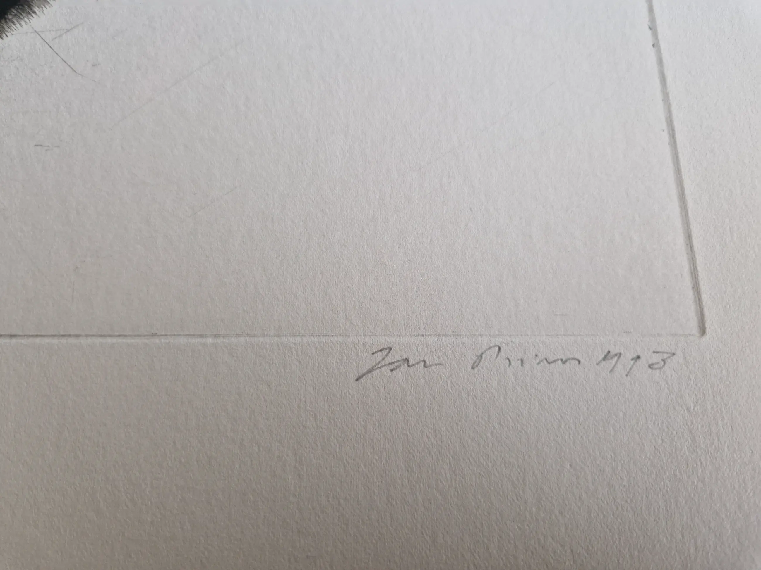 Bijzonder knappe, in 1993 door de Rotterdamse graficus (en ook kunstschilder) jan Prins (1956-Schipluiden) gemaakte droge naald ETS "Spinnetje". Zeer kleine oplage van slechts 8 exemplaren! Met potlood gesigneerd, genummerd en gedateerd.