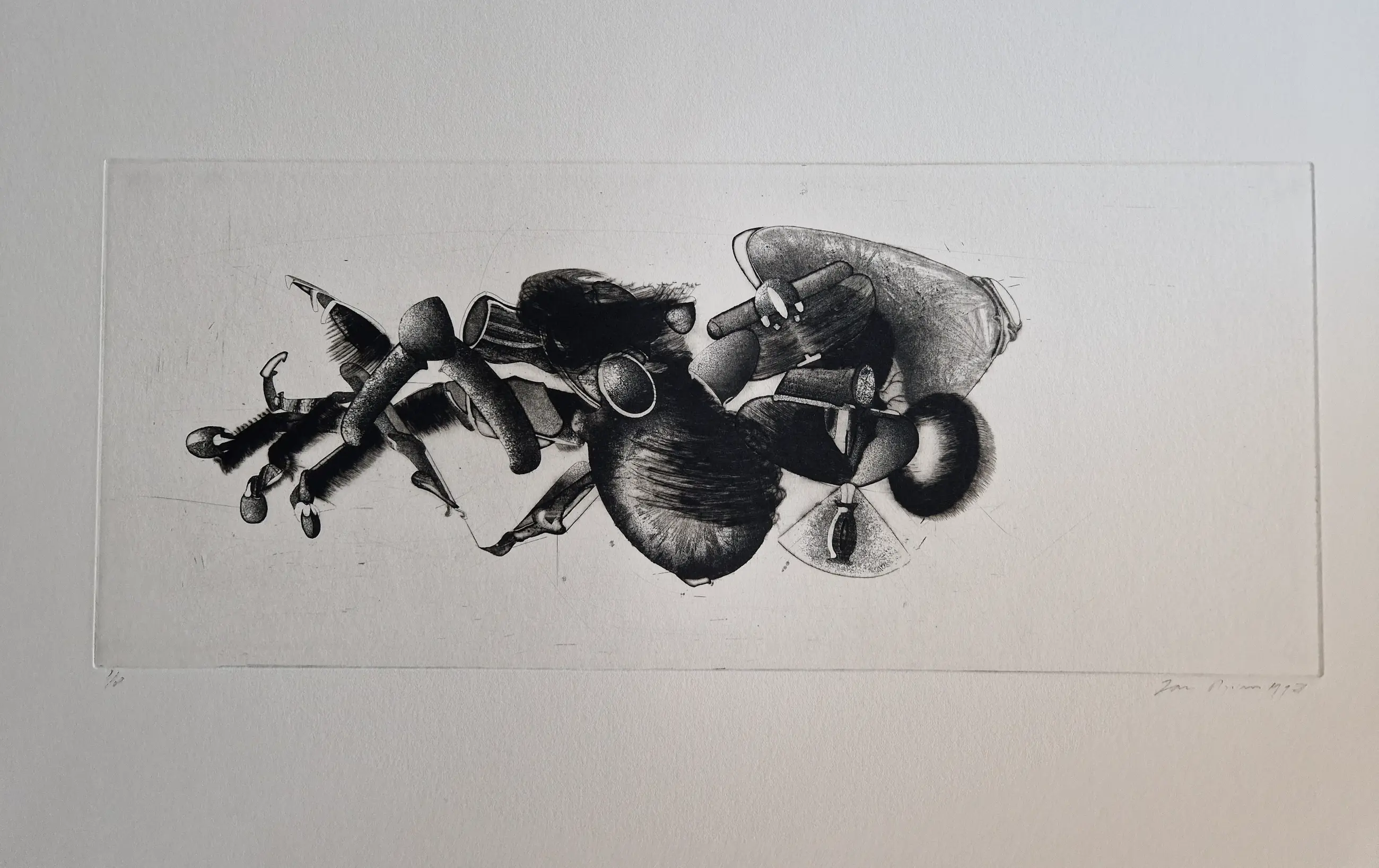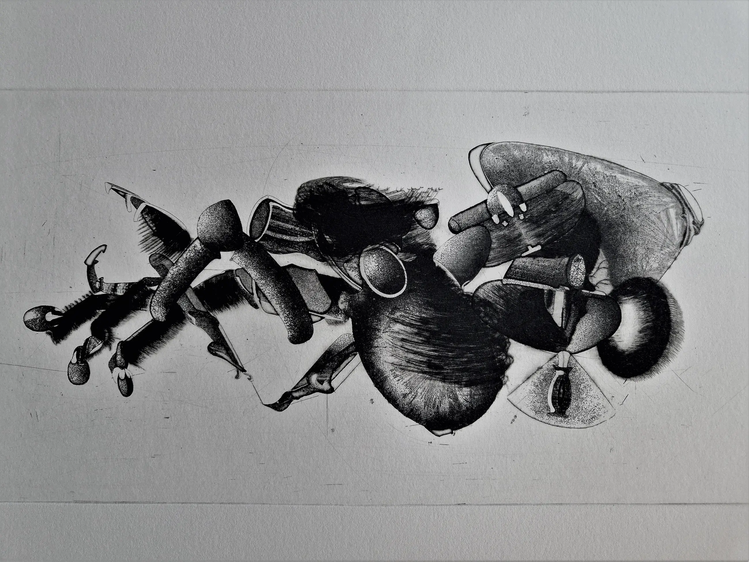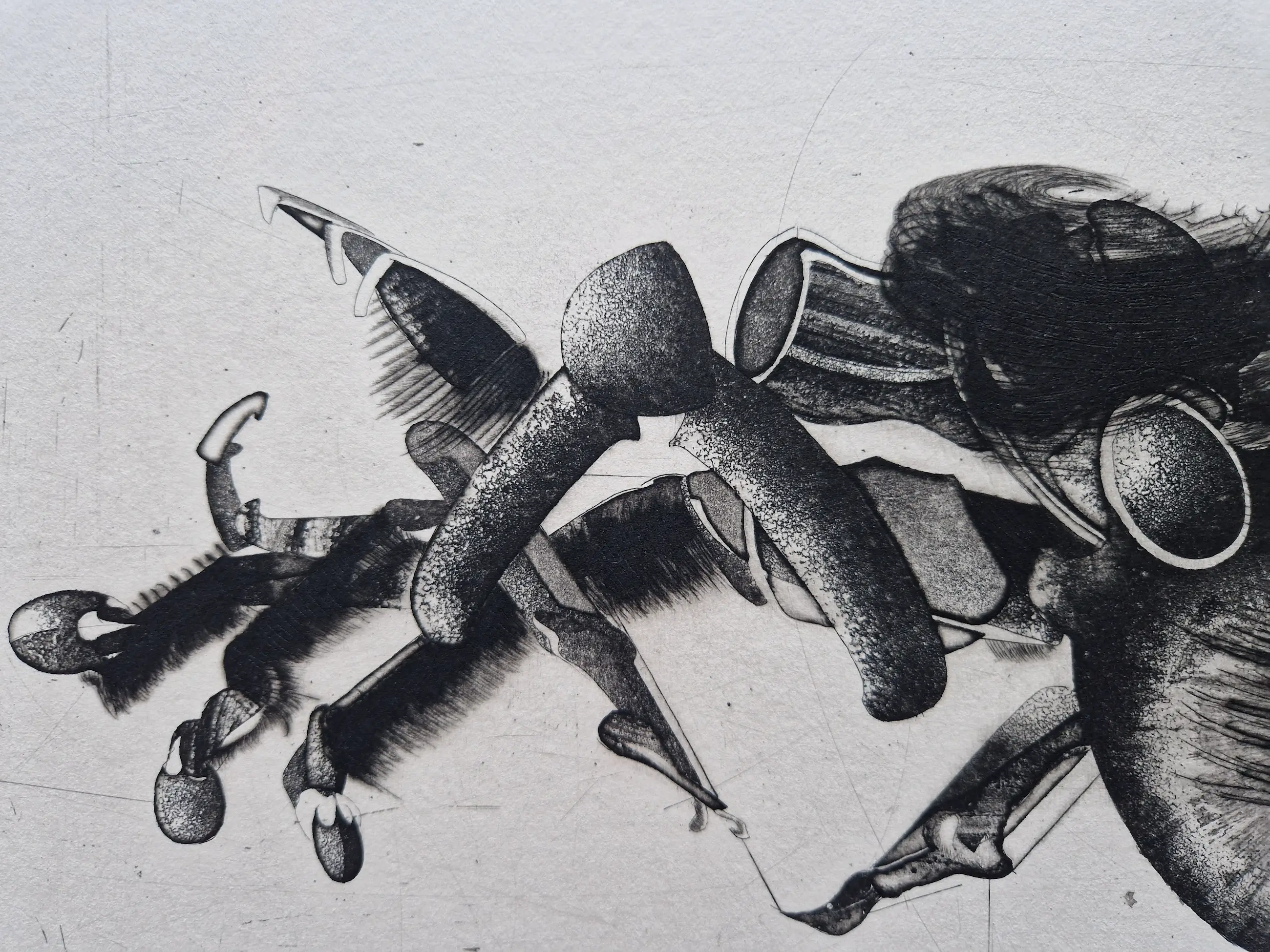 Bijzonder knappe, in 1993 door de Rotterdamse graficus (en ook kunstschilder) jan Prins (1956-Schipluiden) gemaakte droge naald ETS "Spinnetje". Zeer kleine oplage van slechts 8 exemplaren! Met potlood gesigneerd, genummerd en gedateerd.