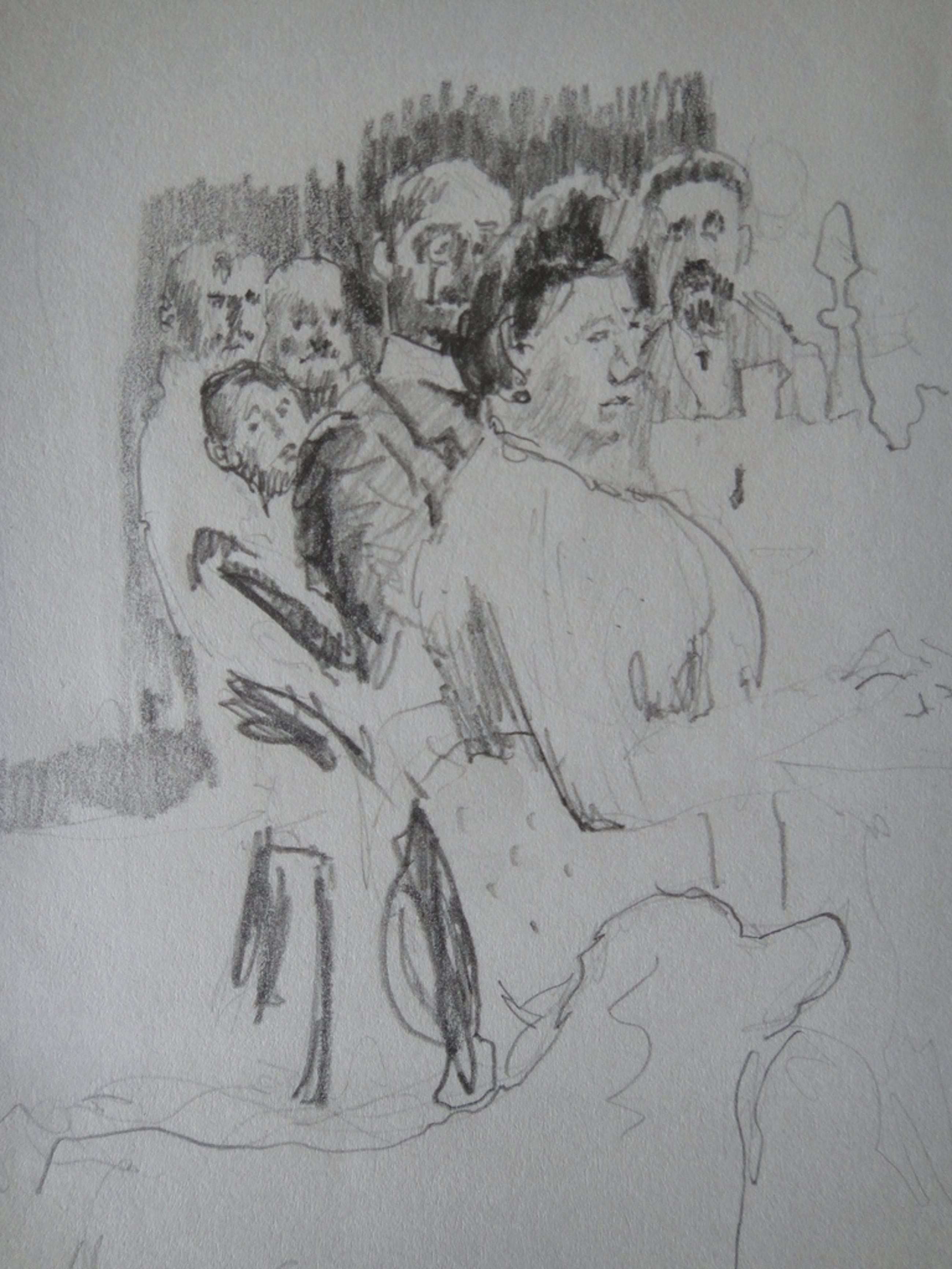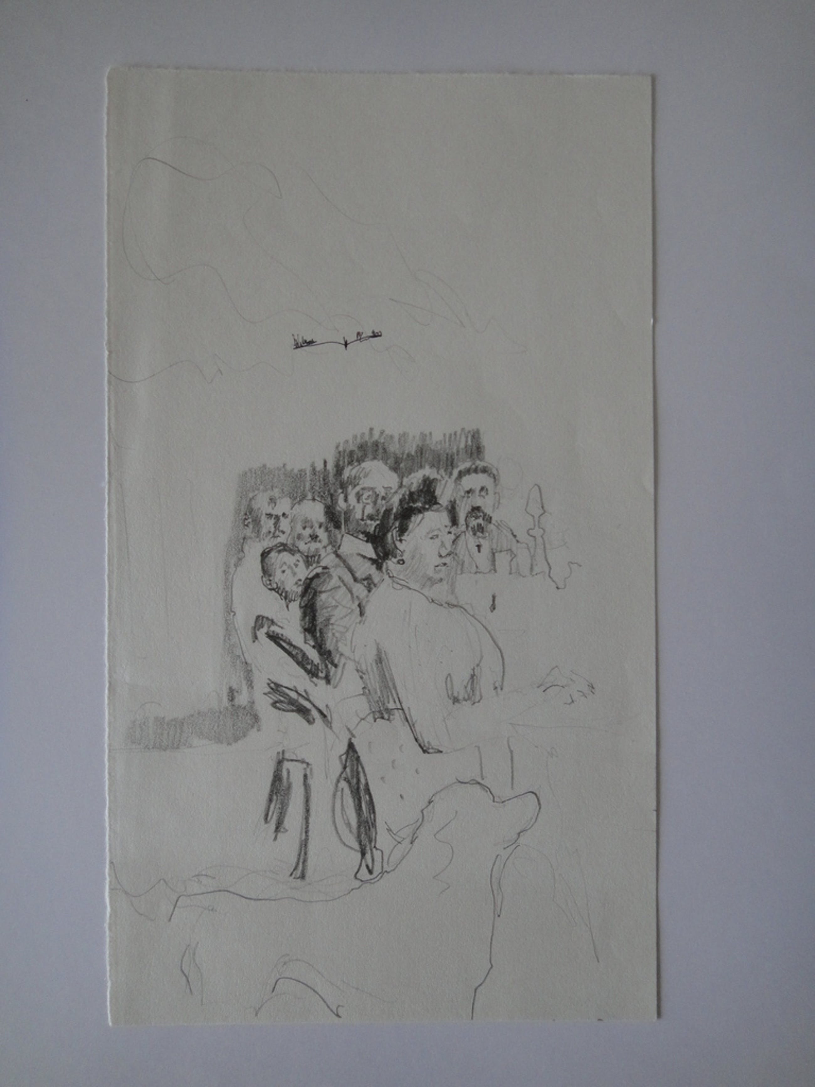 Studietekening door Jan Prins (Schipluiden 1956): gezelfschap aan tafel met hond op de voorgrond..