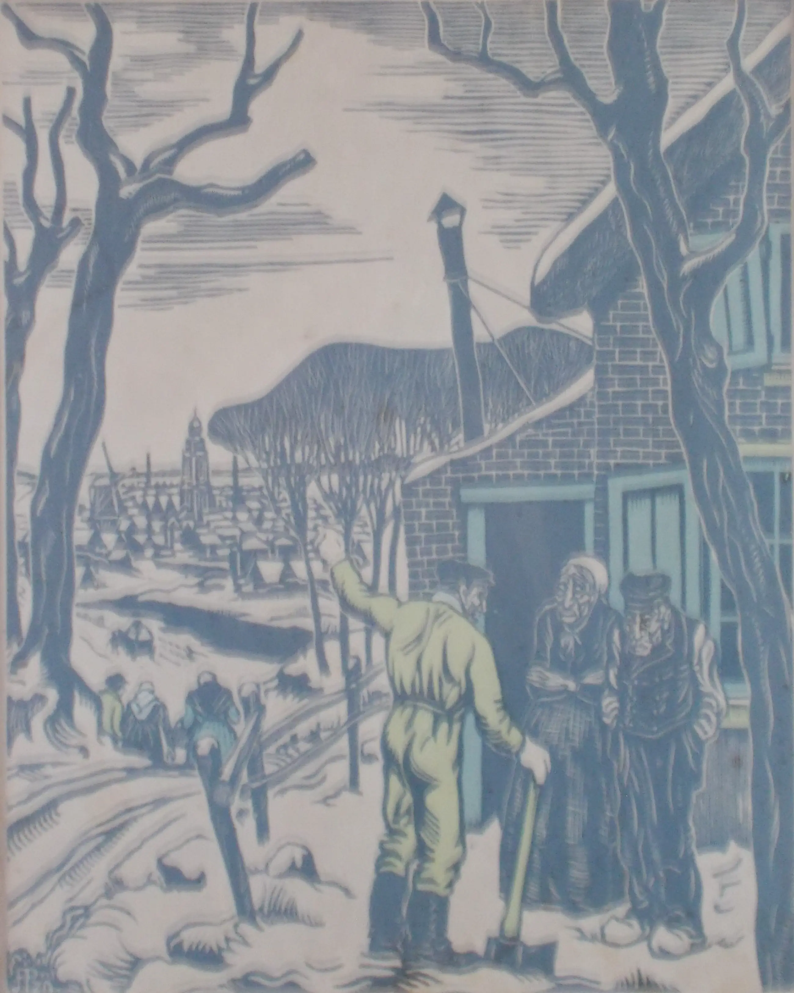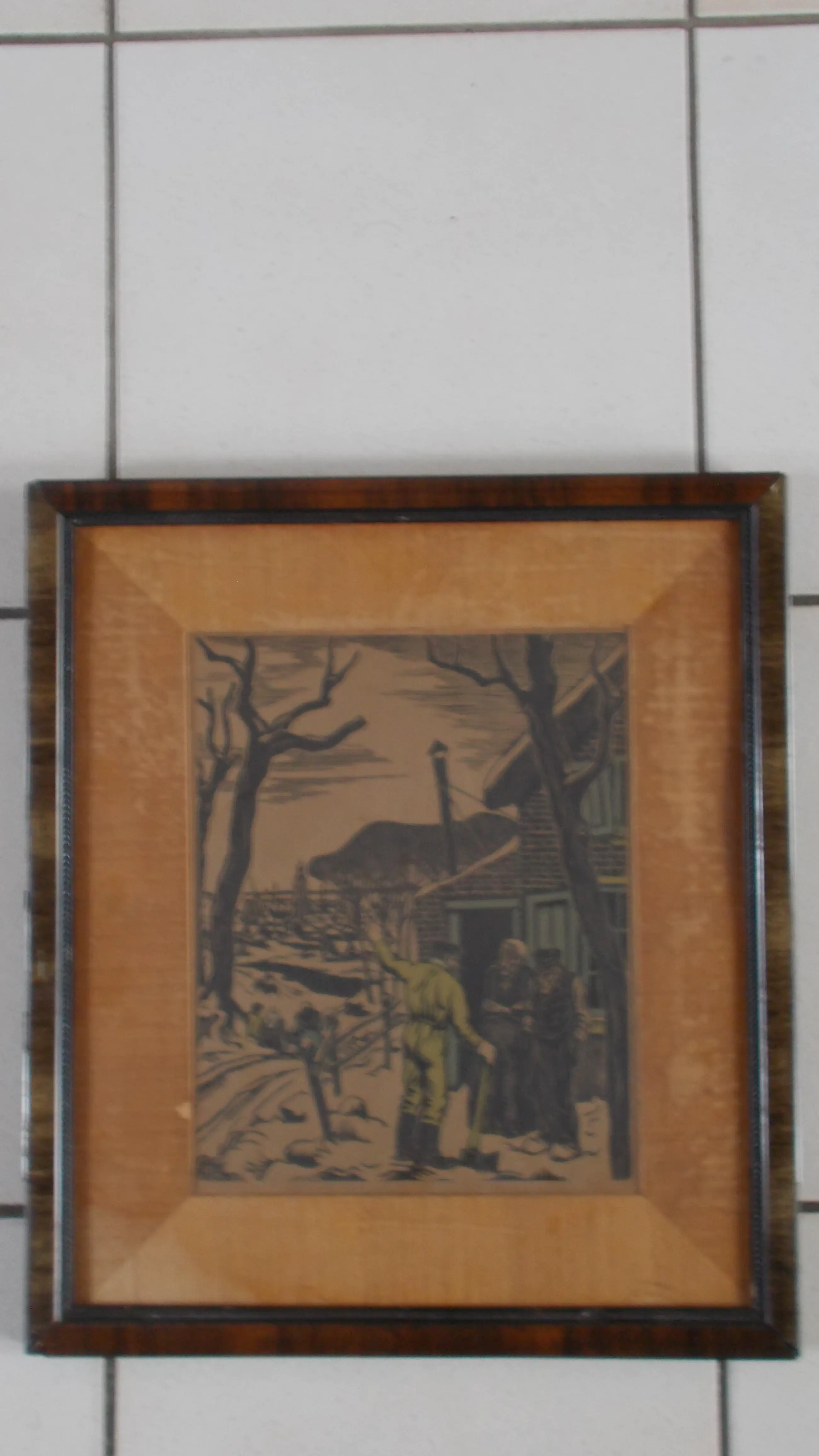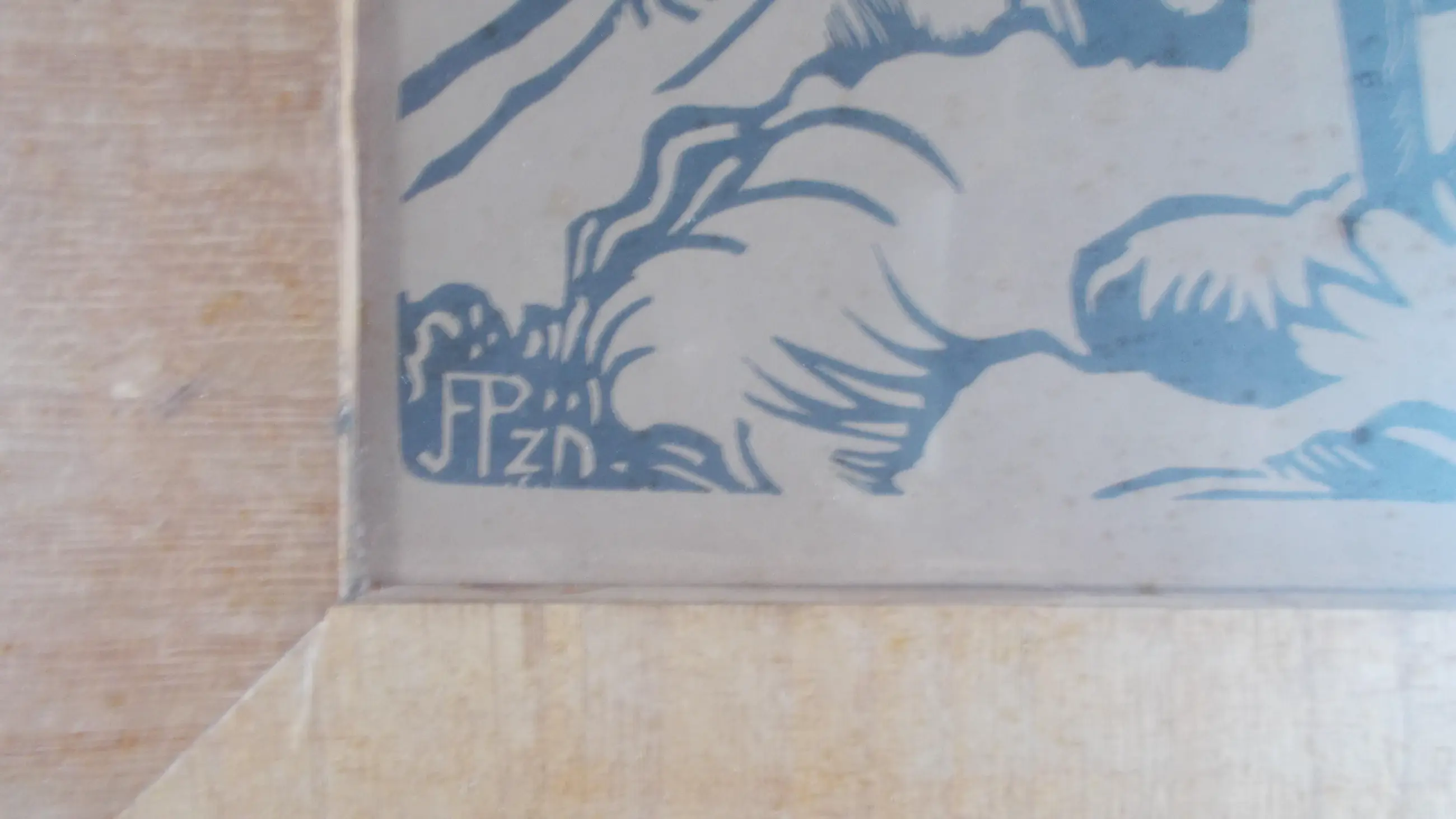 Kleurenhoutsnede.Monogram in het blok linksonder.Beeldmaat 30 x 24 cm.Lijstmaat 48 x 42 cm.