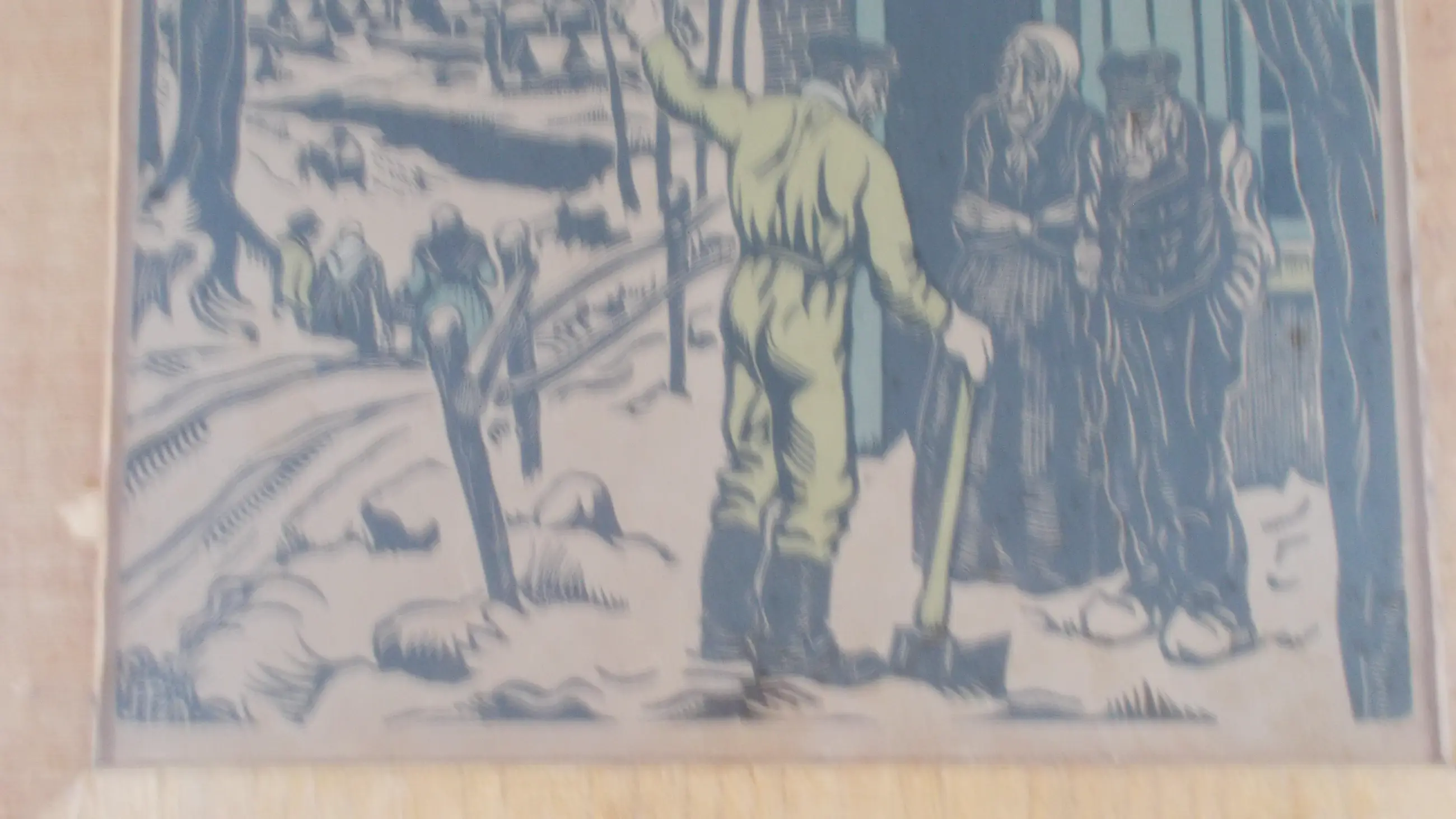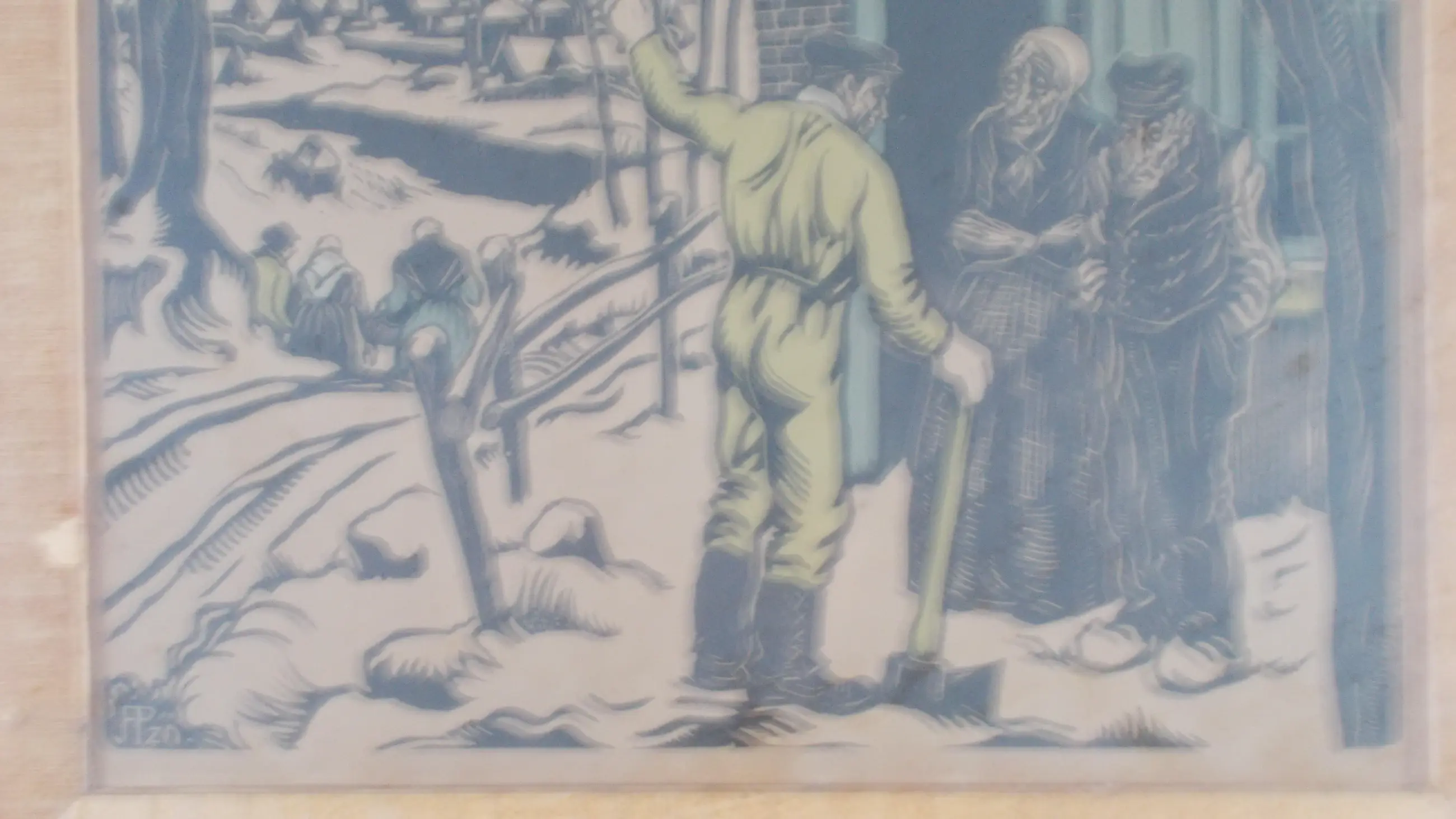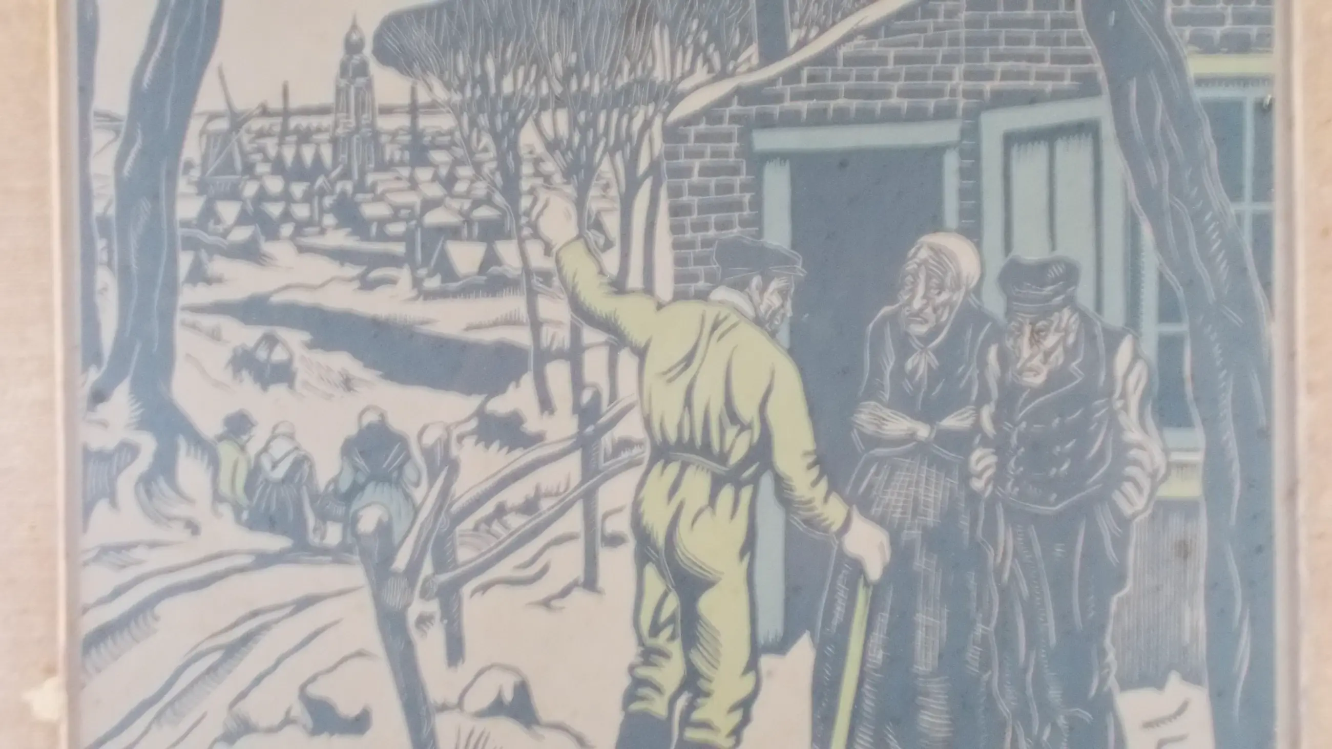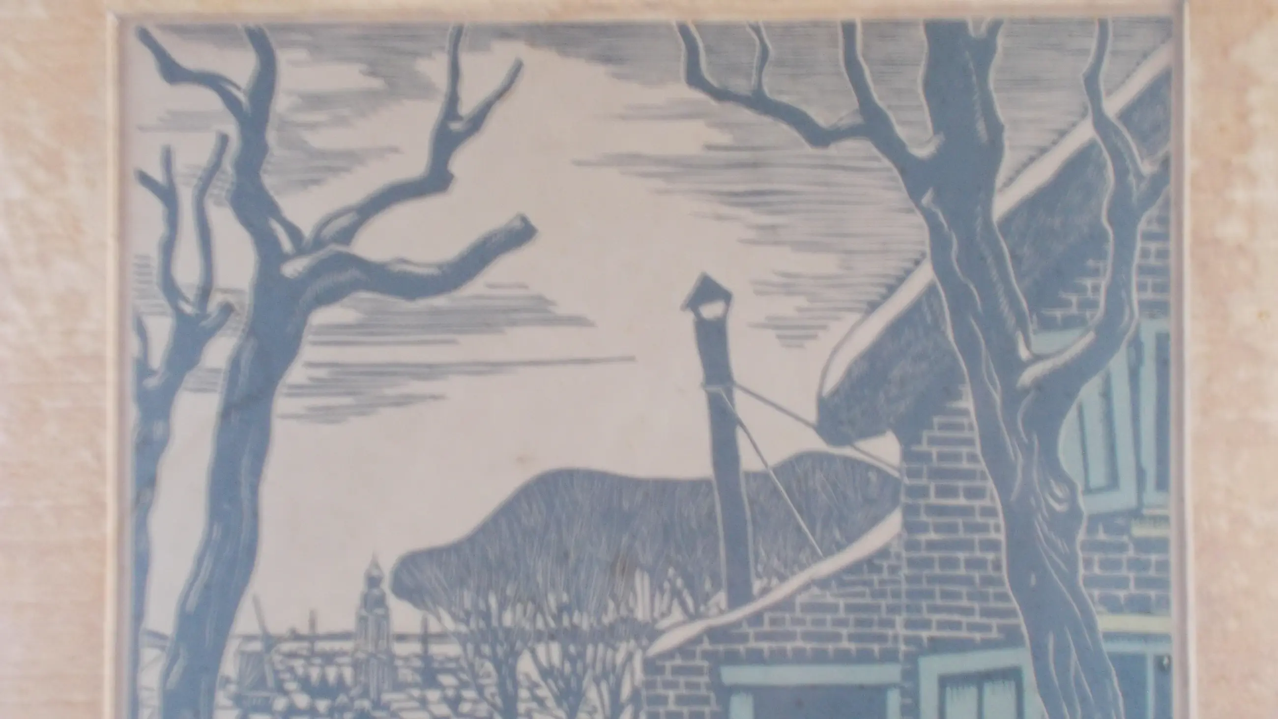 Kleurenhoutsnede.Monogram in het blok linksonder.Beeldmaat 30 x 24 cm.Lijstmaat 48 x 42 cm.