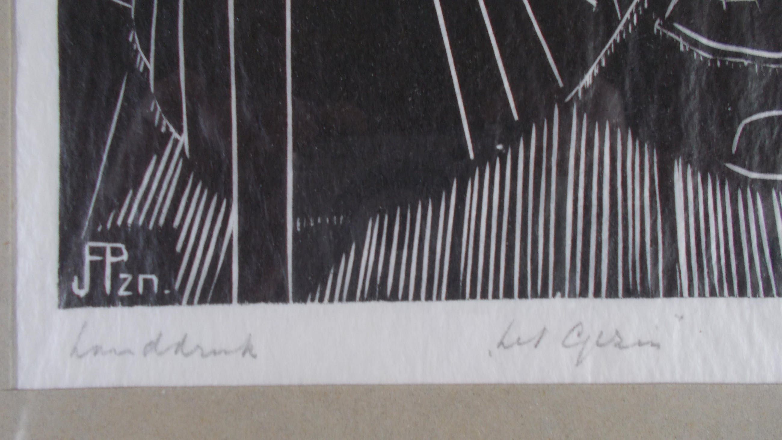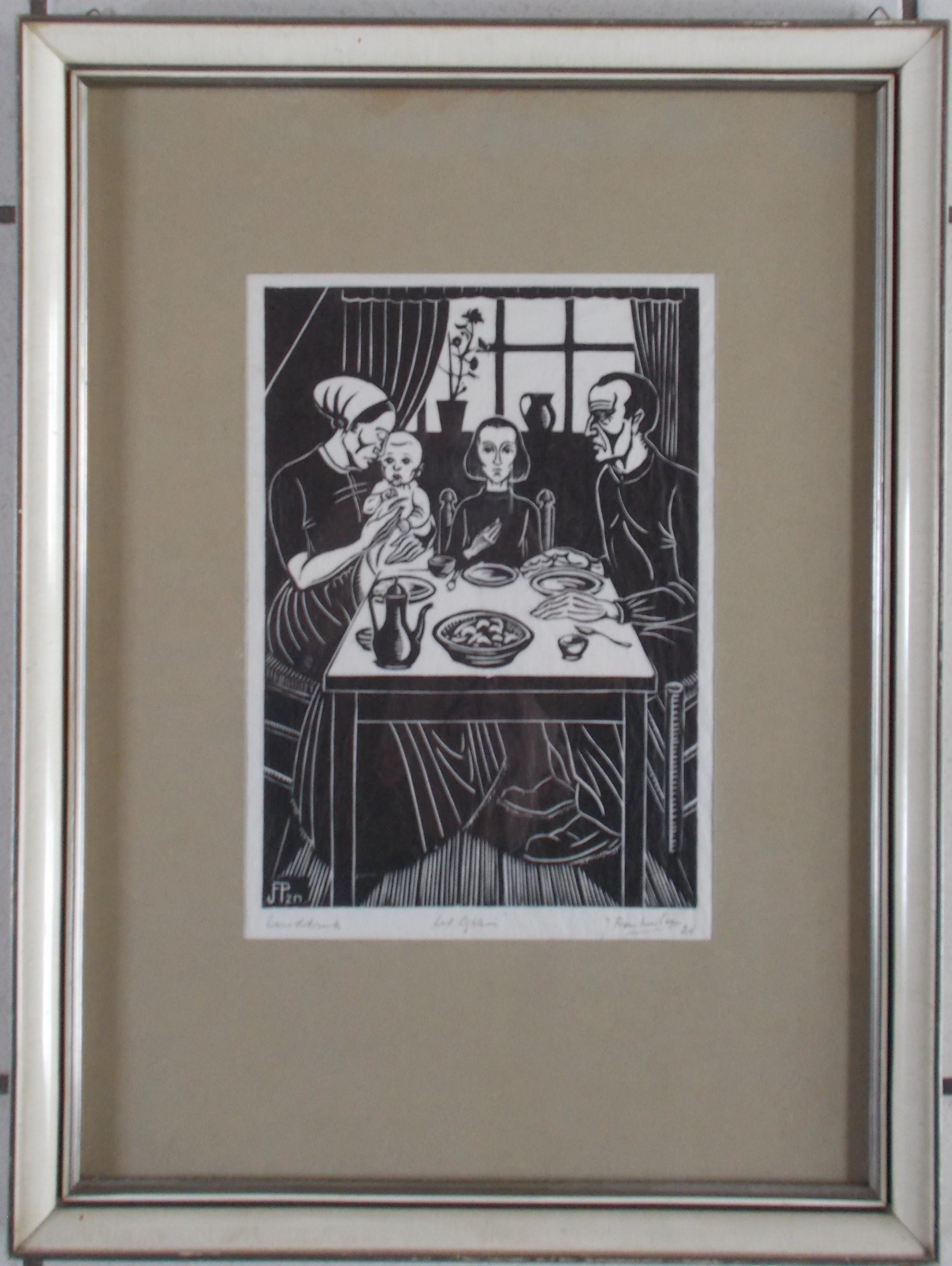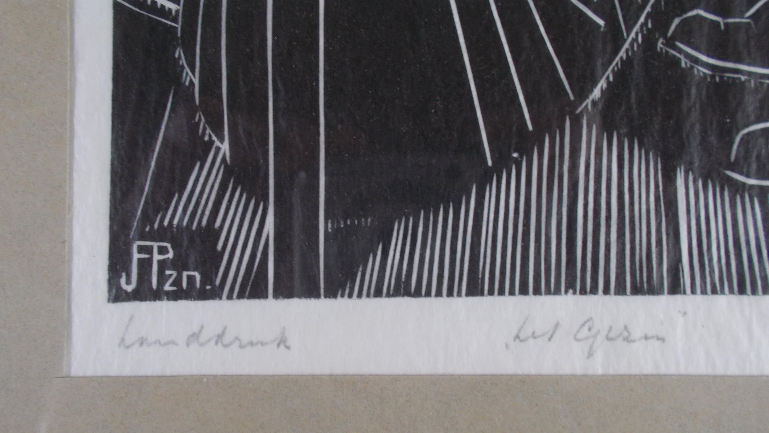 Houtsnede uit 1924.Potlood gesigneerd en gedateerd rechtsonder.Getiteld midden onder."handdruk" linksonder.Beeldmaat 24 x 17 cm.Lijstmaat 46 x 35 cm.