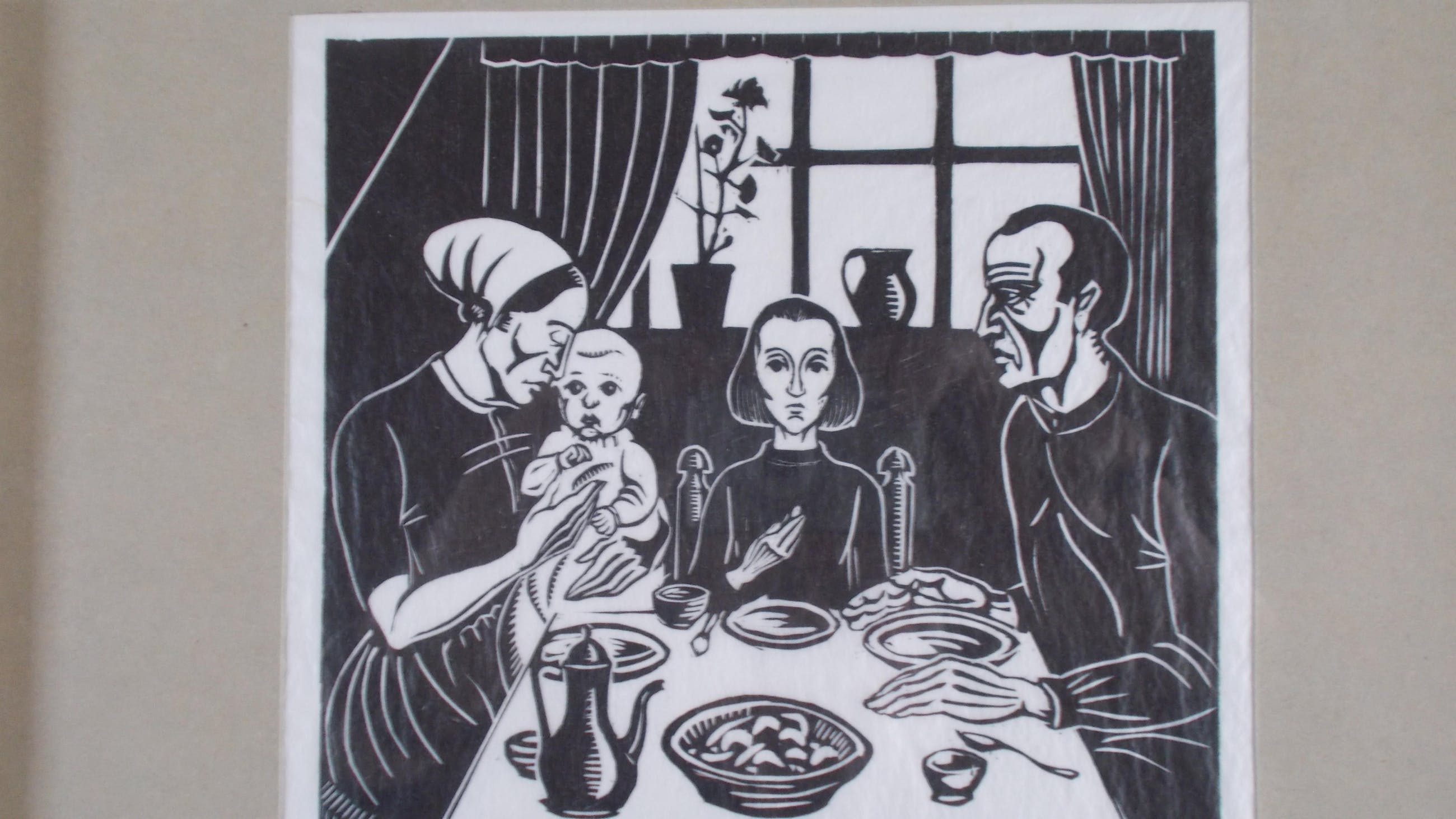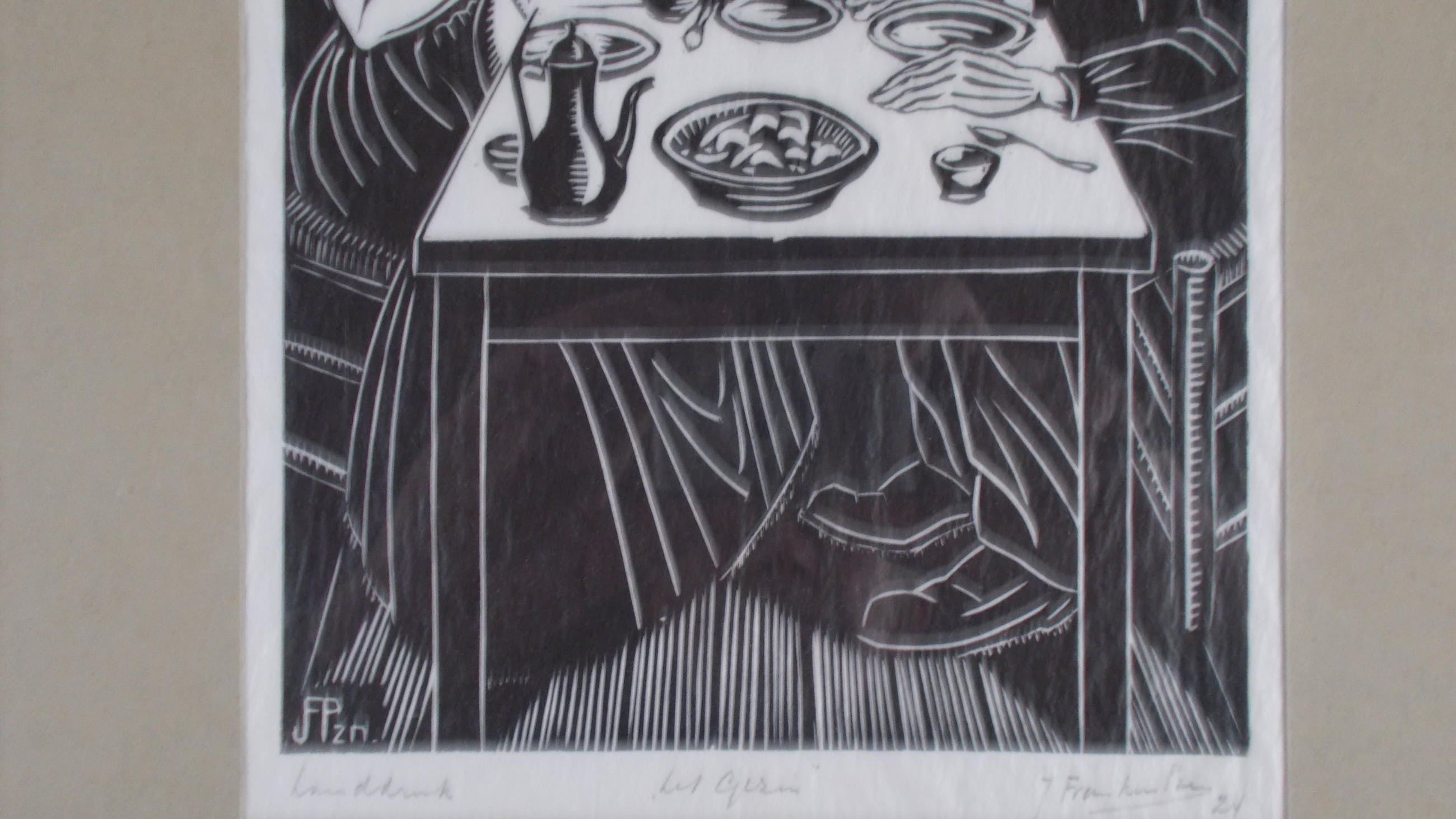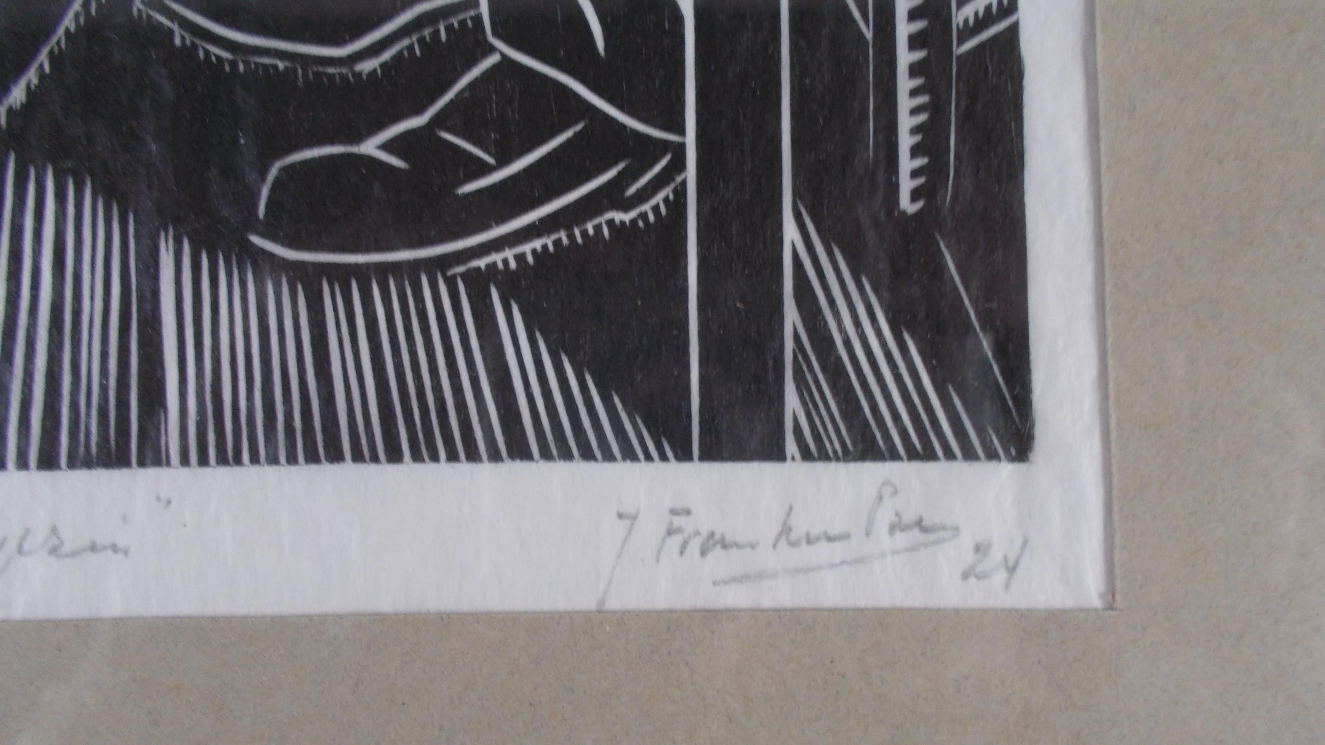 Houtsnede uit 1924.Potlood gesigneerd en gedateerd rechtsonder.Getiteld midden onder."handdruk" linksonder.Beeldmaat 24 x 17 cm.Lijstmaat 46 x 35 cm.