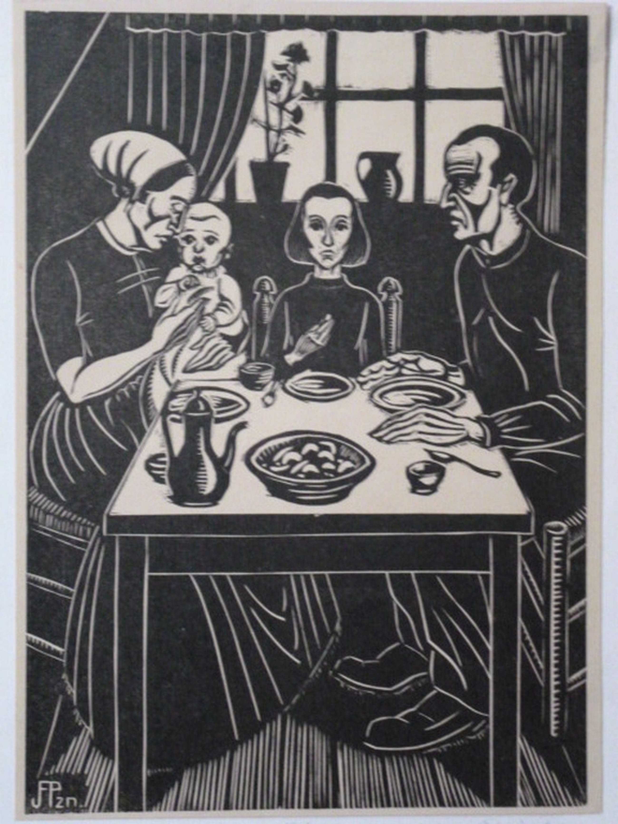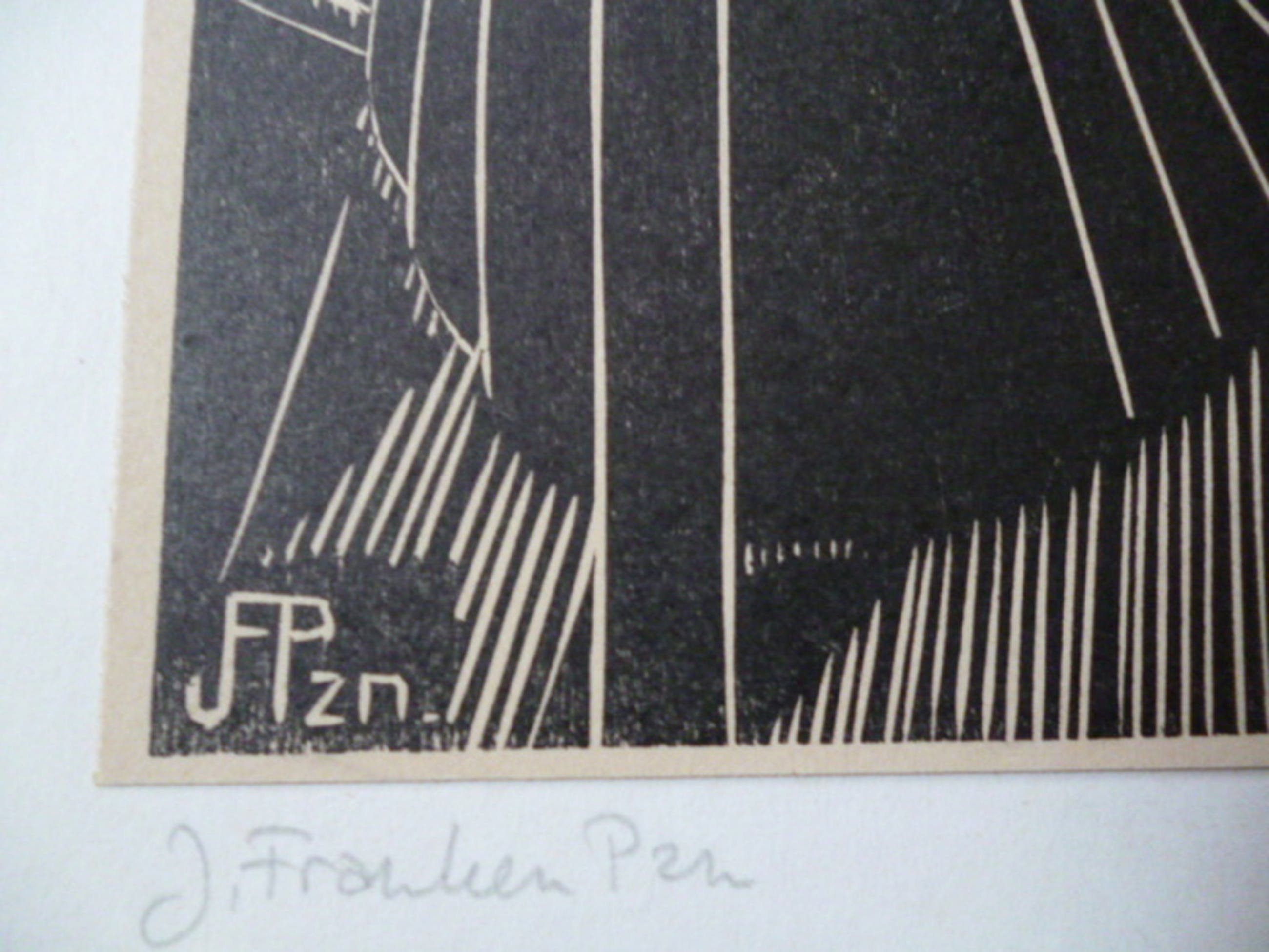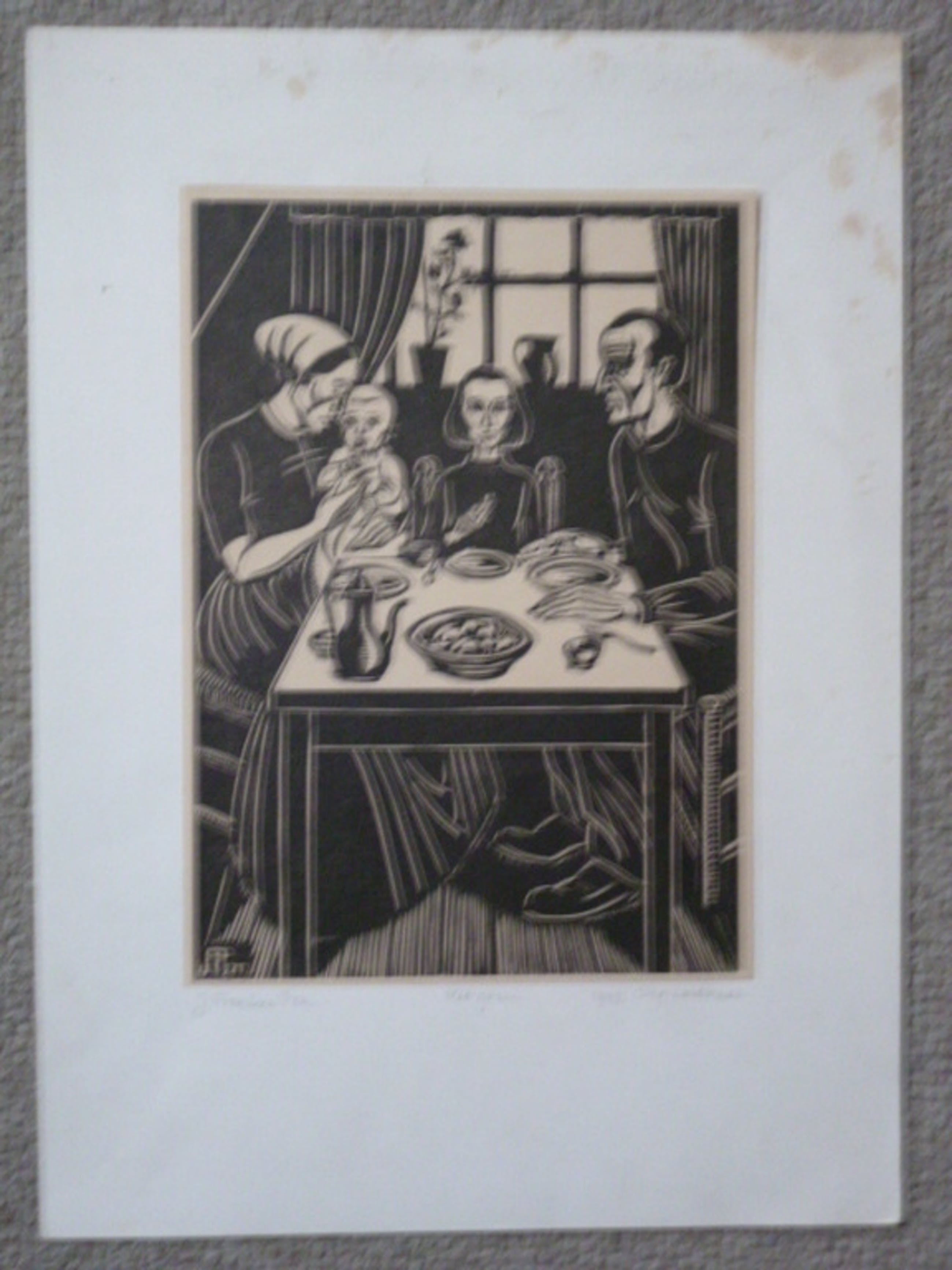Houtsnede uit 1943. Gemonogrammeerd in het blok linksonder.