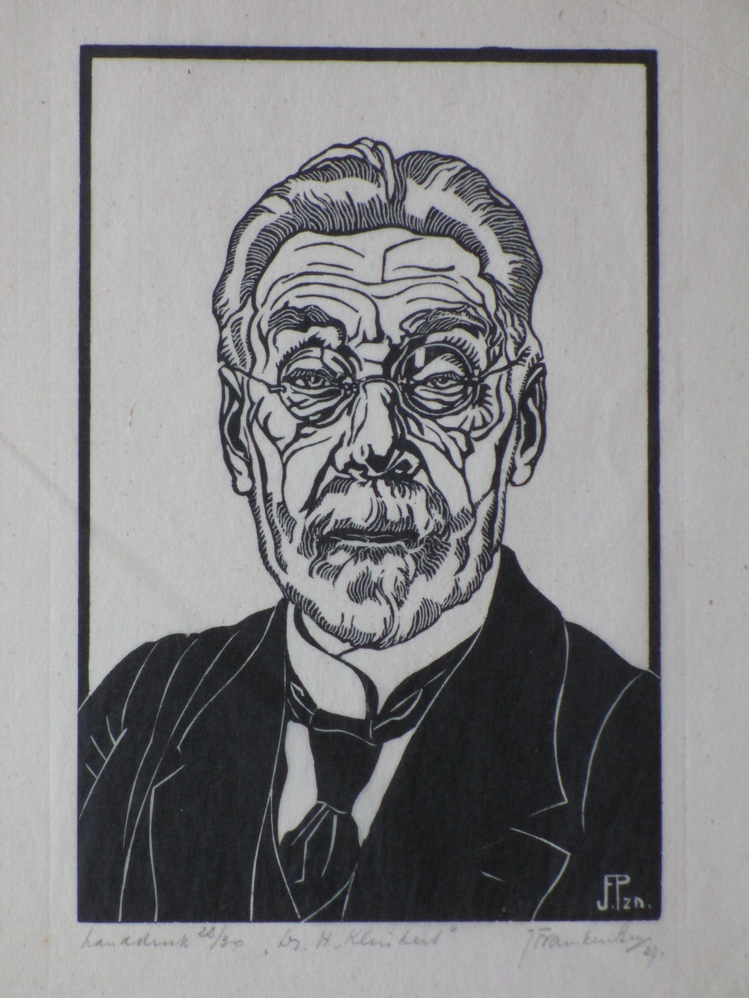 Houtsnede door Jan Franken PznPortret van Dr H.KlinkertLosbladig op onderblad, beeldmaat 17x11, bladmaat 26x20Gesigneerd en gedateerd in potlood r.o. 'J Franken Pzn 27'Genummerd l.o. '22/30' en getiteld m.o. 'Dr H. Klinkert'Authenticiteit volledig gegarandeerd
