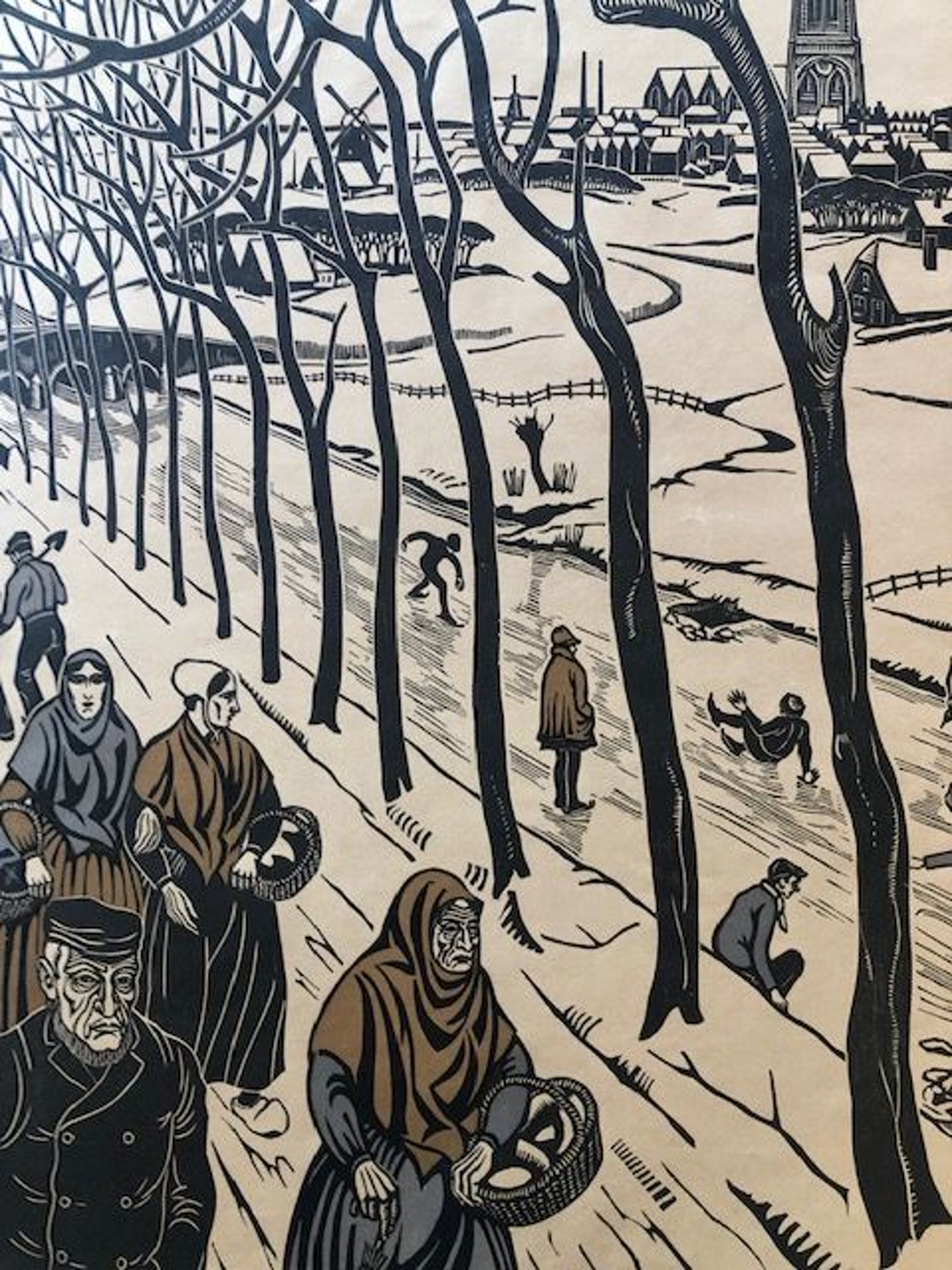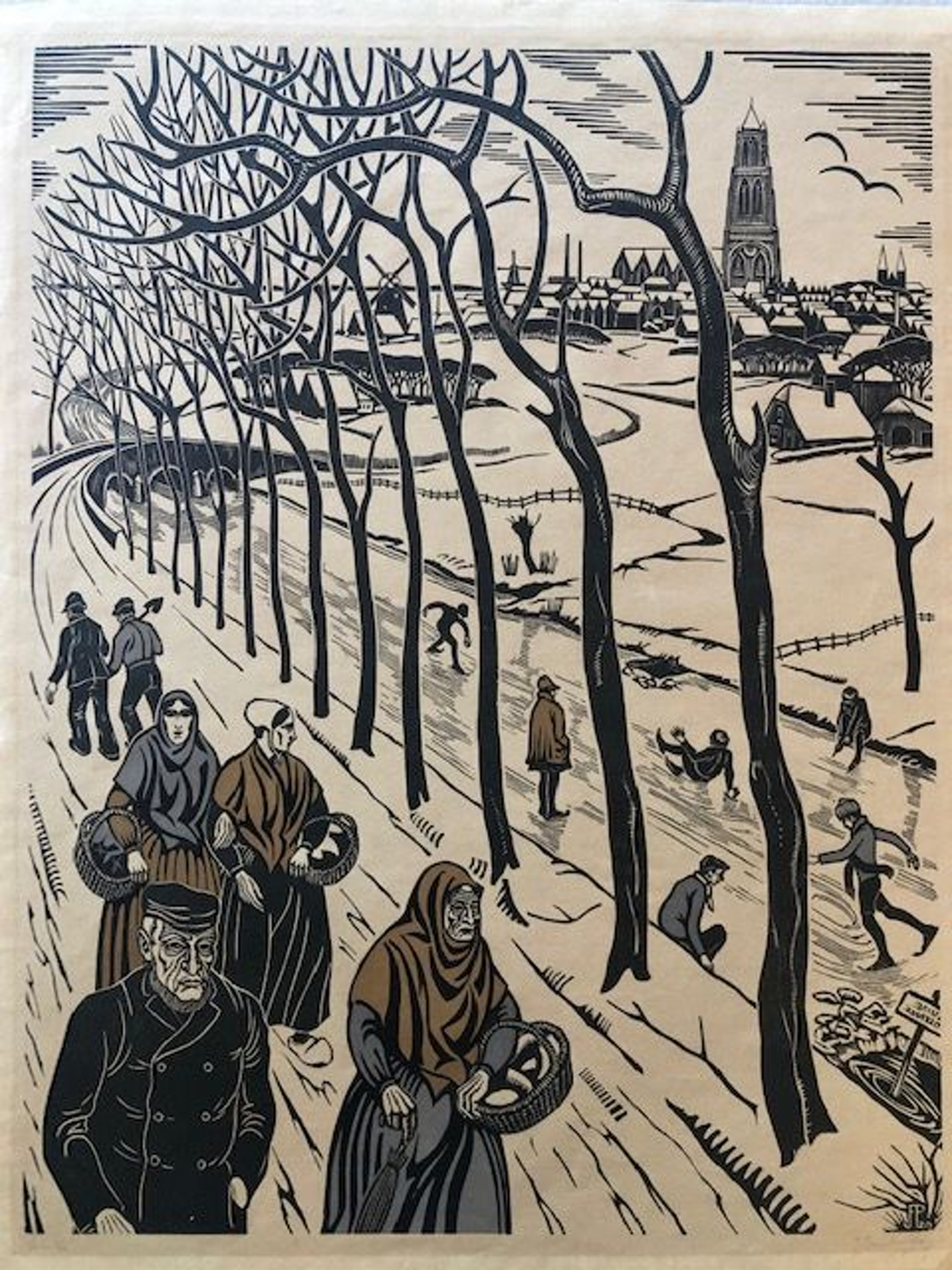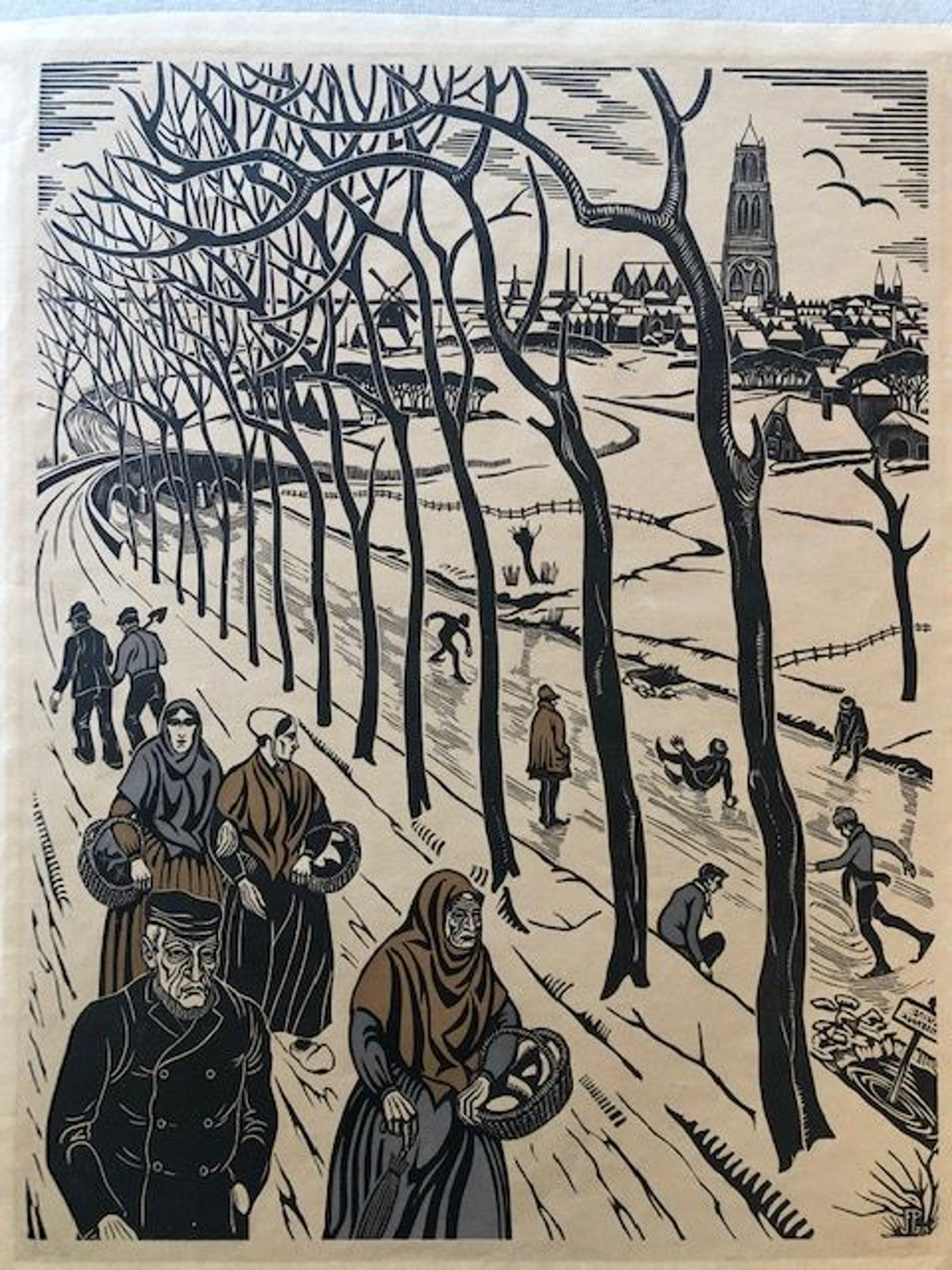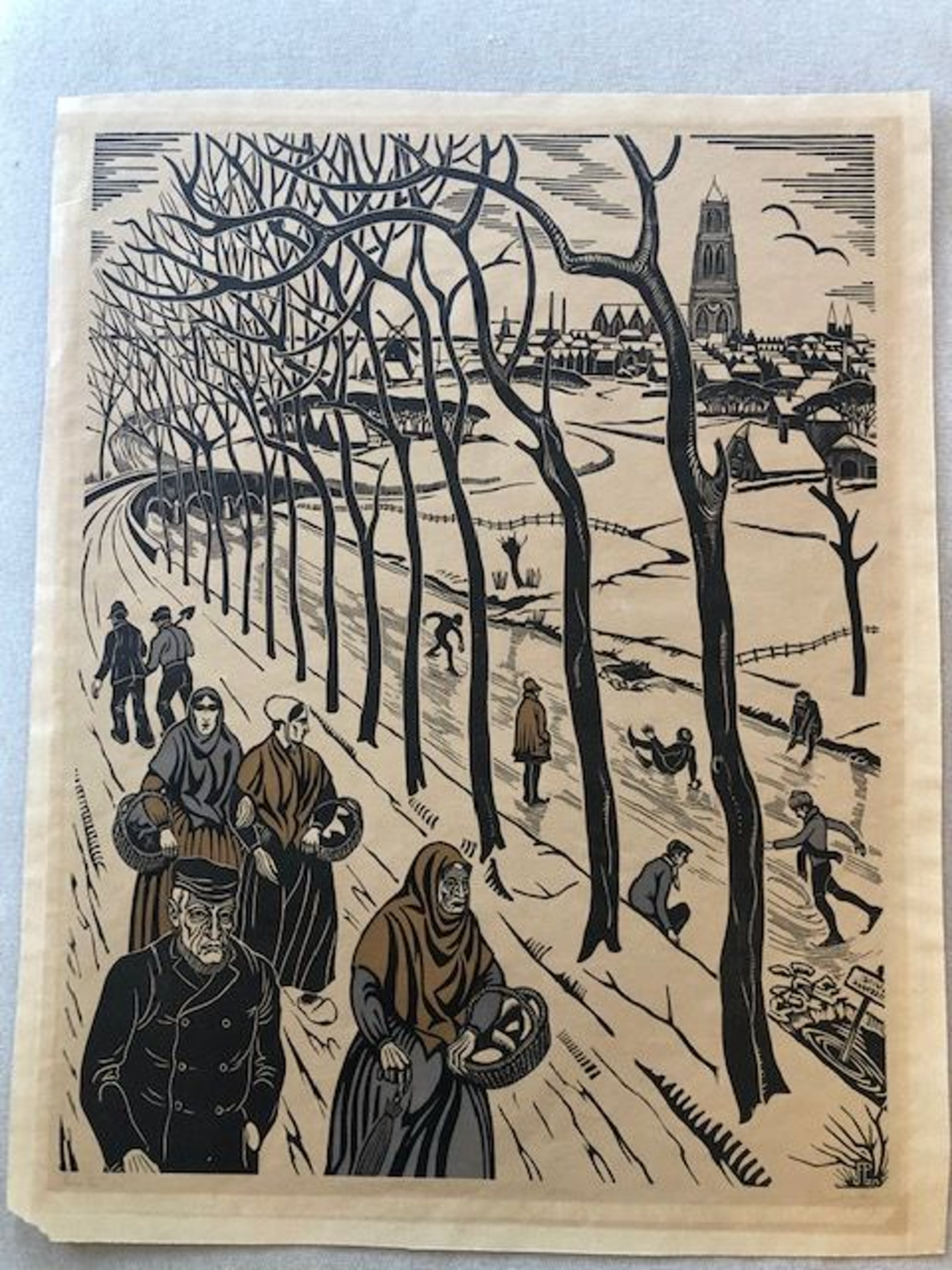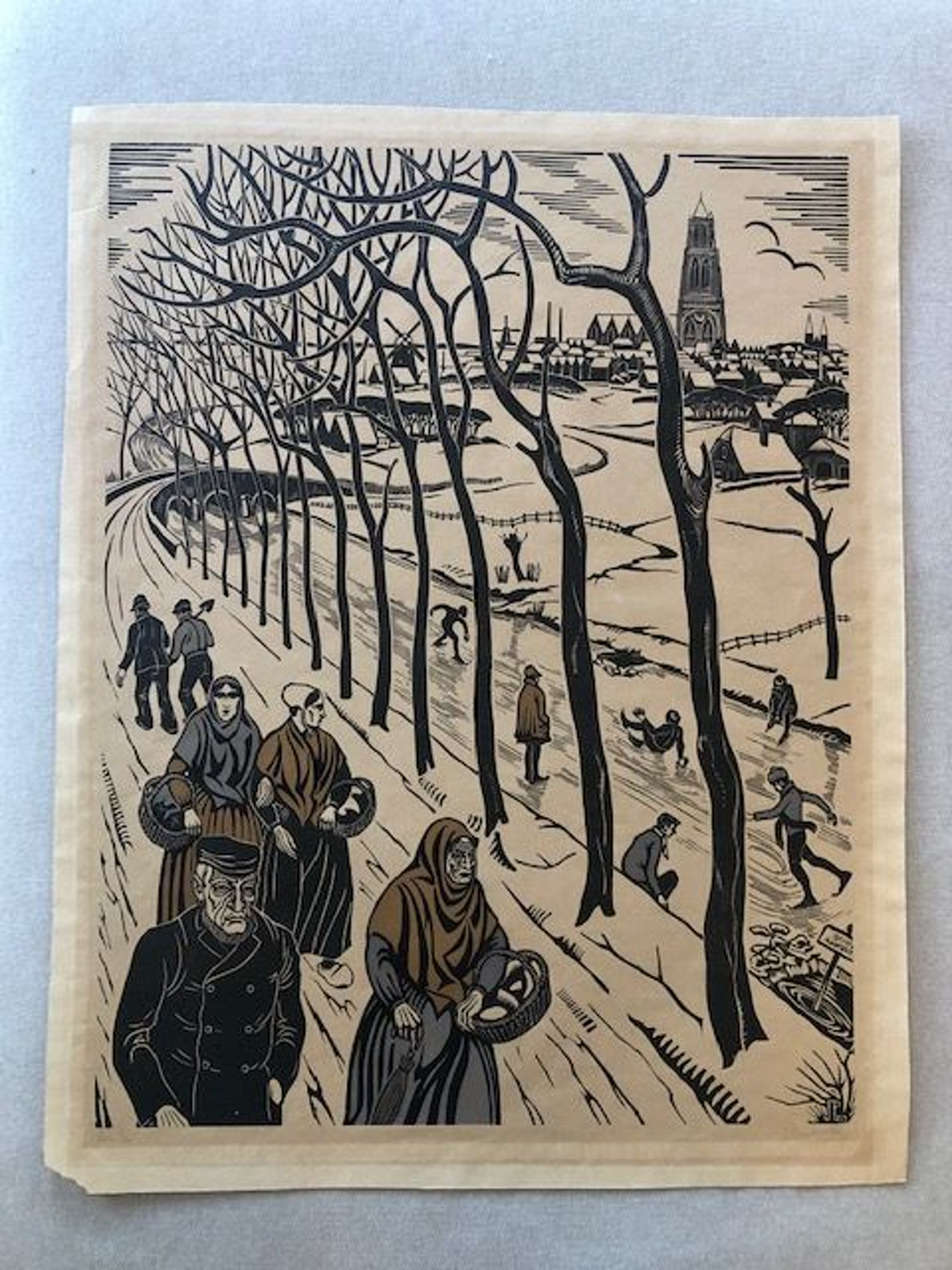 Joannes Petrus Josephus Pzn. FRANKEN (1896-1977)Joannes Petrus Josephus (Jan) Franken Pzn. werd op 18 november 1896 in den Haag geboren en overleed op 27 februari 1977.Hij genoot zijn opleiding aan de Koninklijke Academie van Beeldende Kunsten in Den Haag. J.Franken was schilder van winterlandschappen, portretten en stillevens. Hij woonde en werkte in Den Haag. De figuratieve stijl die hem bij zijn opleiding was onderwezen bleef kenmerkend voor zijn stijl.Naast tekeningen en schilderijen maakte hij ook houtsneden, boekillustraties, boekbandontwerpen en ex-libris. Hij was lid van Pulchri Studio,Afmeting beeldmaat 39 x 51 cm Afmeting totaal 43 x 54 cm Titel : Winter Gesigneerd met potlood Verder in goede staat