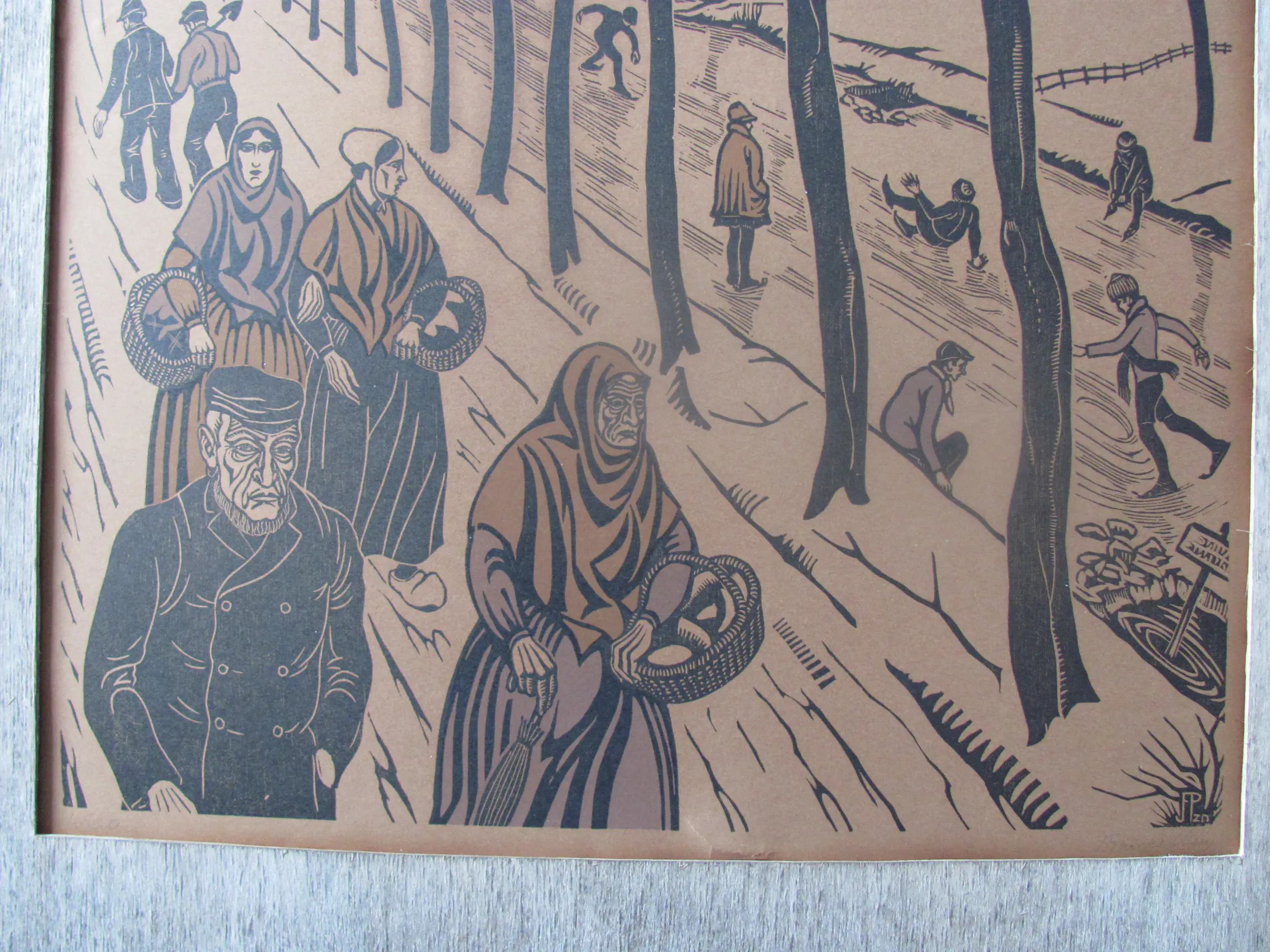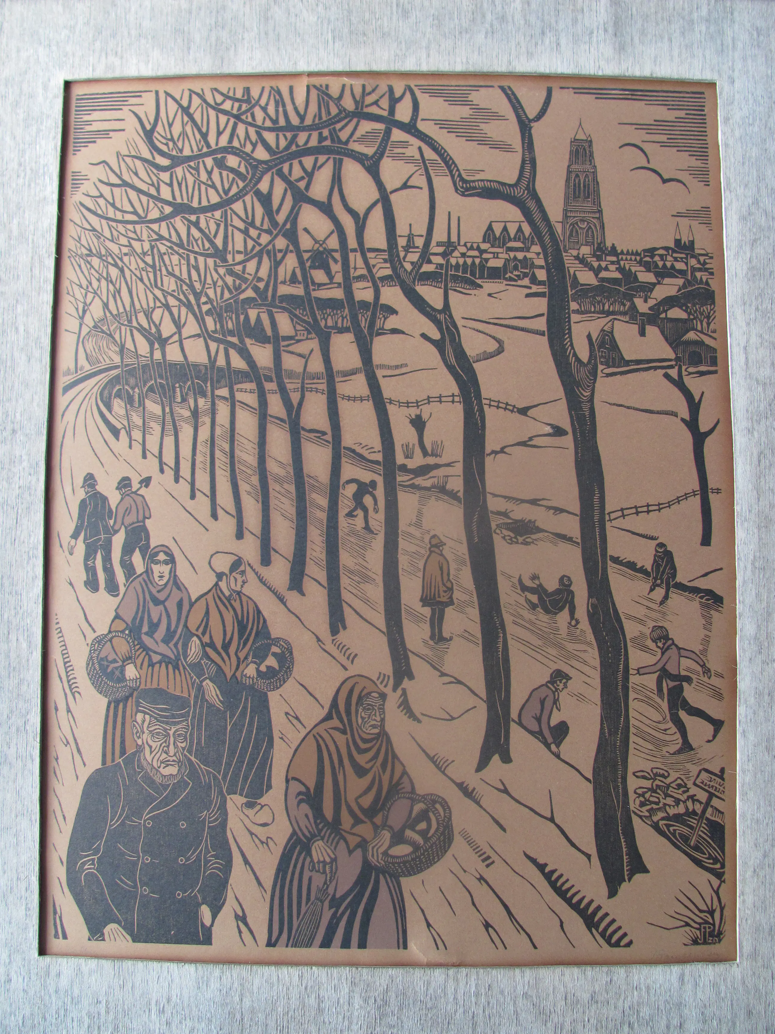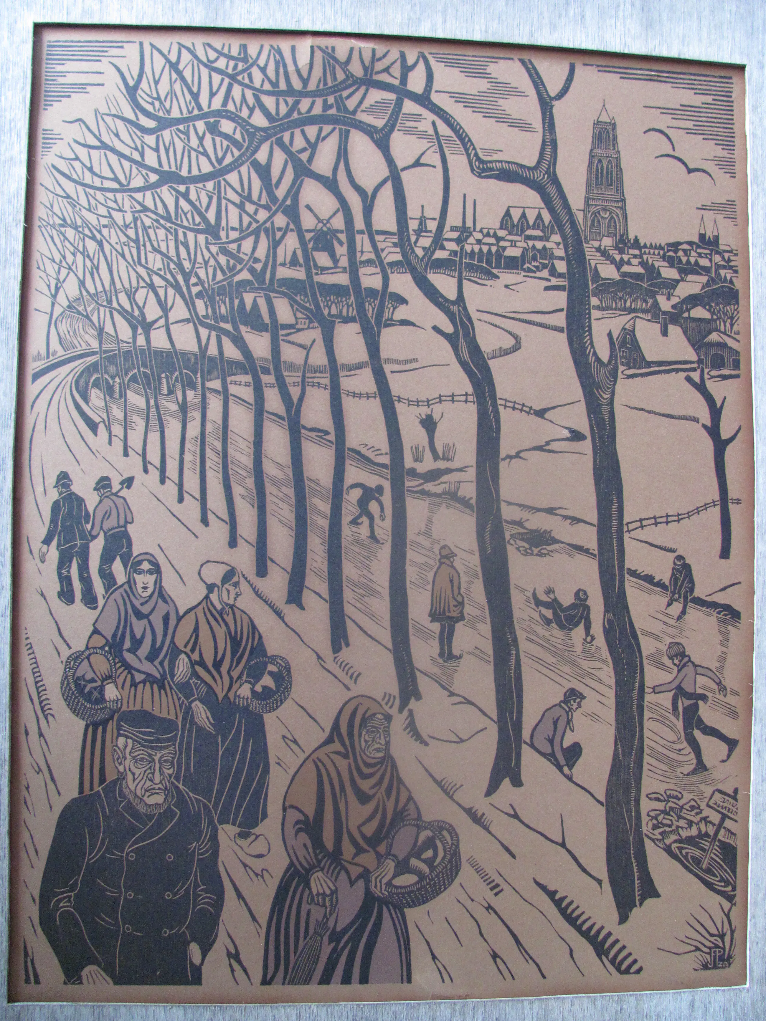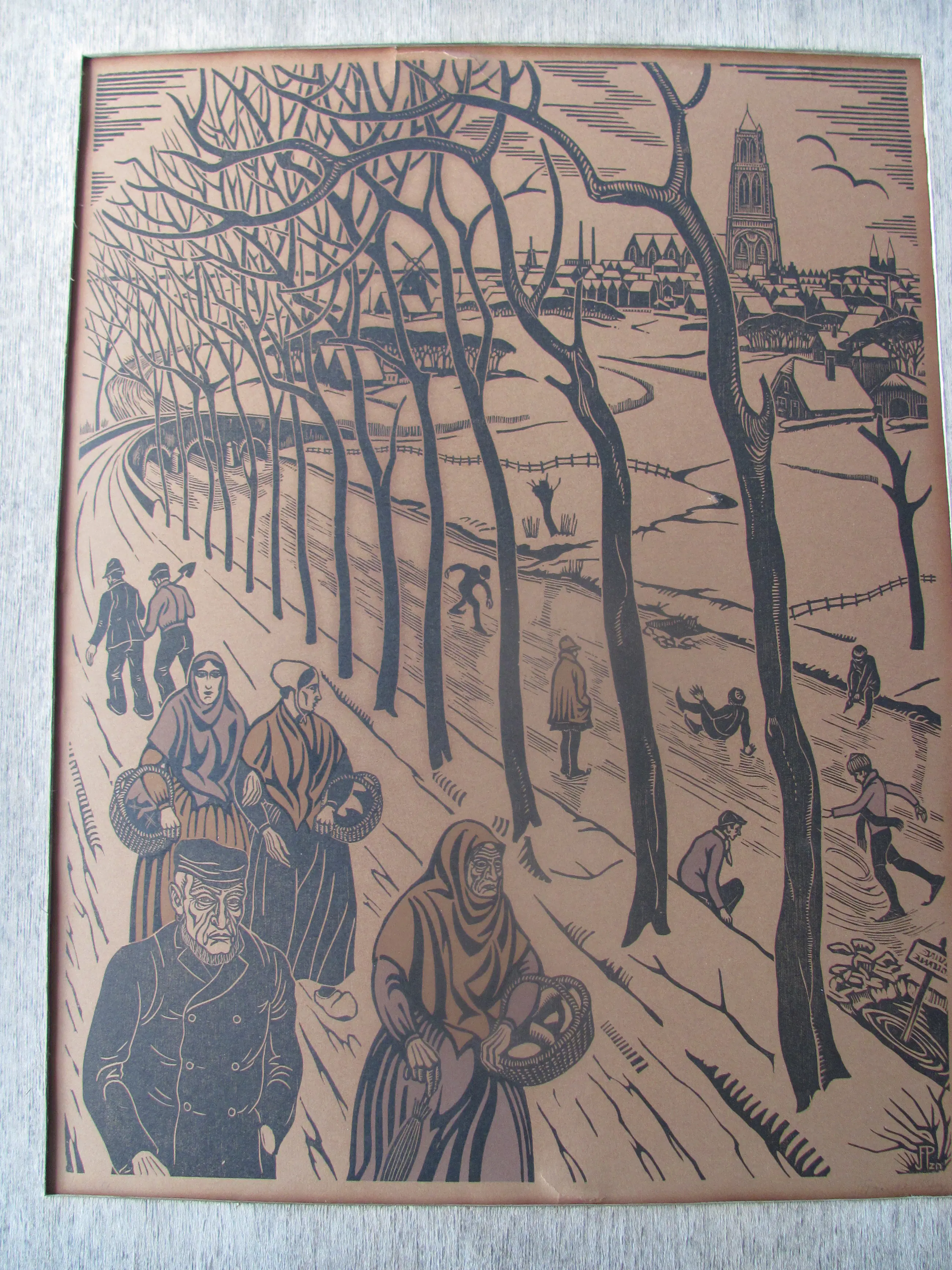 Houtsnede "Winter" van Jan Pzn Franken. Linksonder getiteld: Winter Rechtsonder met potlood gesigneerd en in de plaat met monogram .