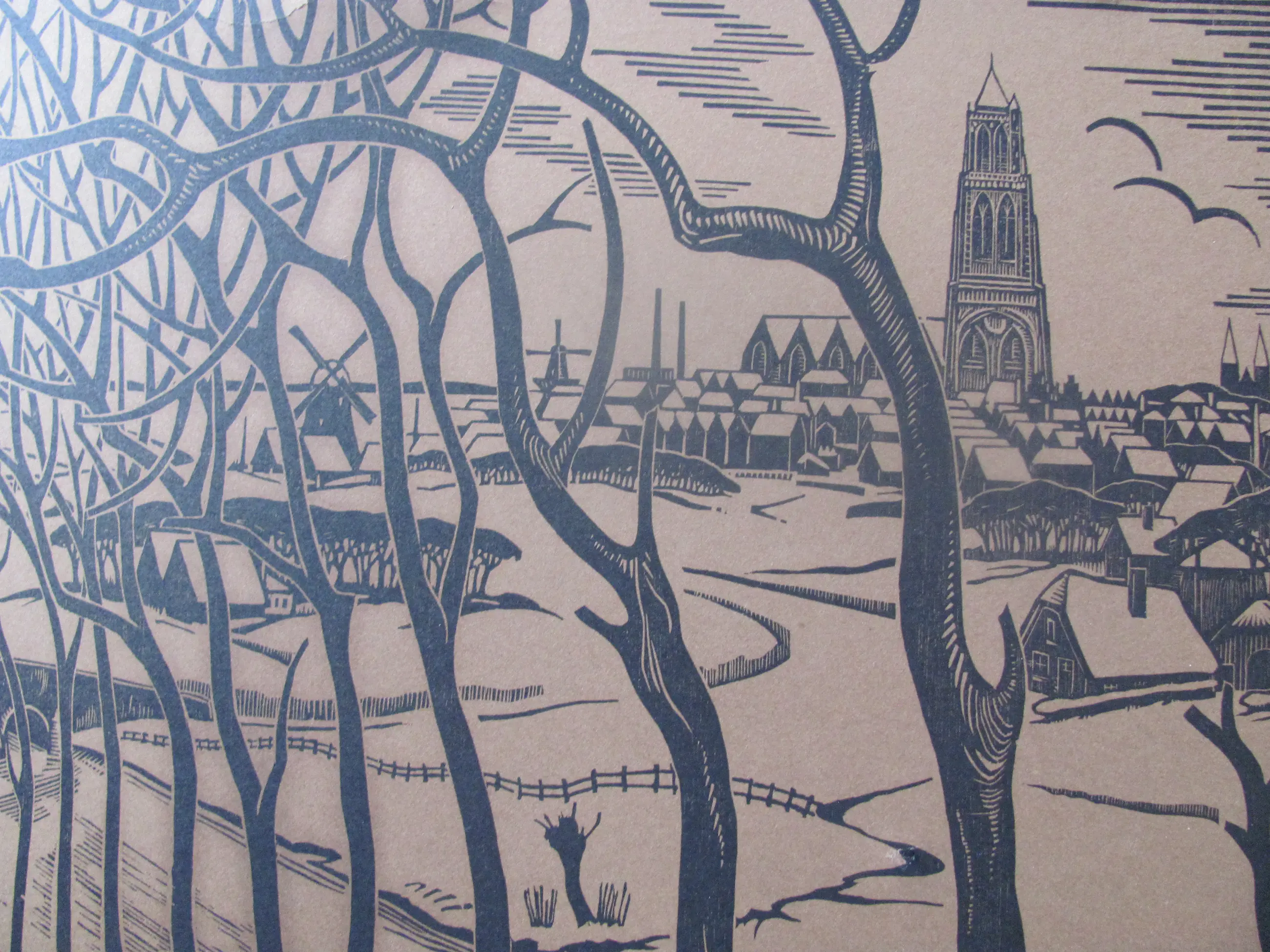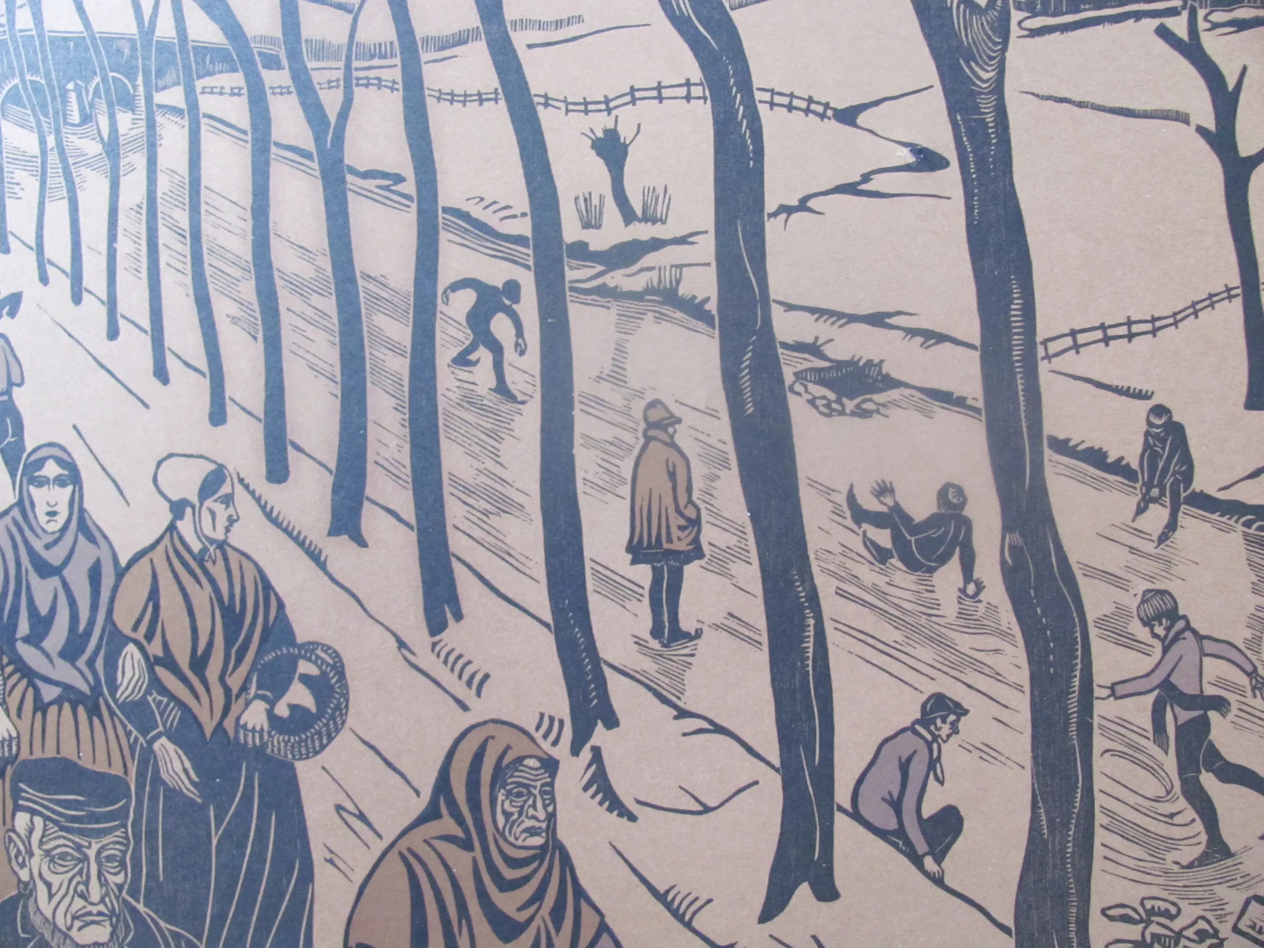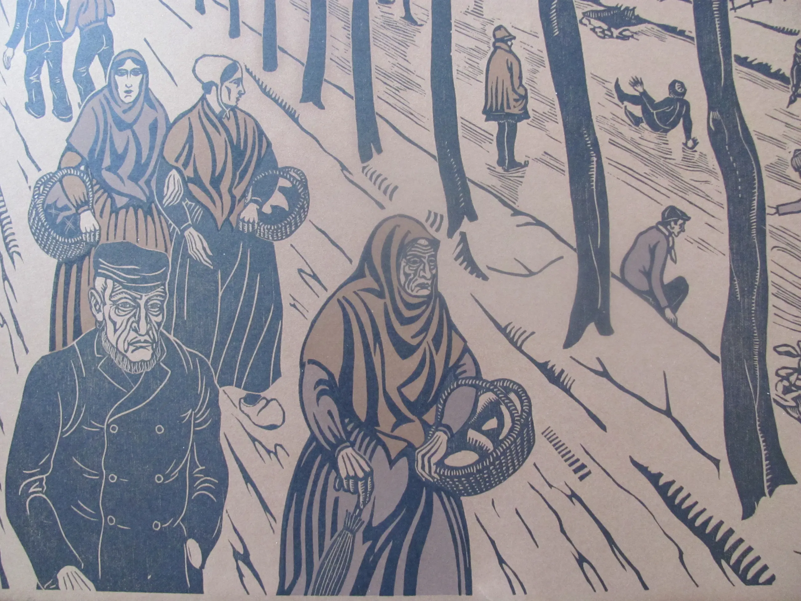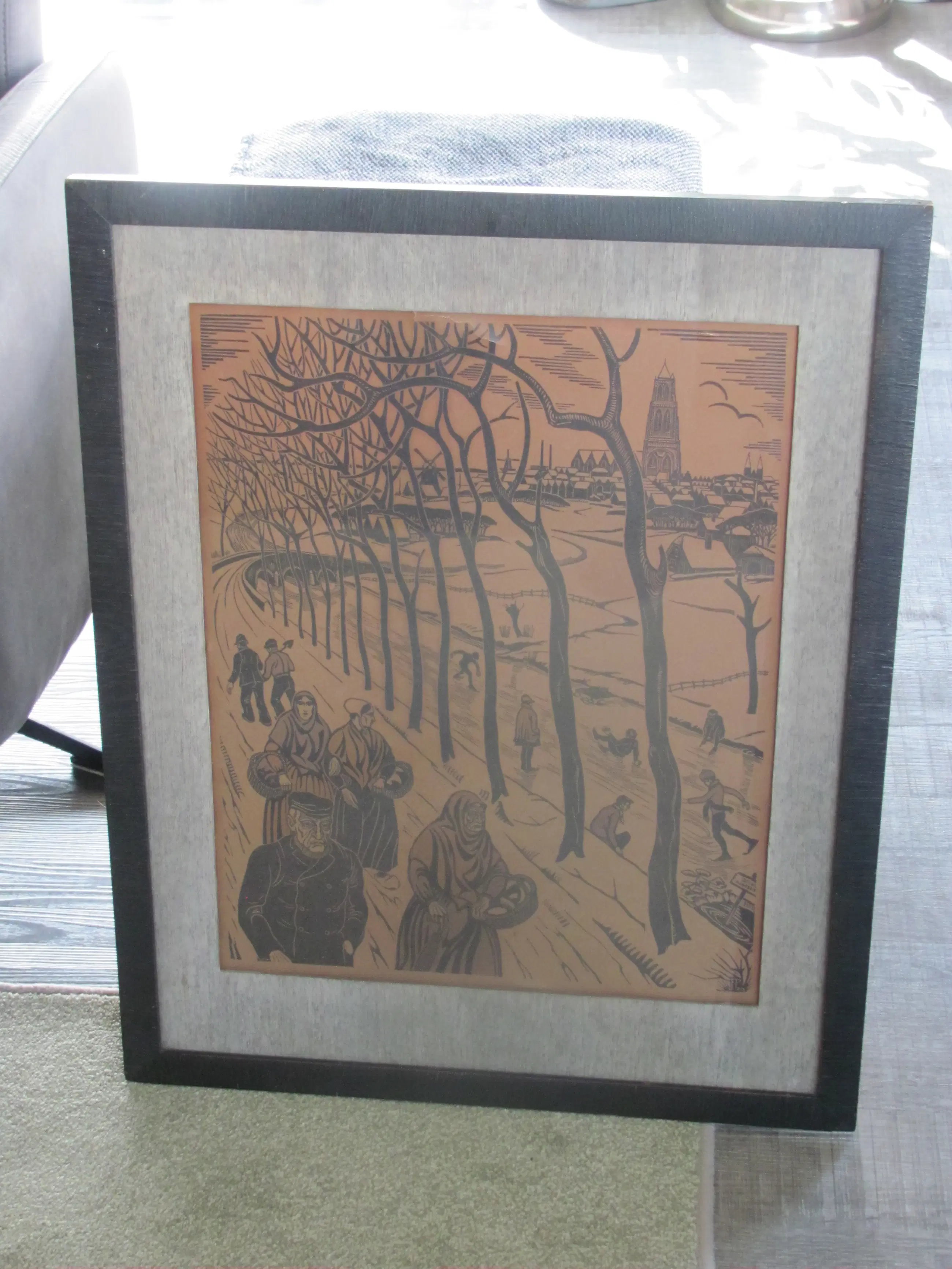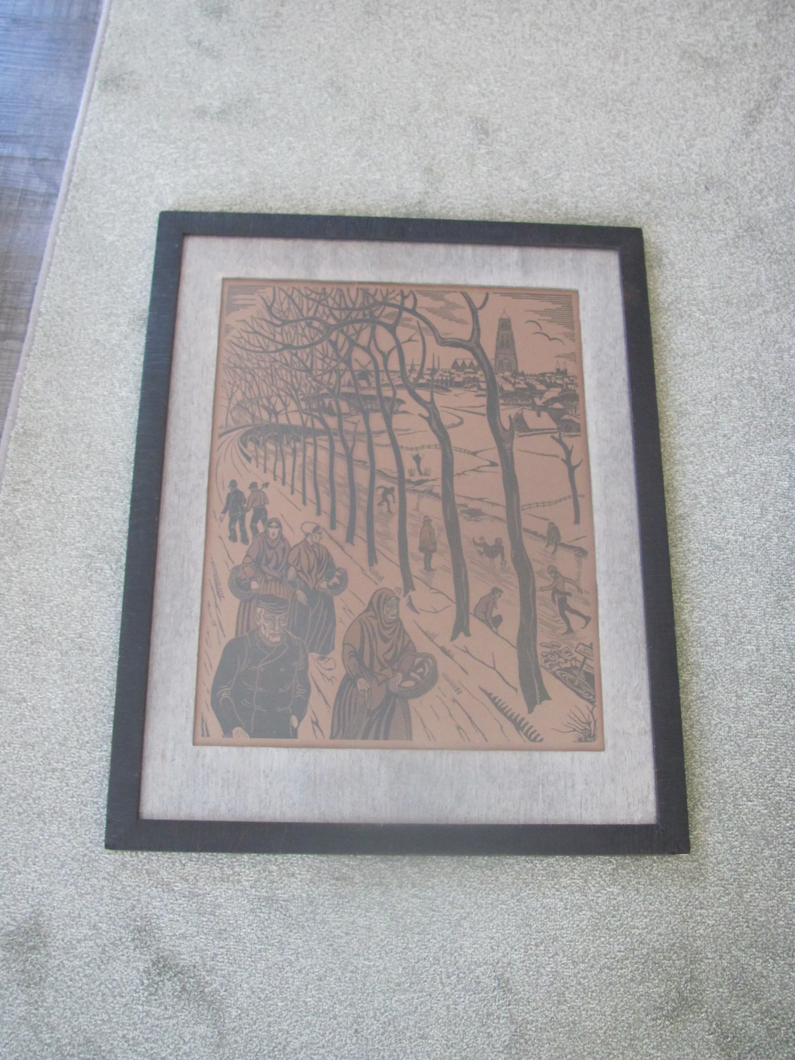 Houtsnede "Winter" van Jan Pzn Franken. Linksonder getiteld: Winter Rechtsonder met potlood gesigneerd en in de plaat met monogram .