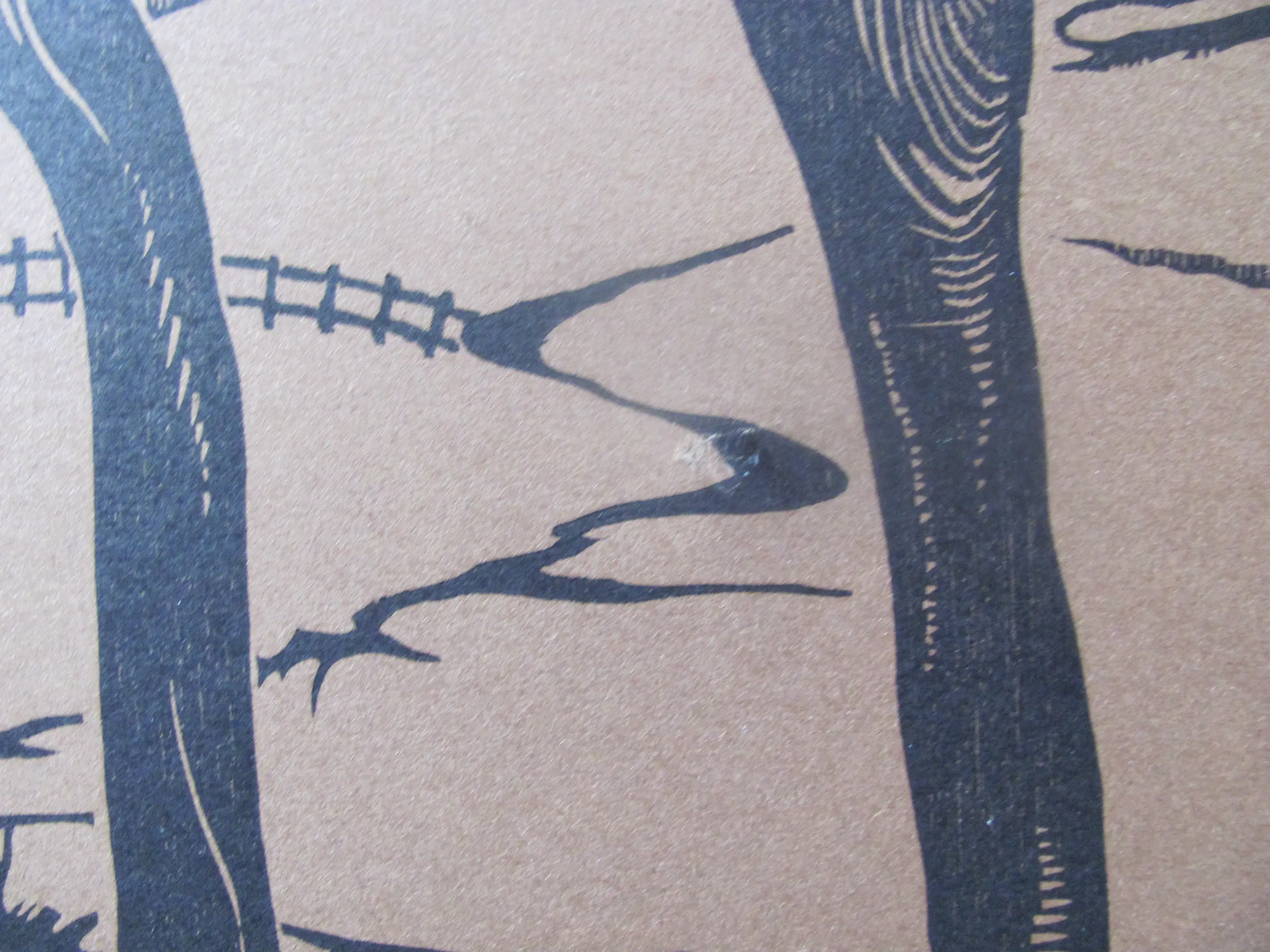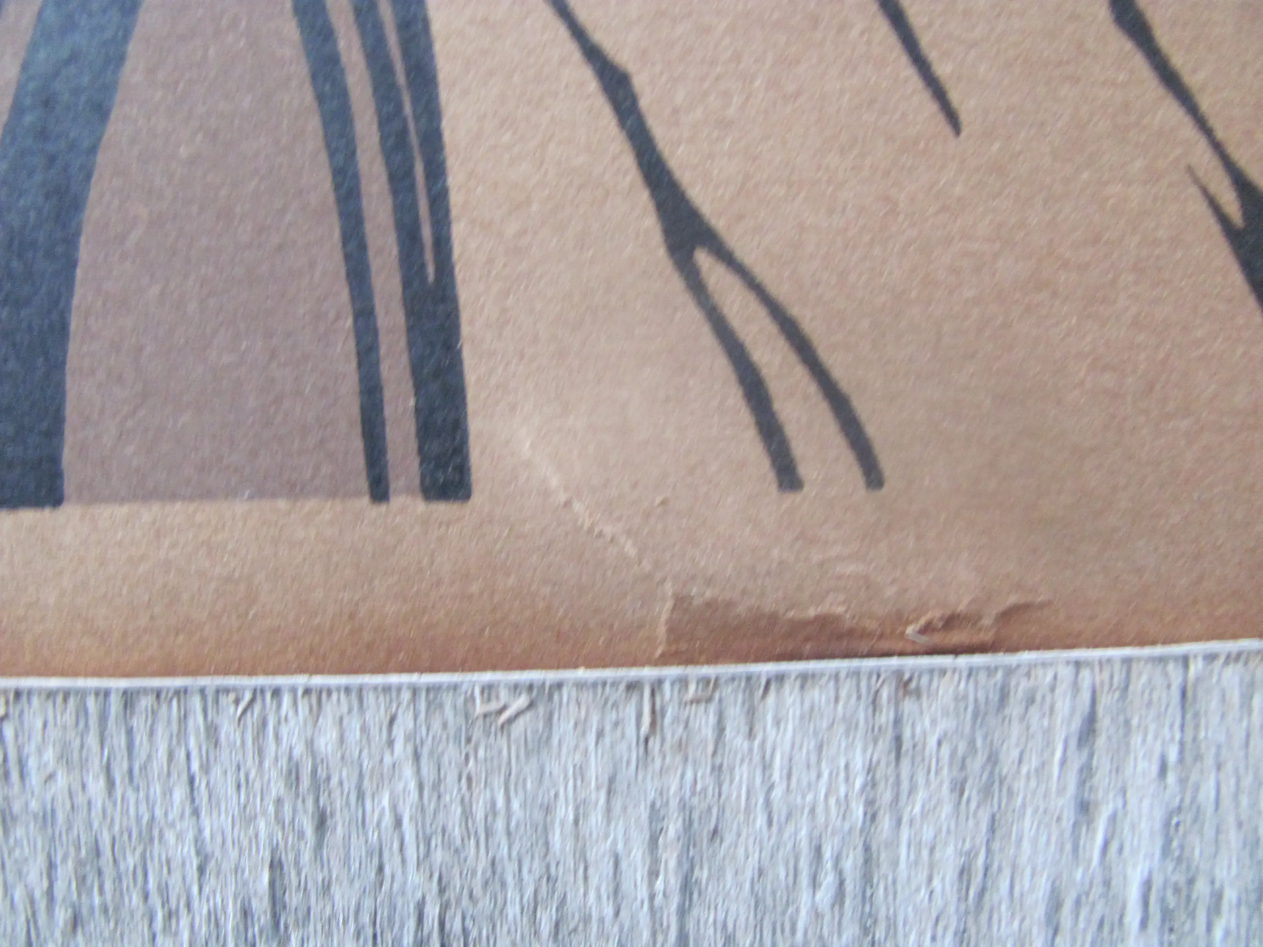 De houtsnede is in redelijke staat. Het papier is in de loop der jaren bruin gekleurd en het vertoonde wat scheurtjes (met name aan de boven- en onderzijde ter hoogte van de passe-partoutranden). Aan de achterzijde is dit geplakt.