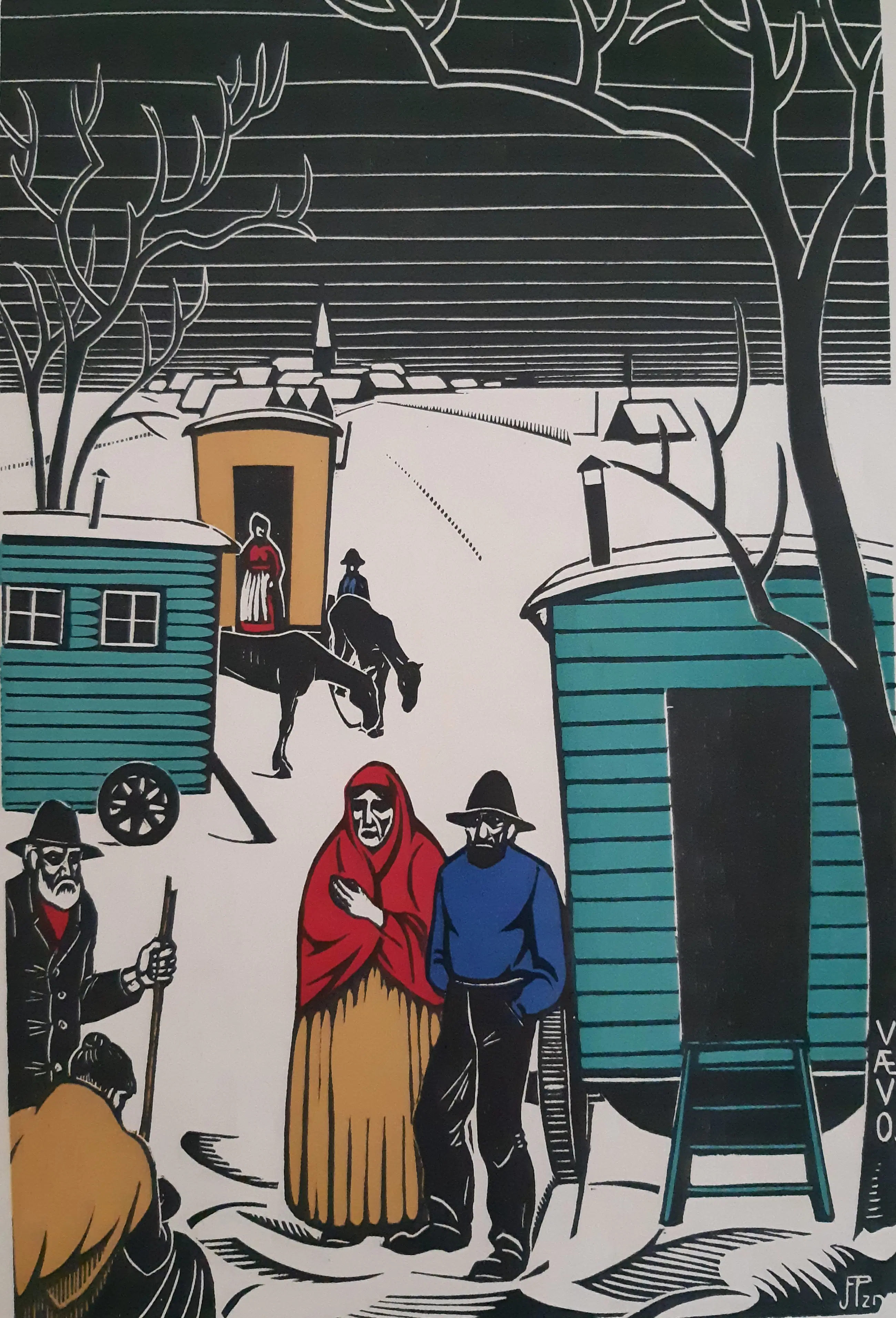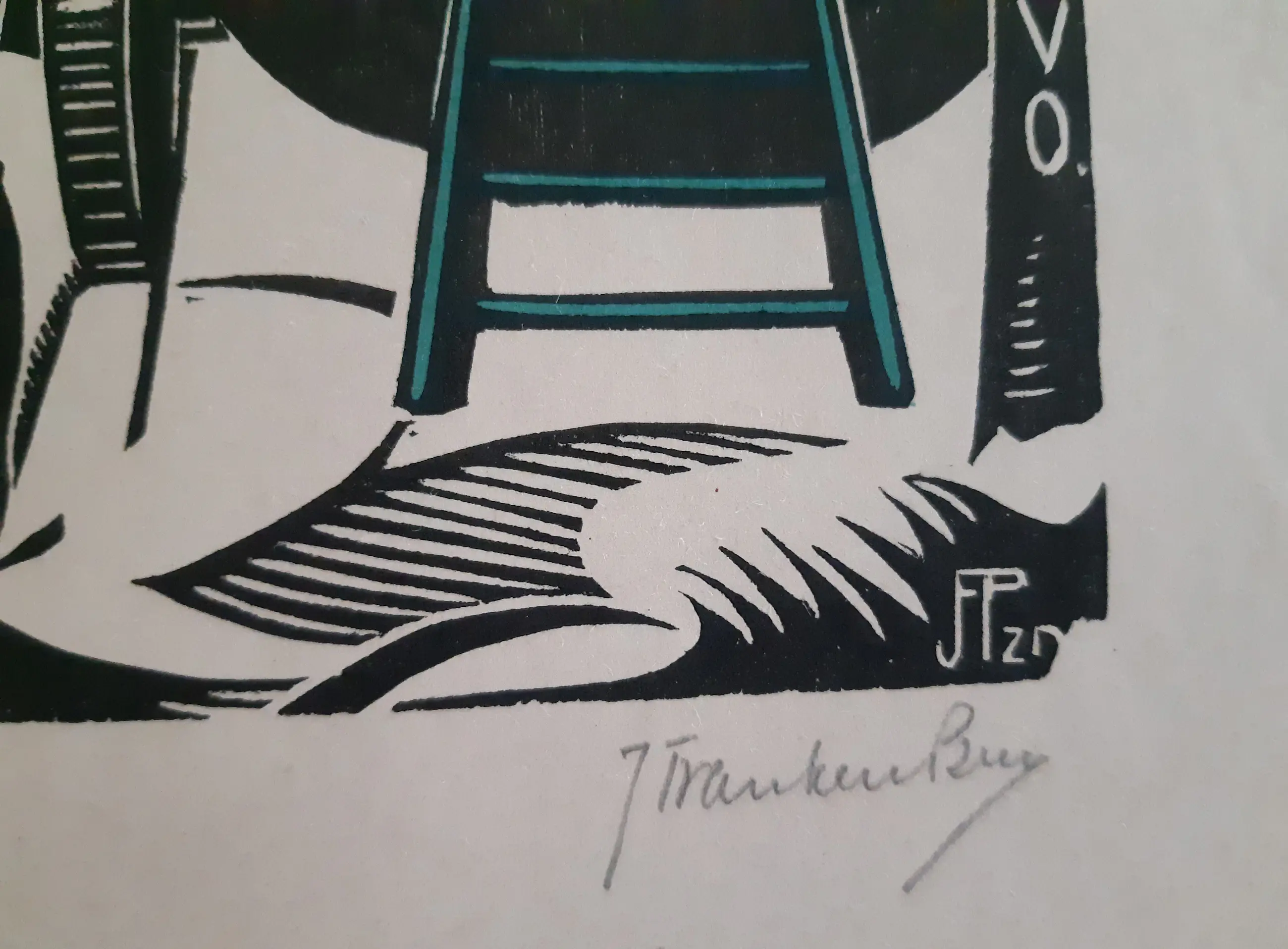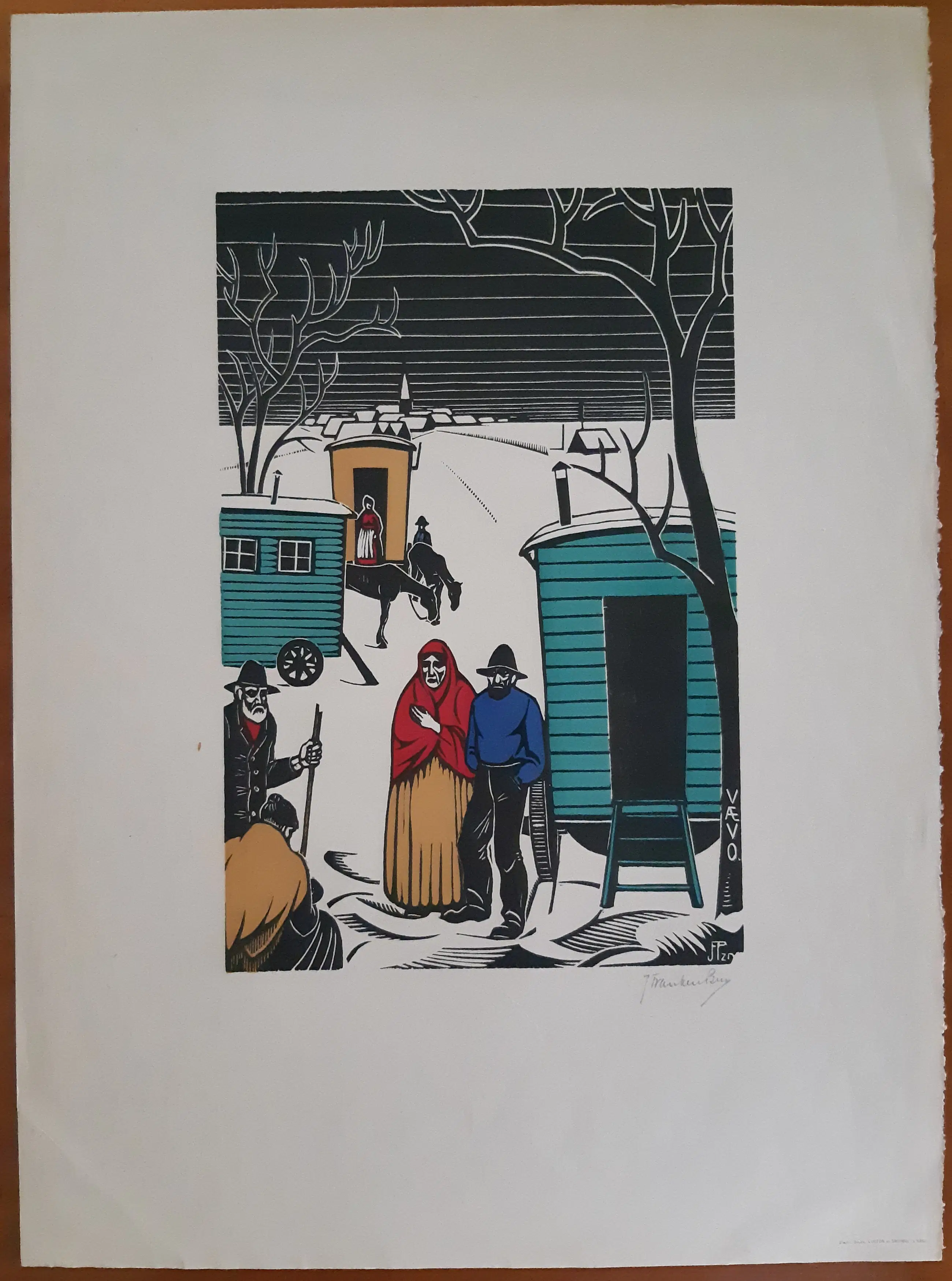 Titeloze houtsnede van Jan Pzn Franken. Rechtsonder met potlood gesigneerd, tevens monogram en aanduiding VAEVO. Afgedrukt op beige papier. De afbeelding meet 27 x 18 cm. De conditie is zeer goed, niet ingelijst geweest, zeer lichte kreuk in blad linksonder, ver buiten beeld (zie foto).