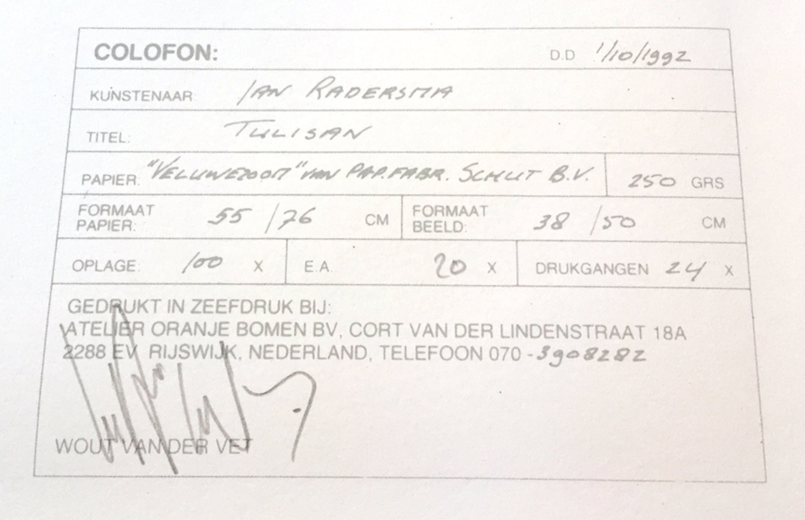 Zeefdruk is door meesterzeefdrukker Wout van der Vet met de hand gedrukt op geschept papier en genummerd en gesigneerd met potlood door de kunstenaar.