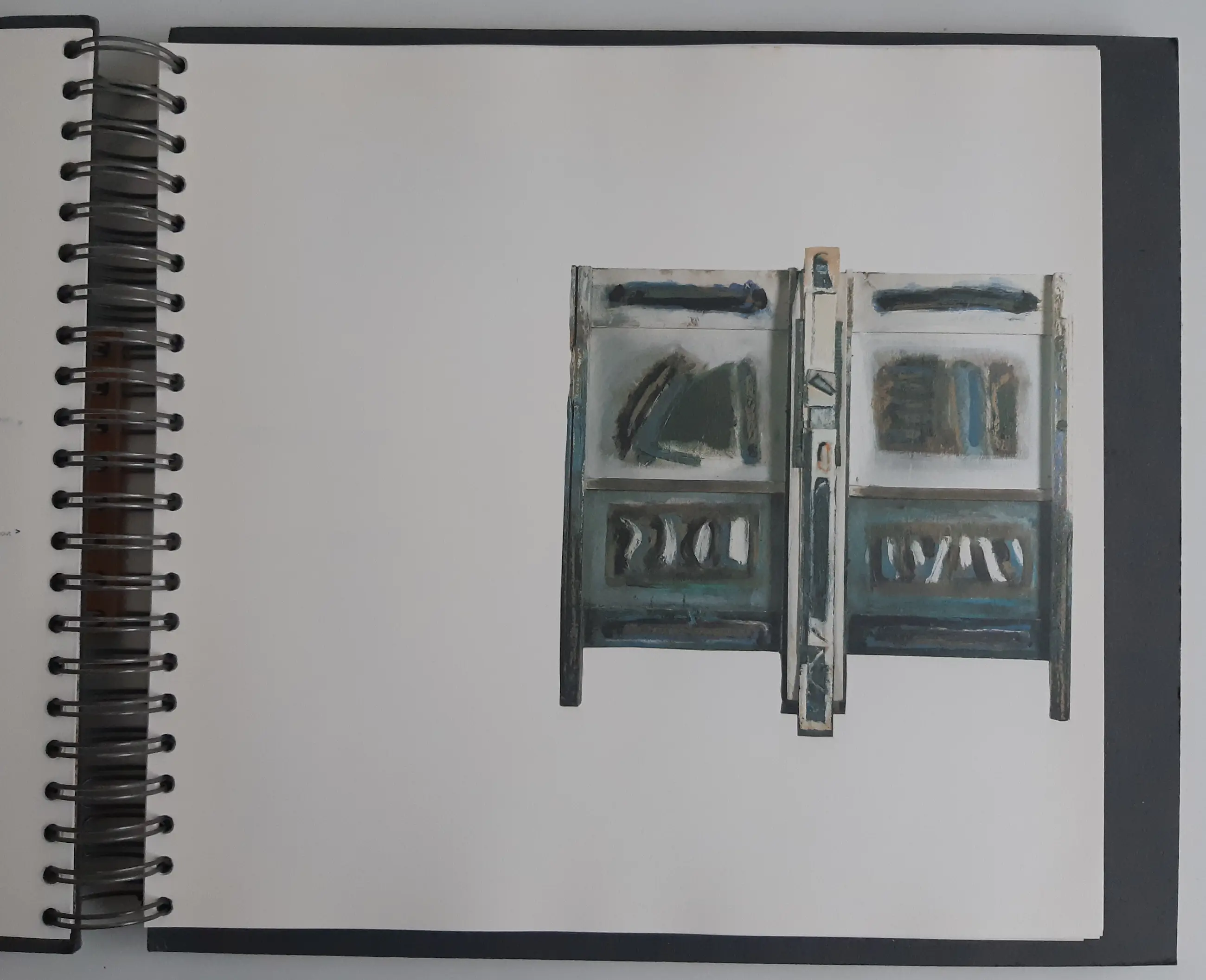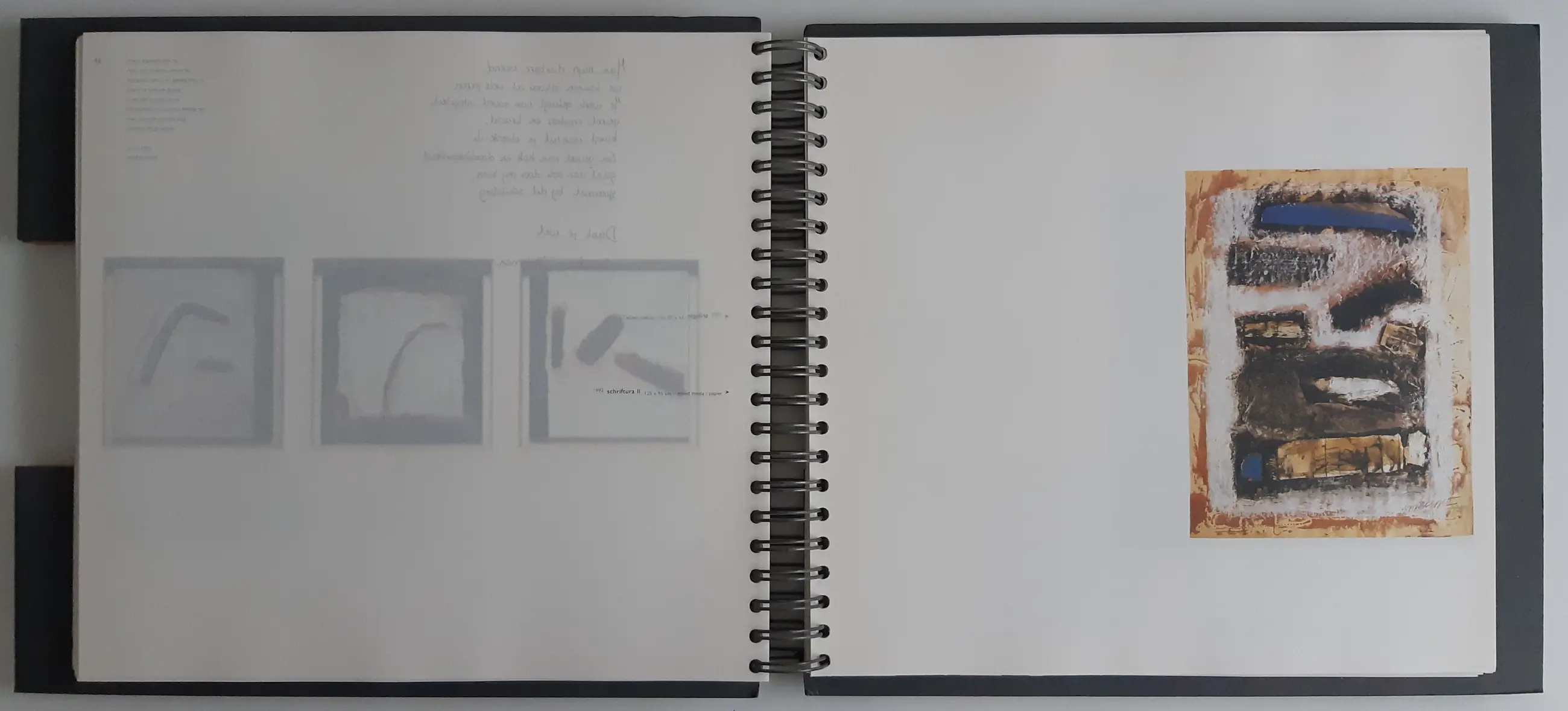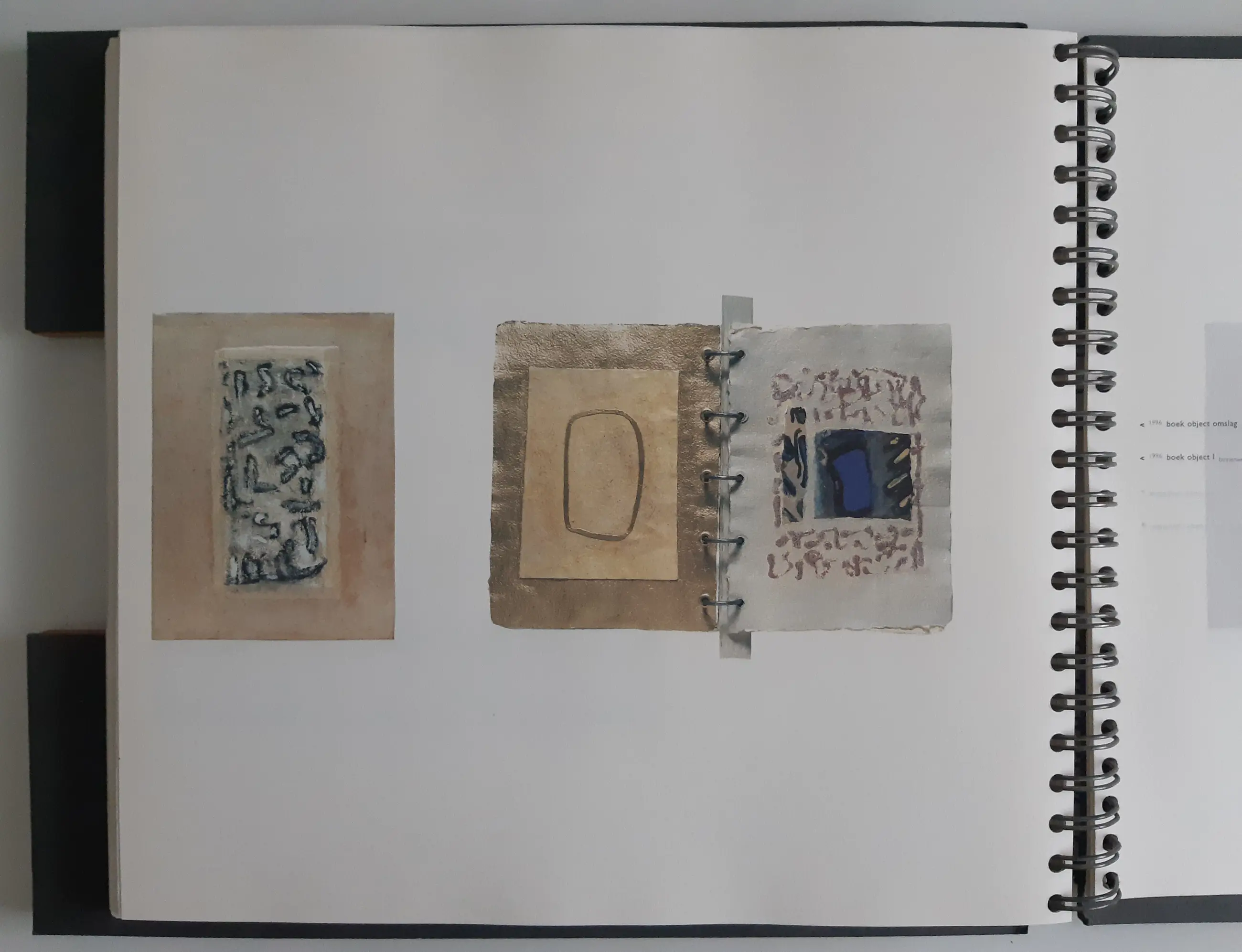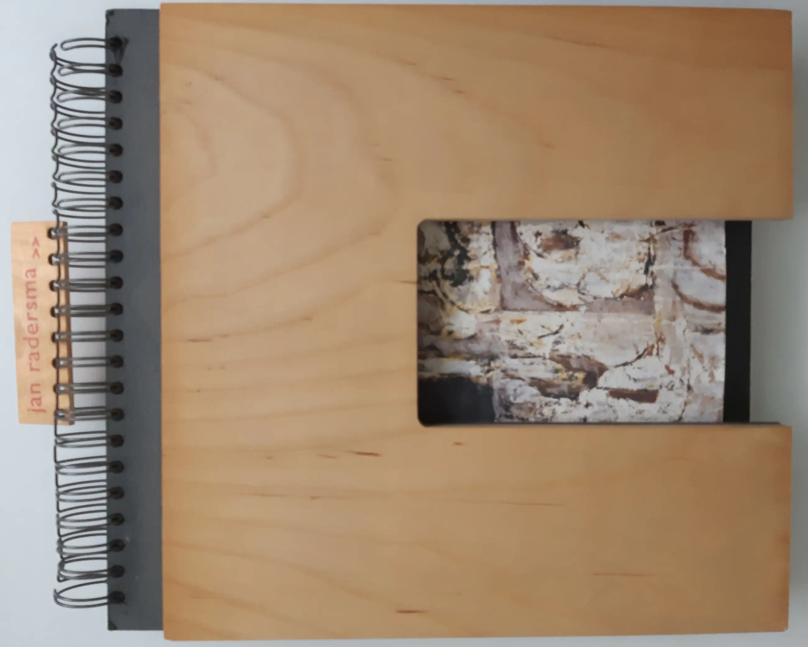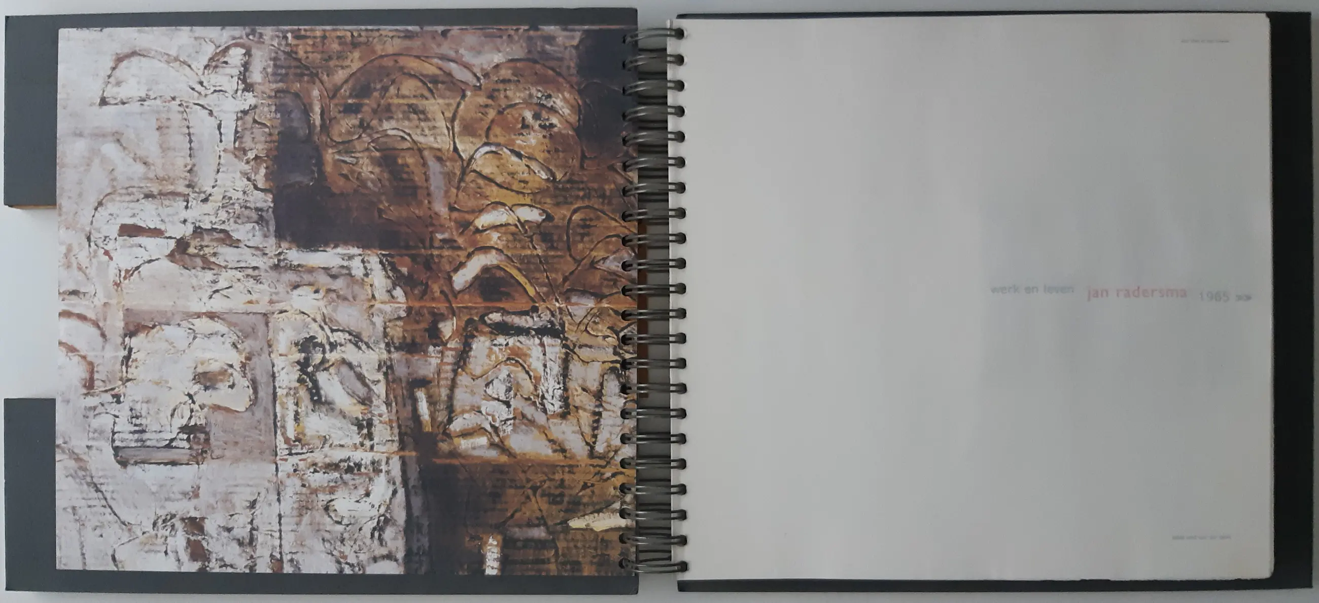 Bijzonder vormgegeven boek: grote ringband, houten platten, verschillende soorten papier. Aan de ringband een houten tab met de naam van de kunstenaar. Rijk geïllustreerd in kleur. De tekst is van Wim van der Beek.